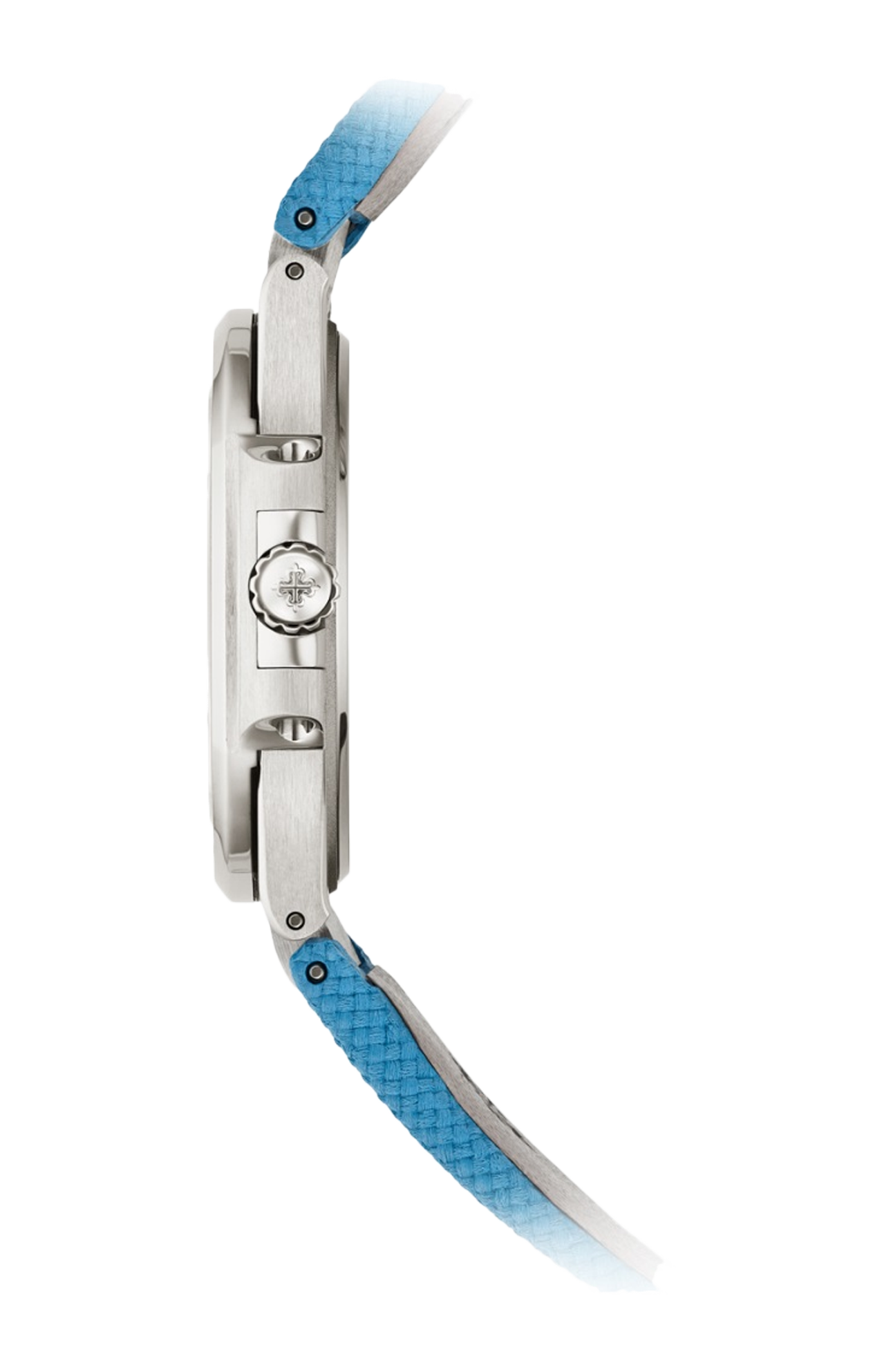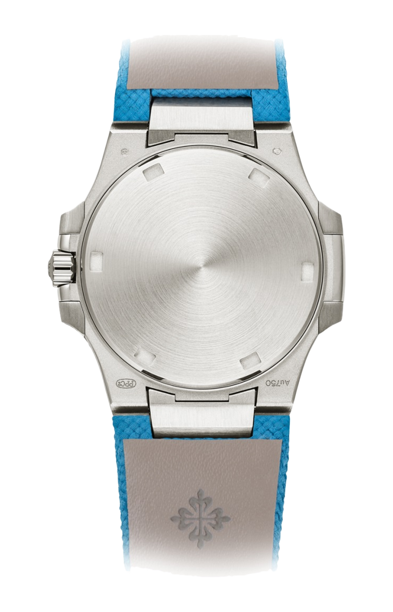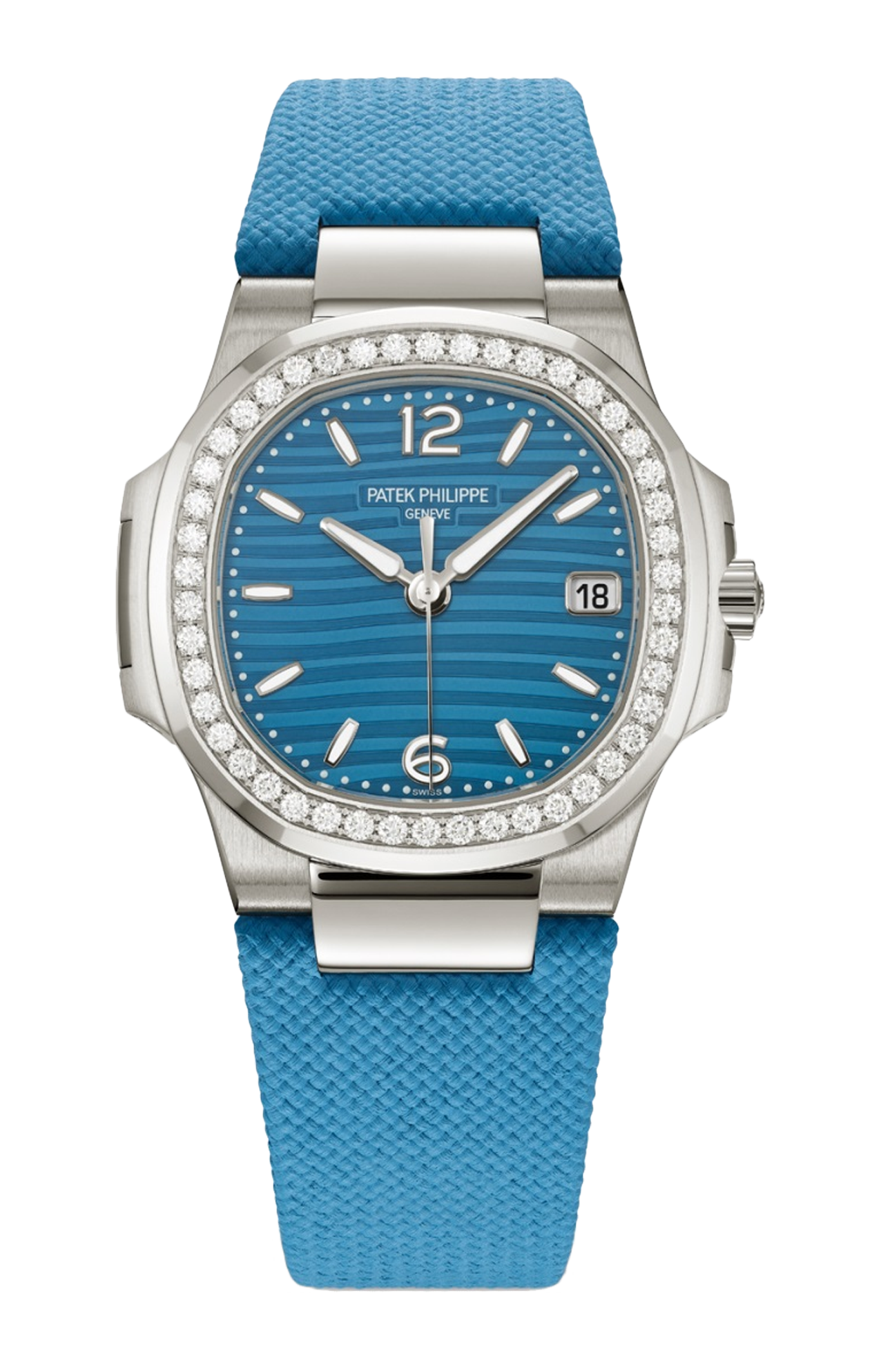 Patek Philippe punta sul colore in una nuova versione del Nautilus per signora con movimento al quarzo e cassa di 32 mm di diametro in oro bianco. Il quadrante ornato dal tipico motivo a onde della collezione Ladies Nautilus per signora è splendidamente ammantato da un elegante punto di azzurro laccato. Questa nuance originale e raffinata si ritrova anche sul cinturino in materiale composito ultraresistente con motivo tessile e fibbia déployante Nautilus in oro bianco. La lunetta ottagonale è illuminata da 46 diamanti taglio brillante (0,8 ct) incastonati a regola d’arte.