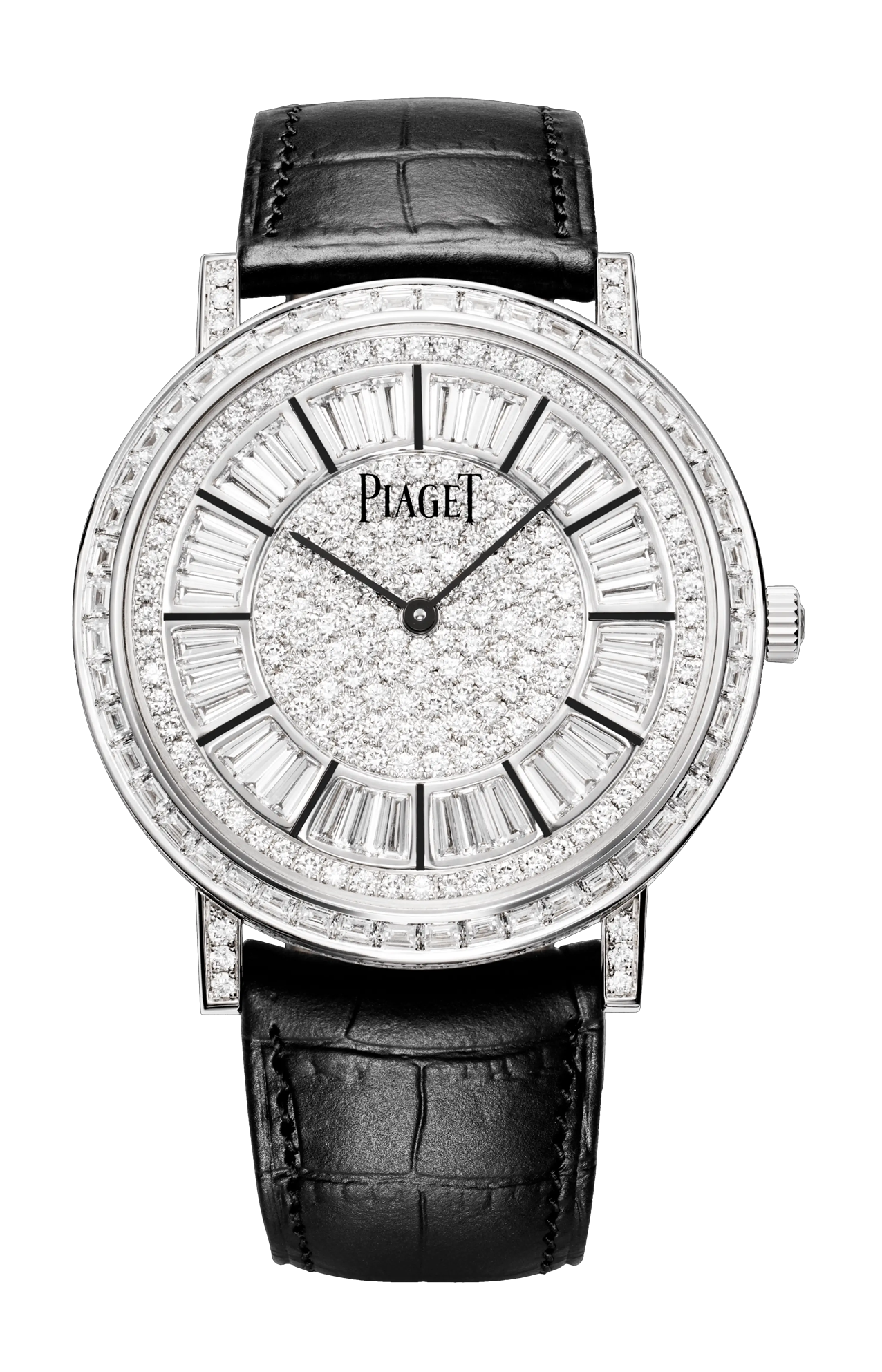 Orologio Altiplano Alta Gioielleria, 41 mm. Cassa in oro bianco 18 carati con 313 diamanti taglio brillante (circa 1,7 ct) e 48 diamanti taglio baguette (circa 2,5 ct). Quadrante con 155 diamanti taglio brillante (circa 1,8 ct) e 36 diamanti taglio baguette (circa 3 carati). Corona con diamante taglio brillante (circa 0,06 ct). Fibbia con 24 diamanti taglio brillante (circa 0,06 ct). Fondello in vetro zaffiro. Movimento meccanico a carica automatica ultrapiatto di manifattura 1200P (spessore 2,35 mm).