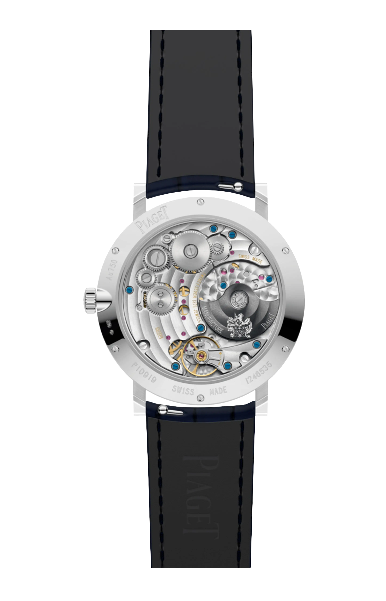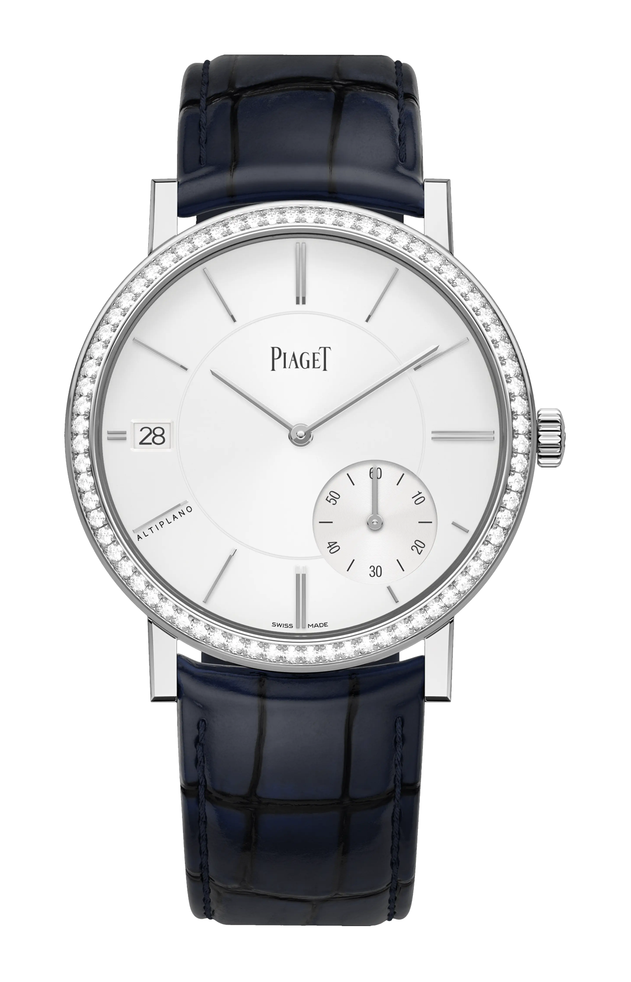 Orologio Altiplano Origin, 40 mm. Cassa in oro bianco 18 carati incastonata con 72 diamanti taglio brillante (circa 1,00 ct). Quadrante con indici delle ore in oro rodiato. Fondello in vetro zaffiro. Cinturino intercambiabile. Movimento meccanico a carica automatica ultrapiatto di manifattura 1205P1 (spessore 3 mm), con piccoli secondi e data.