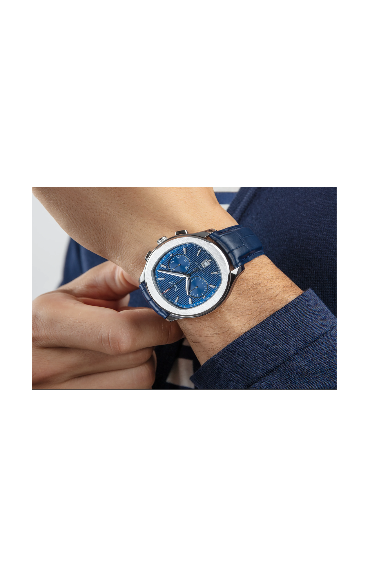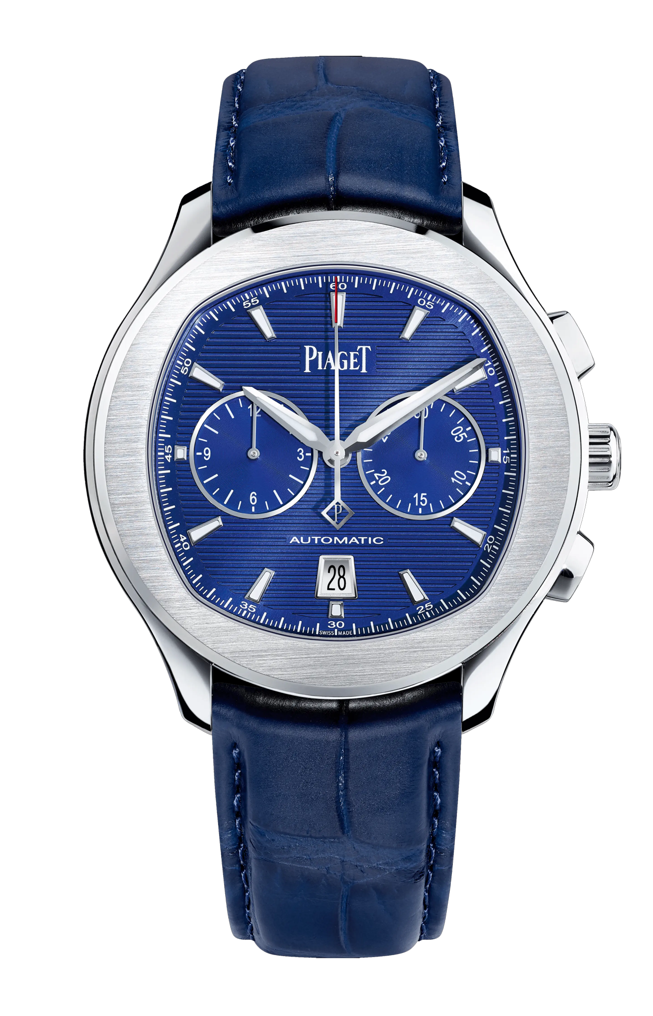 Orologio cronografo da uomo in acciaio. Quadrante blu. Cinturino in alligatore blu. Questo cronografo da uomo è l'espressione di un'eleganza rilassata, perfetto per ogni occasione. Coronata da una lunetta satinata e lucida, la sua cassa in acciaio da 42 mm di diametro è impermeabile fino a 10 ATM e combina forme rotonde e coussin nella pura tradizione estetica di Piaget. Il quadrante blu strutturato attraversato da linee orizzontali, con indici delle ore luminescenti applicati, lancette dauphine, lancetta trotteuse con punta rossa e una P traforata, mostra ore, minuti e secondi al centro, un cronografo e la data a ore 6. Il suo fondello in vetro zaffiro rivela le finiture del movimento a carica automatica di manifattura 1160P e la sua massa oscillante blu, decorata con lo stemma Piaget. Questo lussuoso orologio in acciaio è dotato di un cinturino in alligatore blu con fibbia pieghevole.