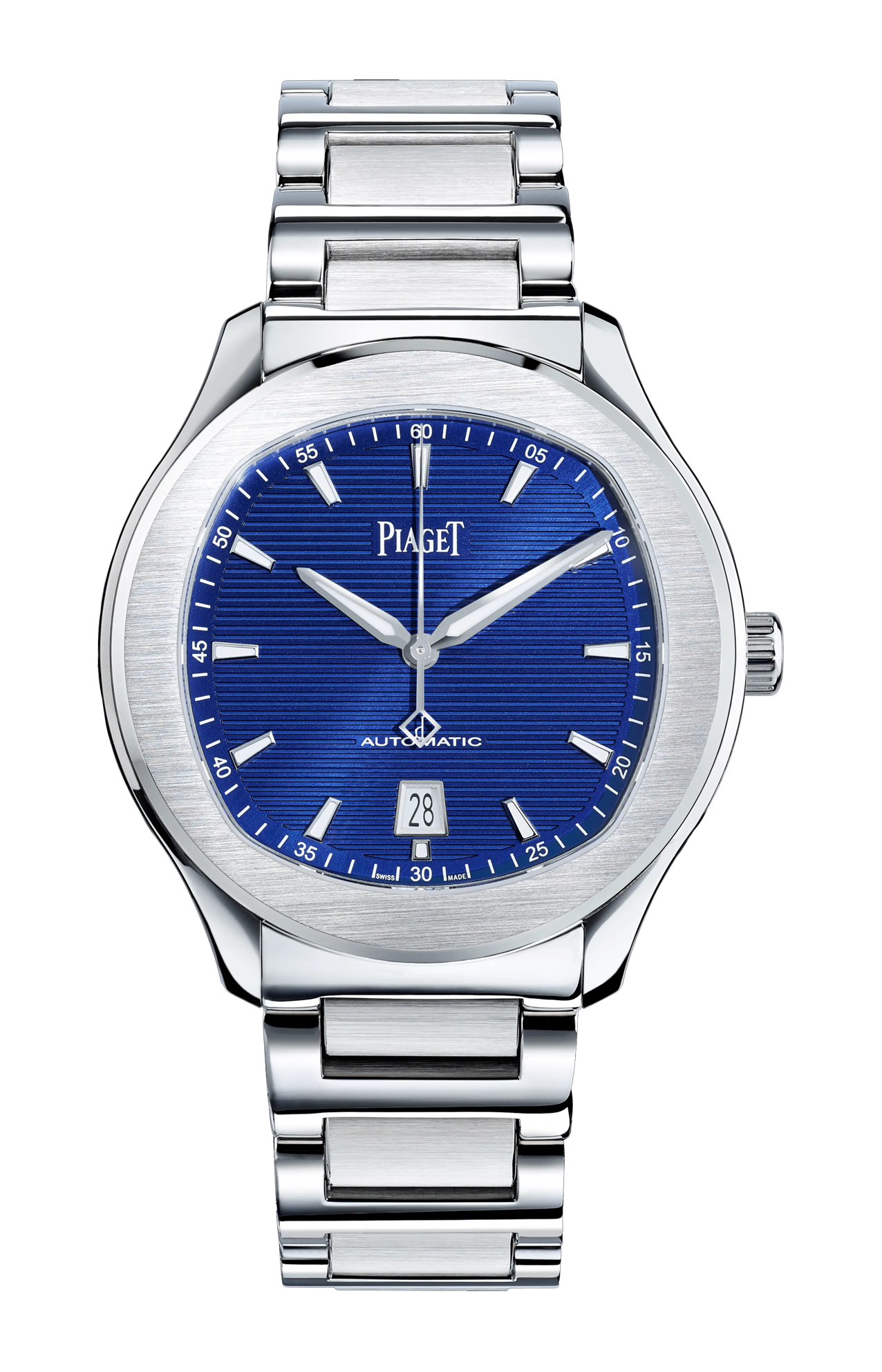 Un nuovo modello da uomo dal carattere deciso, questo orologio a carica automatica sfoggia un'eleganza casual, ideale per ogni occasione. Disponibile con bracciale in acciaio lucido e satinato, che si fonde perfettamente con la cassa curva, questo orologio maschile di lusso presenta linee contemporanee ed è straordinariamente comodo da indossare. Racchiuso in una carrure che unisce forme rotonde e a cuscino, nella più pura tradizione estetica Piaget, il quadrante blu guilloché orizzontale, suddiviso da indici applicati luminescenti, indica ore, minuti e secondi, e la data a ore 6. La cassa in acciaio di 42 mm di diametro, impermeabile fino a 10 ATM, presenta un elegante gioco di alternanze di finiture lucide e satinate. Il fondello in vetro zaffiro rivela le raffinate finiture del nuovo movimento automatico di manifattura 1110P e la sua massa oscillante grigio antracite, incisa con lo stemma Piaget. Come ultimo dettaglio estetico, la lancetta trottoise è decorata con una lettera "P" traforata, simbolo della celebre maison orologiera svizzera.