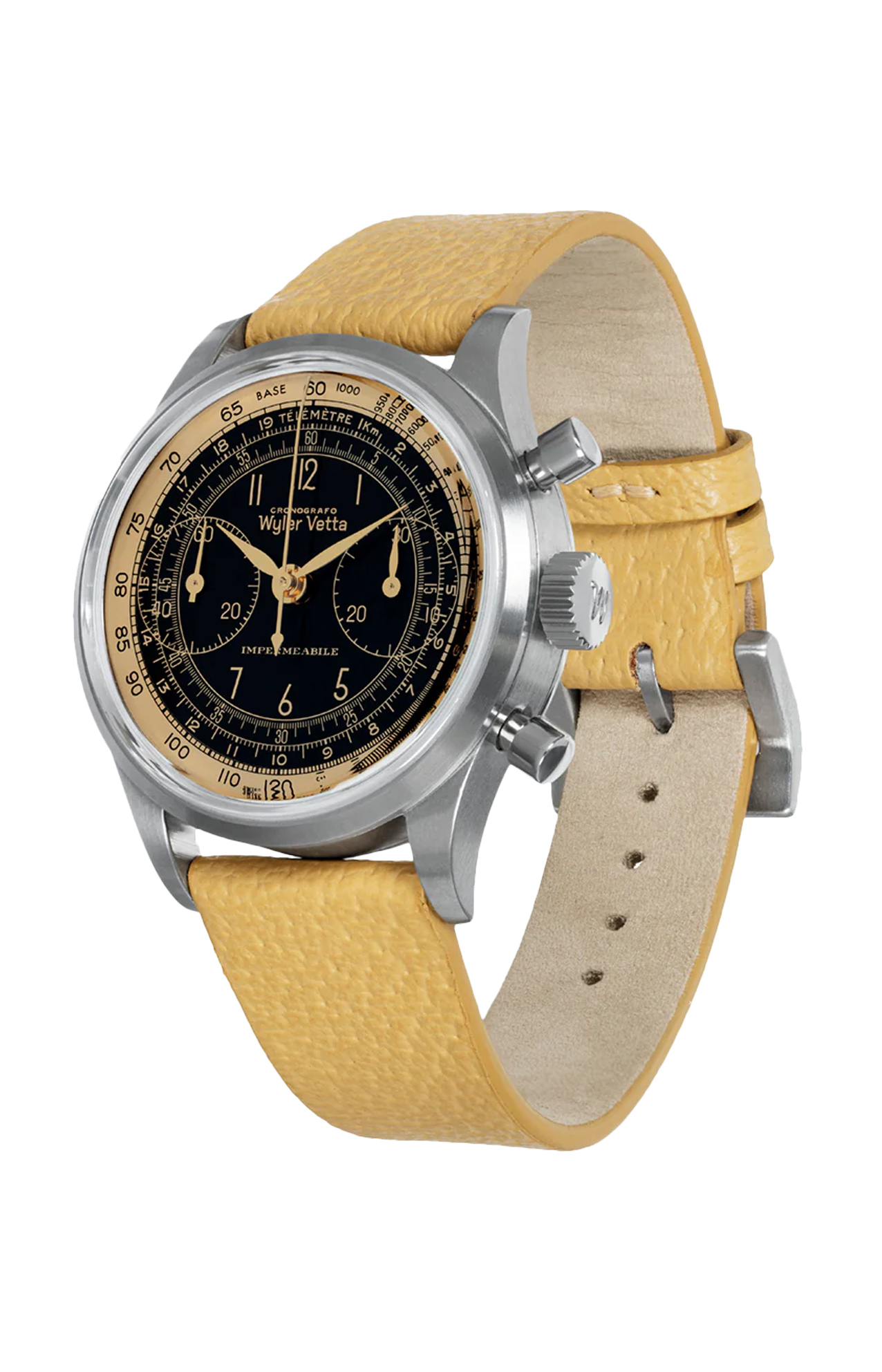 Orologio chrono gilt, cassa in acciaio satinato 38 mm, quadrante gilt bicolore nero, cinturino in pelle con sgancio rapido.