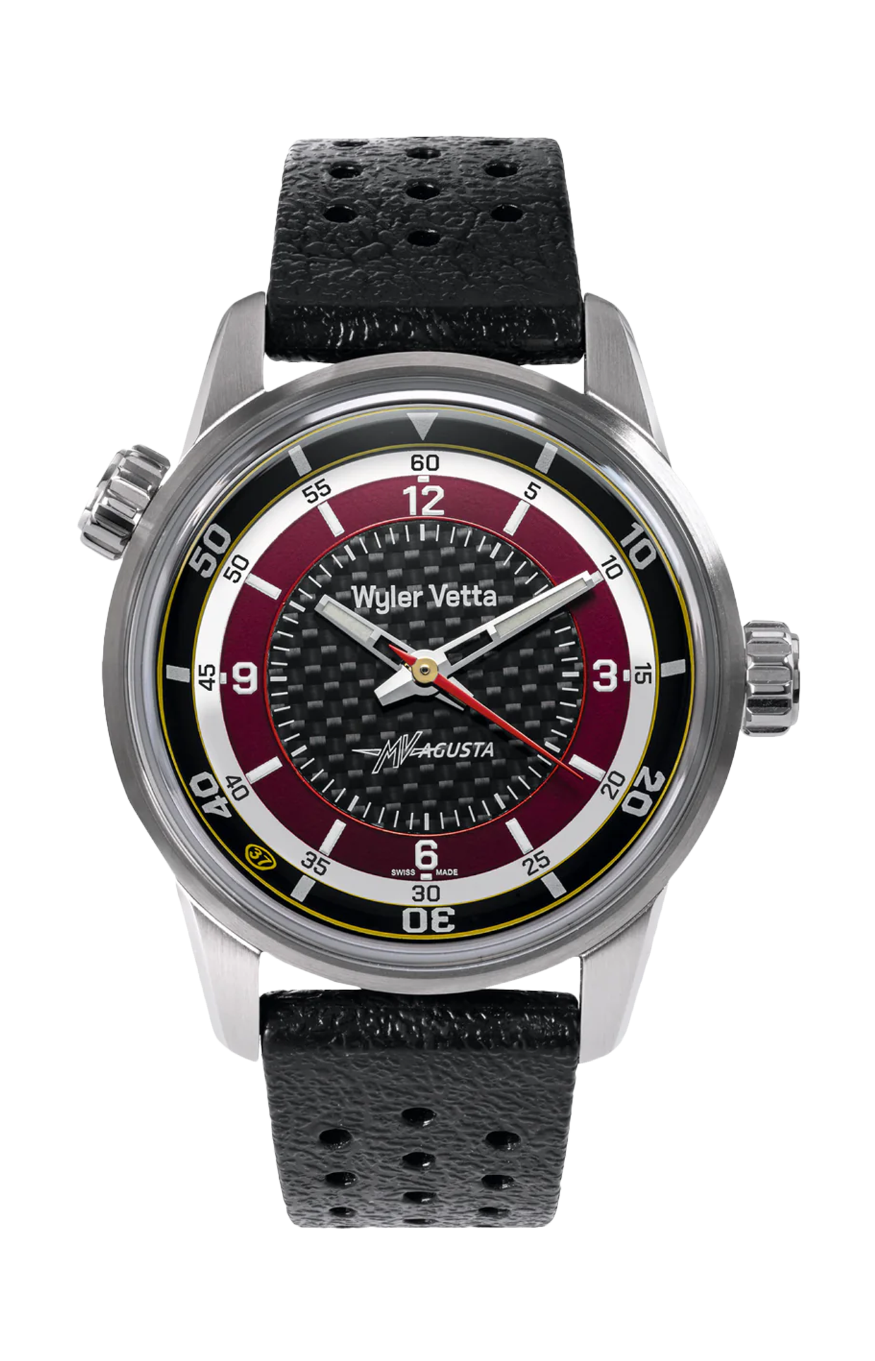 Il solo tempo Wyler Vetta in collaborazione con MV Agusta, così come il cronografo, riflette perfettamente lo stile della Superveloce 98 Edizione Limitata, la moto celebrativa degli 80 anni dal primissimo motore costruito dalla casa Varesina.