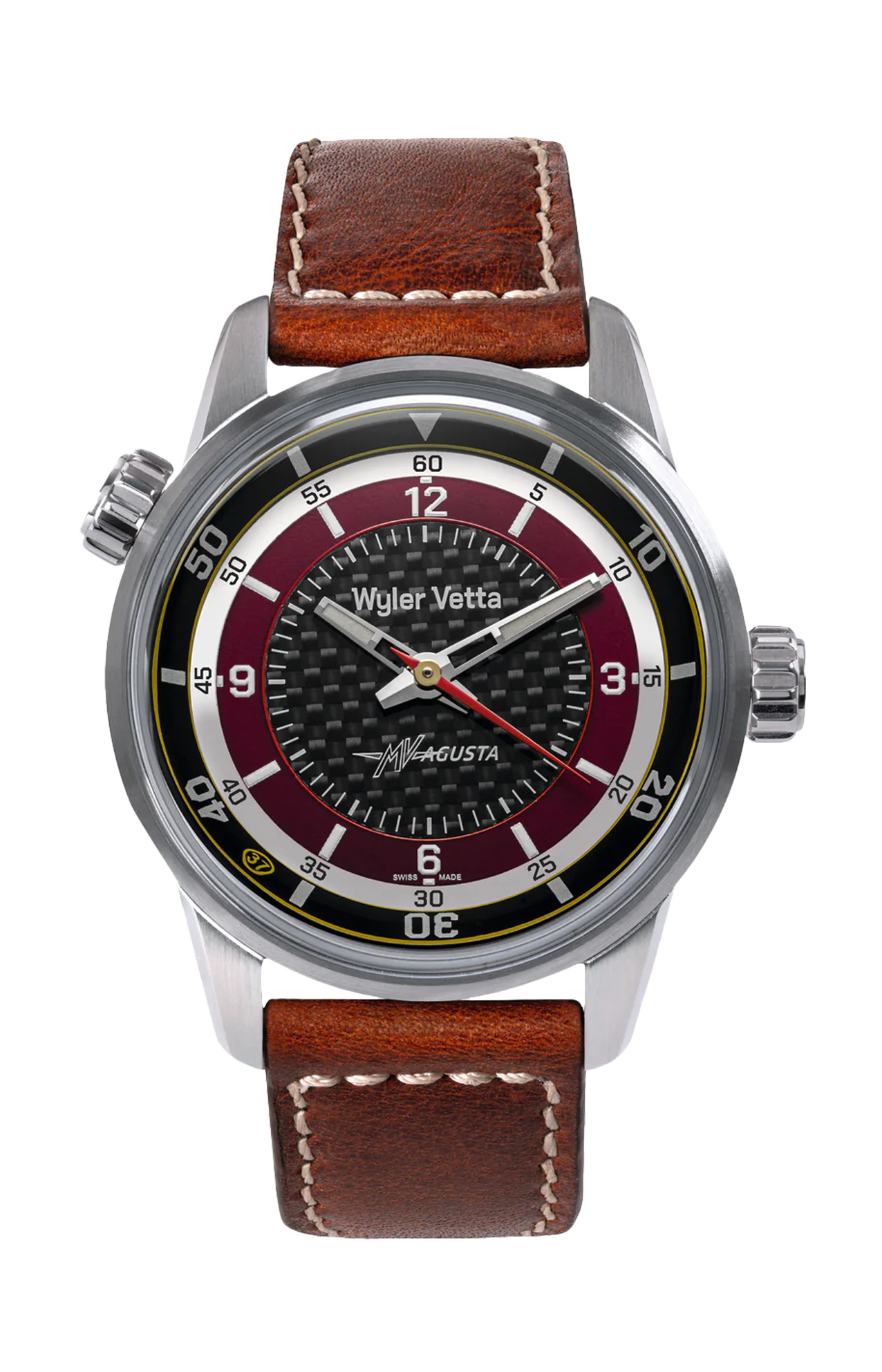 Ergonomico e grintoso, il nuovo solo tempo MV Agusta misura 40mm di diametro. Il quadrante con cuore in fibra di carbonio naturale, la ghiera rosso Verghera, gli indici e le sfere con inserto Super LumiNova e il "37" dorato delle vittorie mondiali MV Agusta sono elementi gli più eclatanti dell'orologio tanto sportivo quanto elegante.