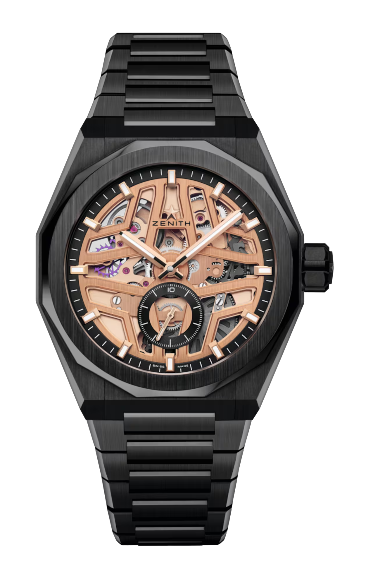 L’orologio DEFY Skyline Skeleton con cassa ottagonale in ceramica nera da 41 mm e lunetta sfaccettata si distingue per il quadrante aperto dorato, ispirato all’emblematica stella a quattro punte di ZENITH. Animato dal calibro El Primero 3620SK scheletrato, un movimento automatico ad alta frequenza con innovativo indicatore con precisione al 1/10 di secondo a ore 6. Dotato di un bracciale in ceramica nera e di un cinturino in caucciù nero con motivo, facilmente intercambiabili grazie all’ingegnoso sistema di sostituzione.