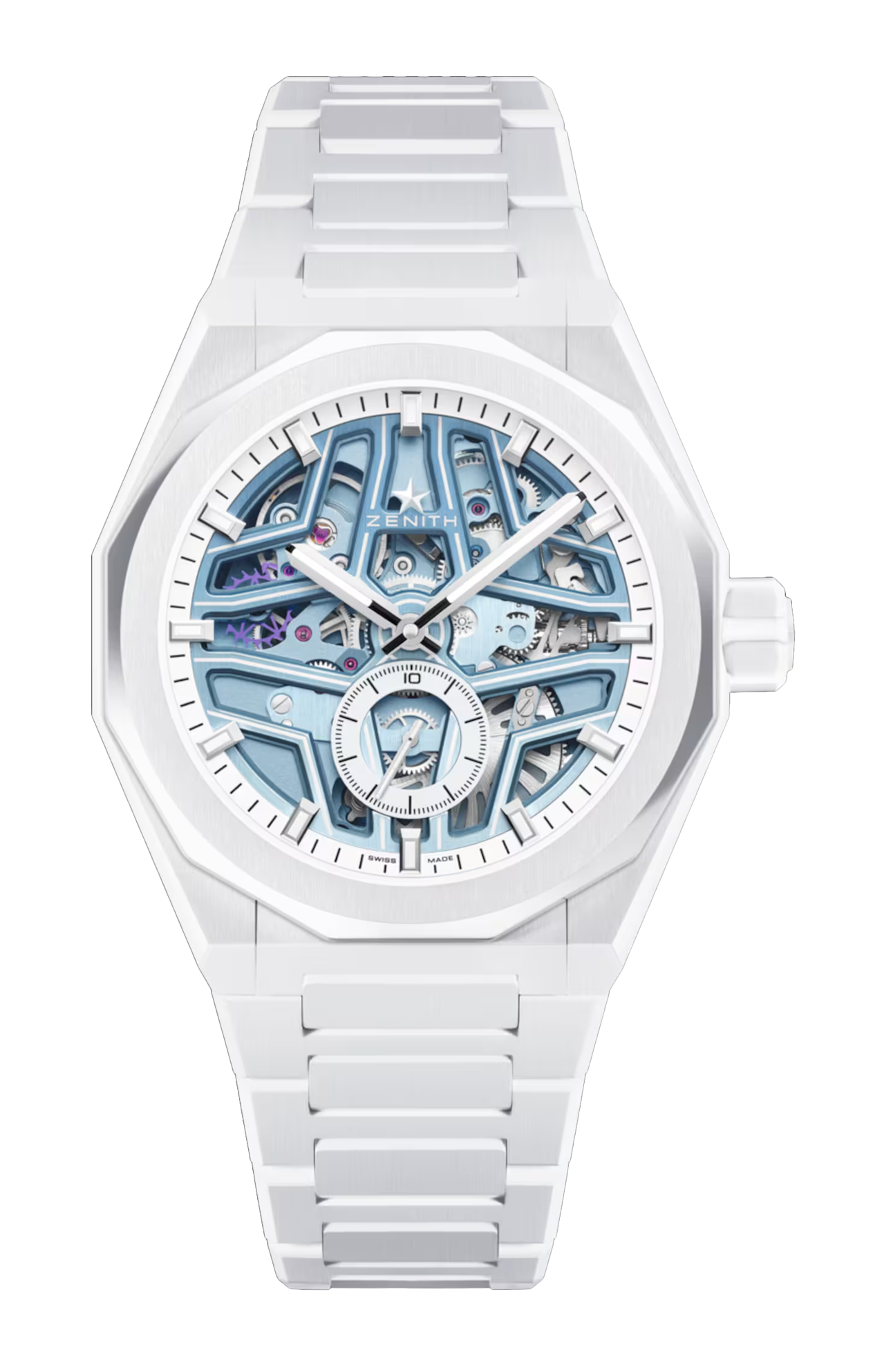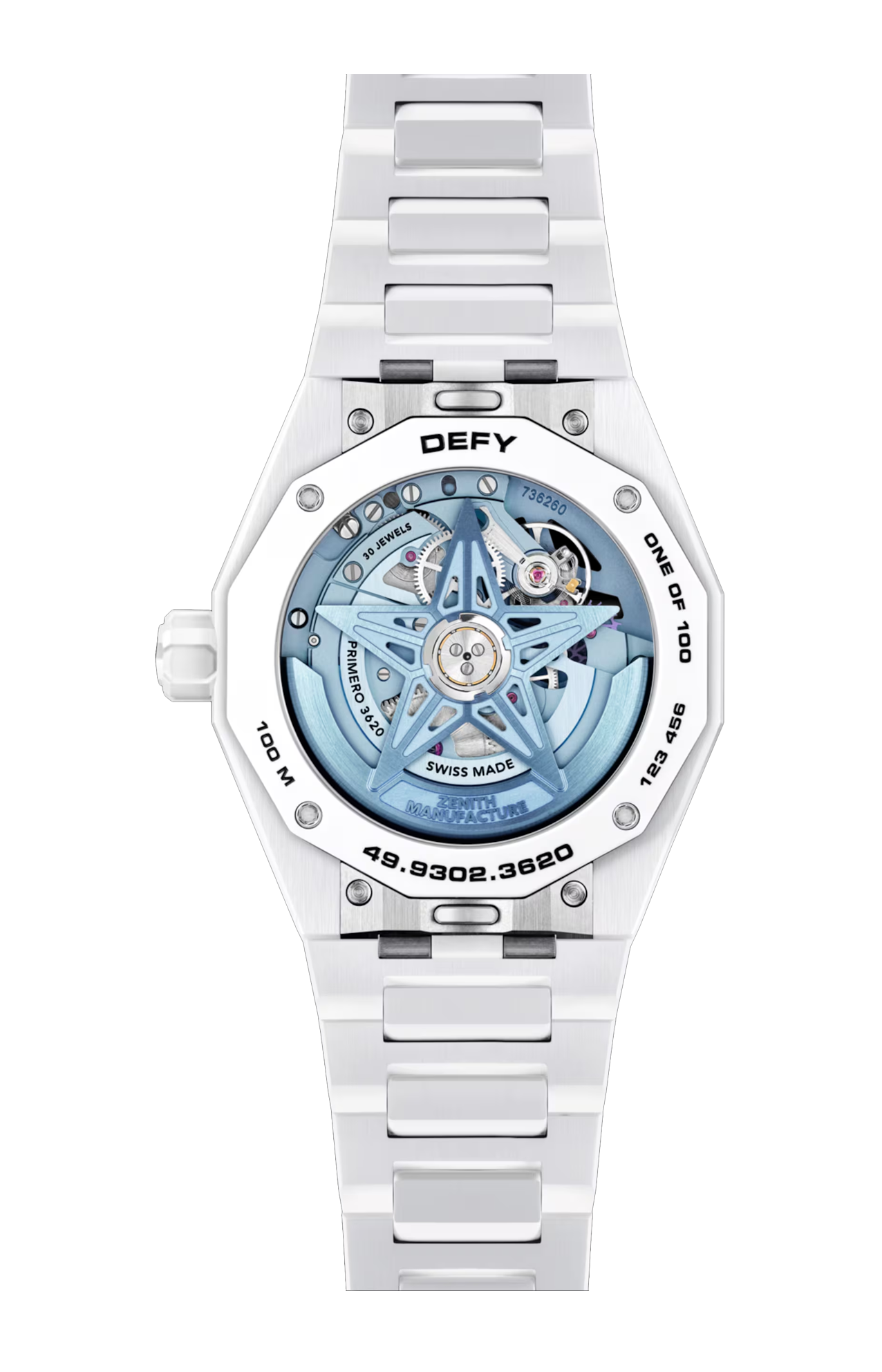 L’edizione limitata a 100 esemplari del DEFY SKYLINE SKELETON WHITE SURFER è la terza e ultima collaborazione della “SURFER TRILOGY” realizzata con TIME + TIDE. Abbina cassa in ceramica bianca e bracciale integrato, quadrante aperto blu sfumato e movimento scheletrato EL PRIMERO 3620 SK in tonalità blu coordinata. I ponti del quadrante assumono la forma della stella a cinque punte di ZENITH, realizzata in super-luminova per migliorare l’impatto visivo di notte. Insieme all’originale DEFY CLASSIC SKELETON NIGHT SURFER, è l’unico orologio ZENITH dotato di un logo con stella luminescente.