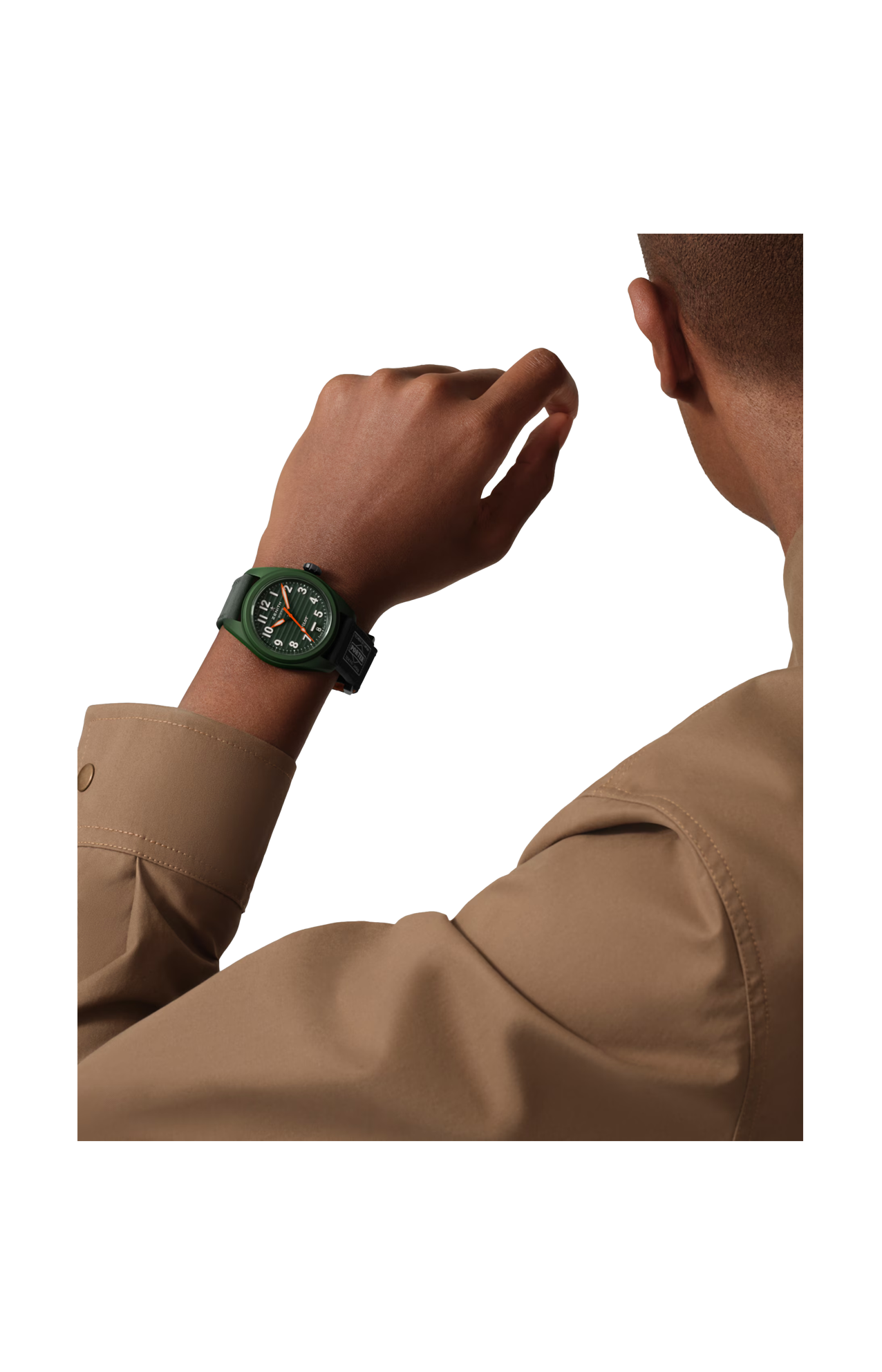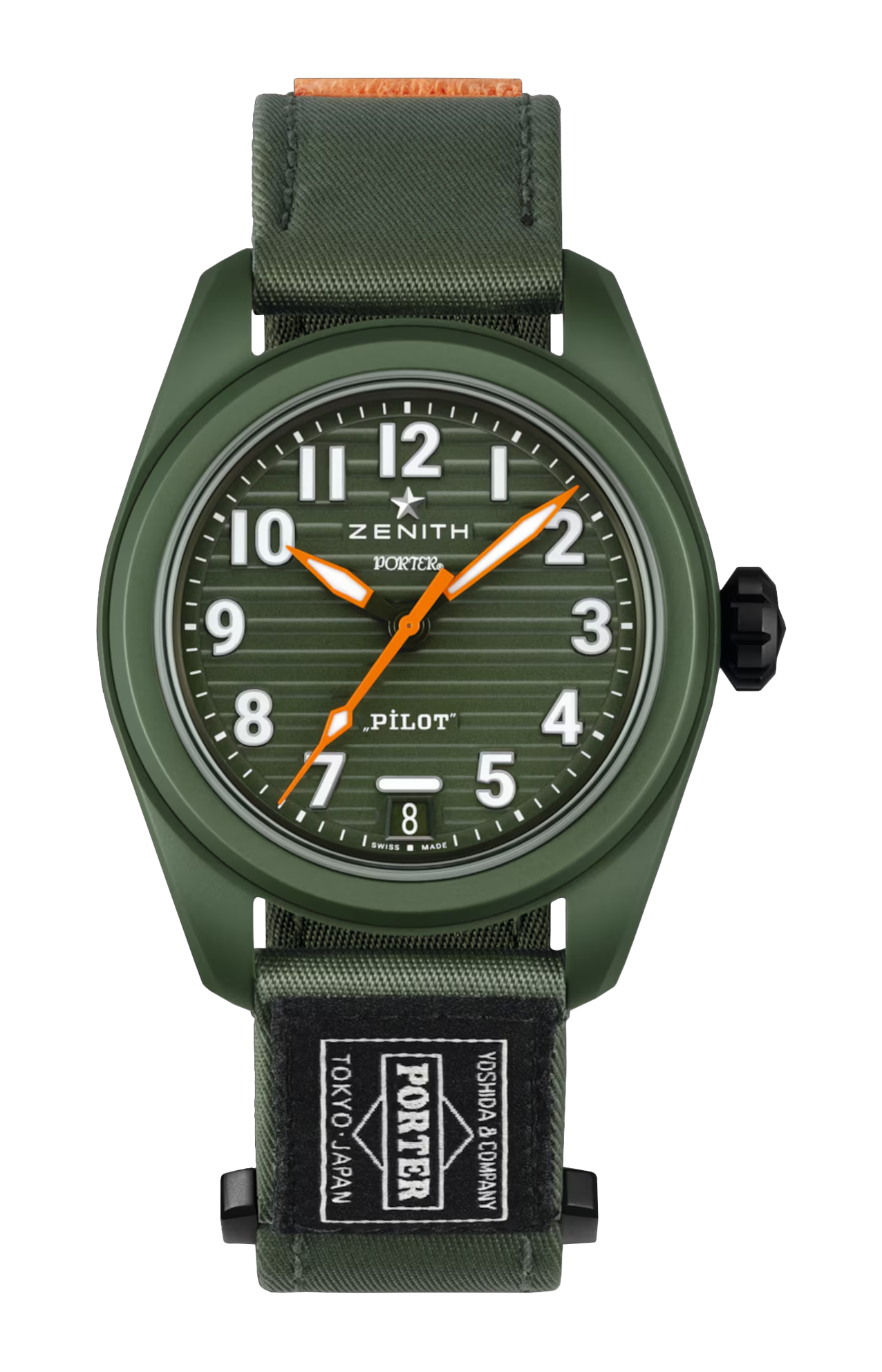 Il Pilot Automatic Porter in edizione limitata vanta una cassa in ceramica verde kaki da 40 mm con corona sovradimensionata e un quadrante testurizzato verde kaki con numeri arabi luminescenti di grandi dimensioni. Animato dal movimento automatico di manifattura ad alta frequenza El Primero 3620. Per completare il look, il Pilot Automatic Porter Edition è dotato di due cinturini. Il primo, realizzato con un resistente tessuto di nylon fornito da Porter, è un cinturino in nylon color verde kaki con elementi in velcro arancioni, con il logo Porter cucito. Il secondo è un cinturino in caucciù effetto “Cordura” color verde kaki.