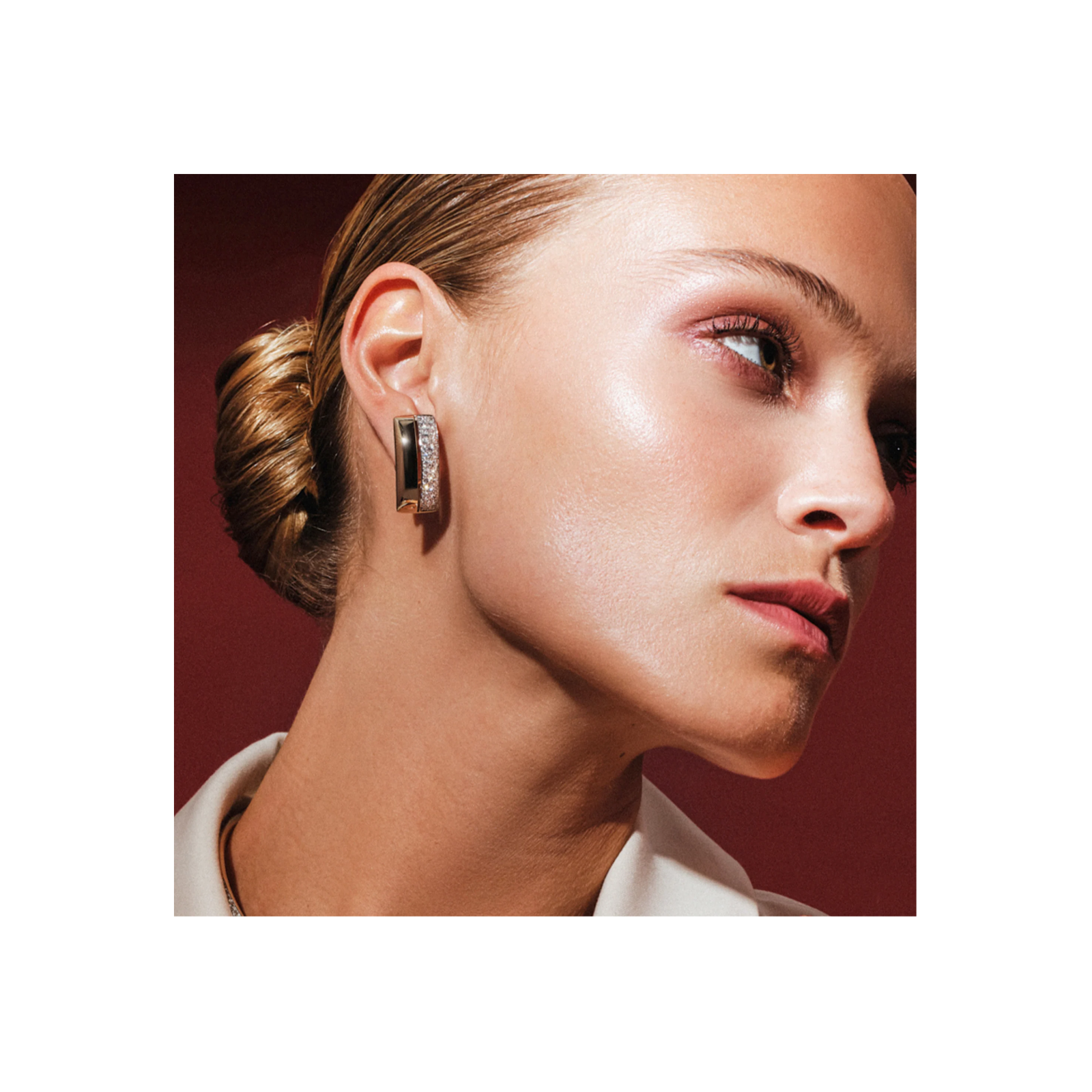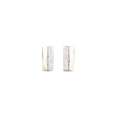 Orecchini a lobo in oro 18K e pavè in diamanti. La forma geometrica dal design minimalista gioca sulla netta separazione tra oro e diamanti, divisi da una linea, uno spazio vuoto, che crea un vibrante contrasto. La pratica chiusura è a perno e a clip.