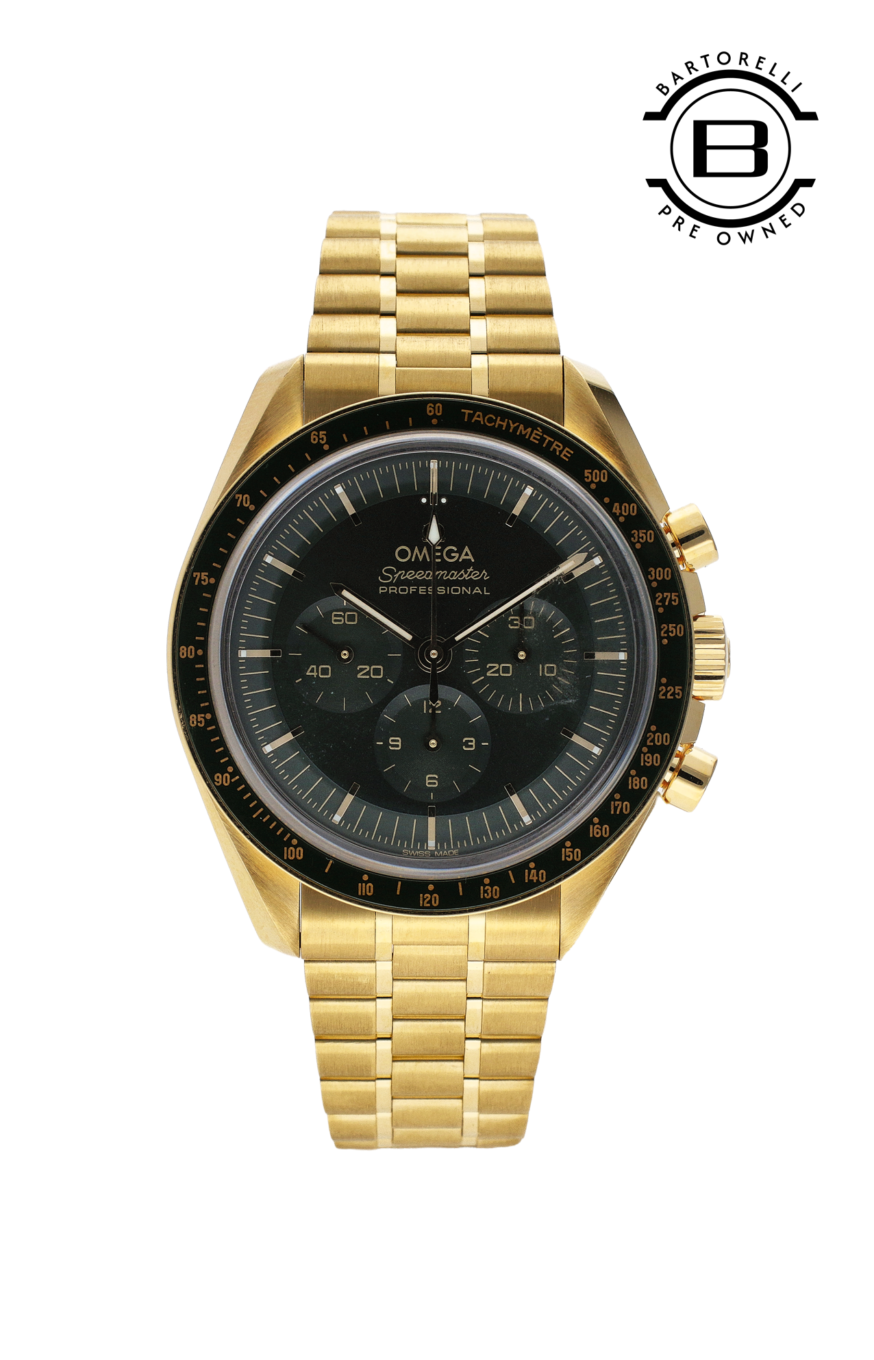 Ispirato allo Speedmaster di quarta generazione, questo Moonwatch da 42 mm con cassa e bracciale in oro Moonshine™ 18K presenta un quadrante “step” in PVD verde con finitura spazzolata a raggi di sole e lancette stile “Moonwatch”. L’anello della lunetta in ceramica verde con scala tachimetrica in OMEGA Ceragold™ presenta il celebre indice “dot over 90”.