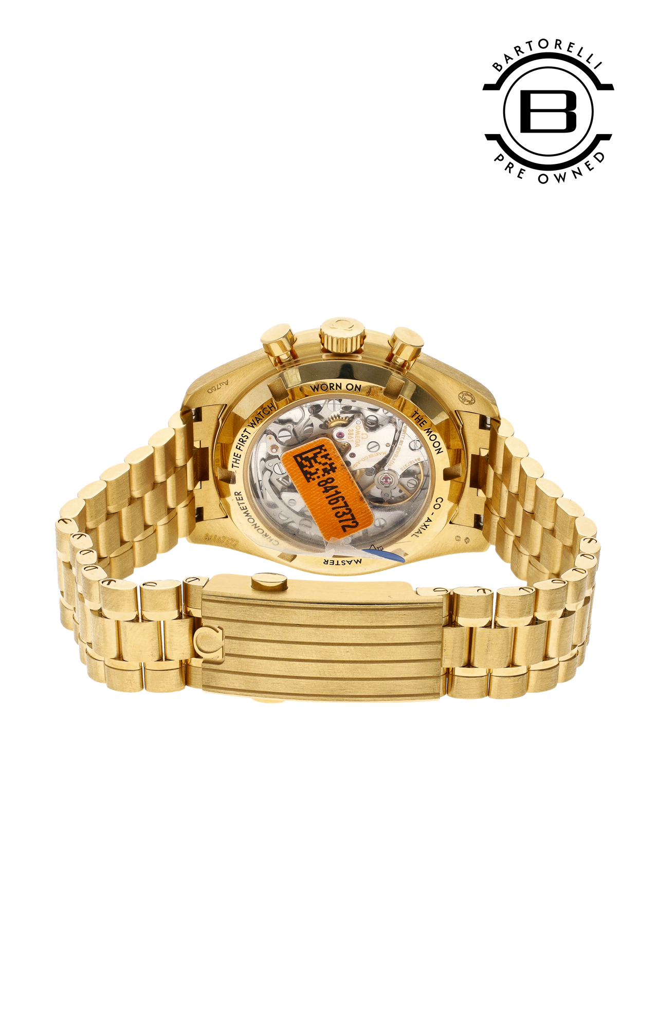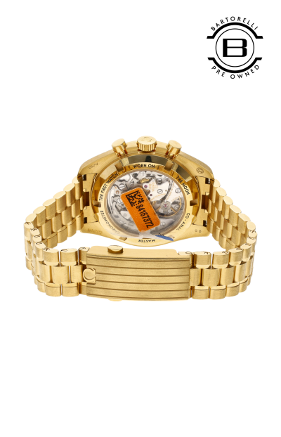 Il fondello in oro Moonshine™ 18K con finitura lucida è caratterizzato da doppie smussature e incisione in nero della dicitura “FIRST WATCH WORN ON THE MOON”. Il Moonwatch è alimentato dal calibro OMEGA Co-Axial Master Chronometer 3861 con una speciale finitura di lusso.