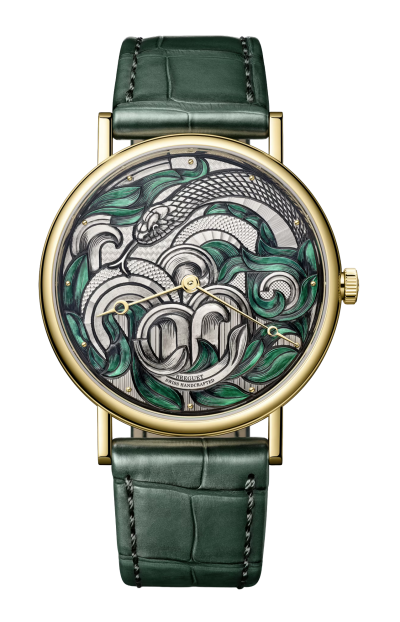 All’interno pulsa un movimento meccanico automatico di manifattura di alta precisione, progettato per garantire prestazioni affidabili e costanti, riflettendo la maestria tecnica che contraddistingue Breguet. Il vetro zaffiro bombato antigraffio protegge il quadrante e ne amplifica la visibilità da ogni angolazione, mentre il fondello in vetro zaffiro permette di ammirare le finiture sofisticate del movimento, tra cui le decorazioni tradizionali visibili nei ponti e nella massa oscillante.