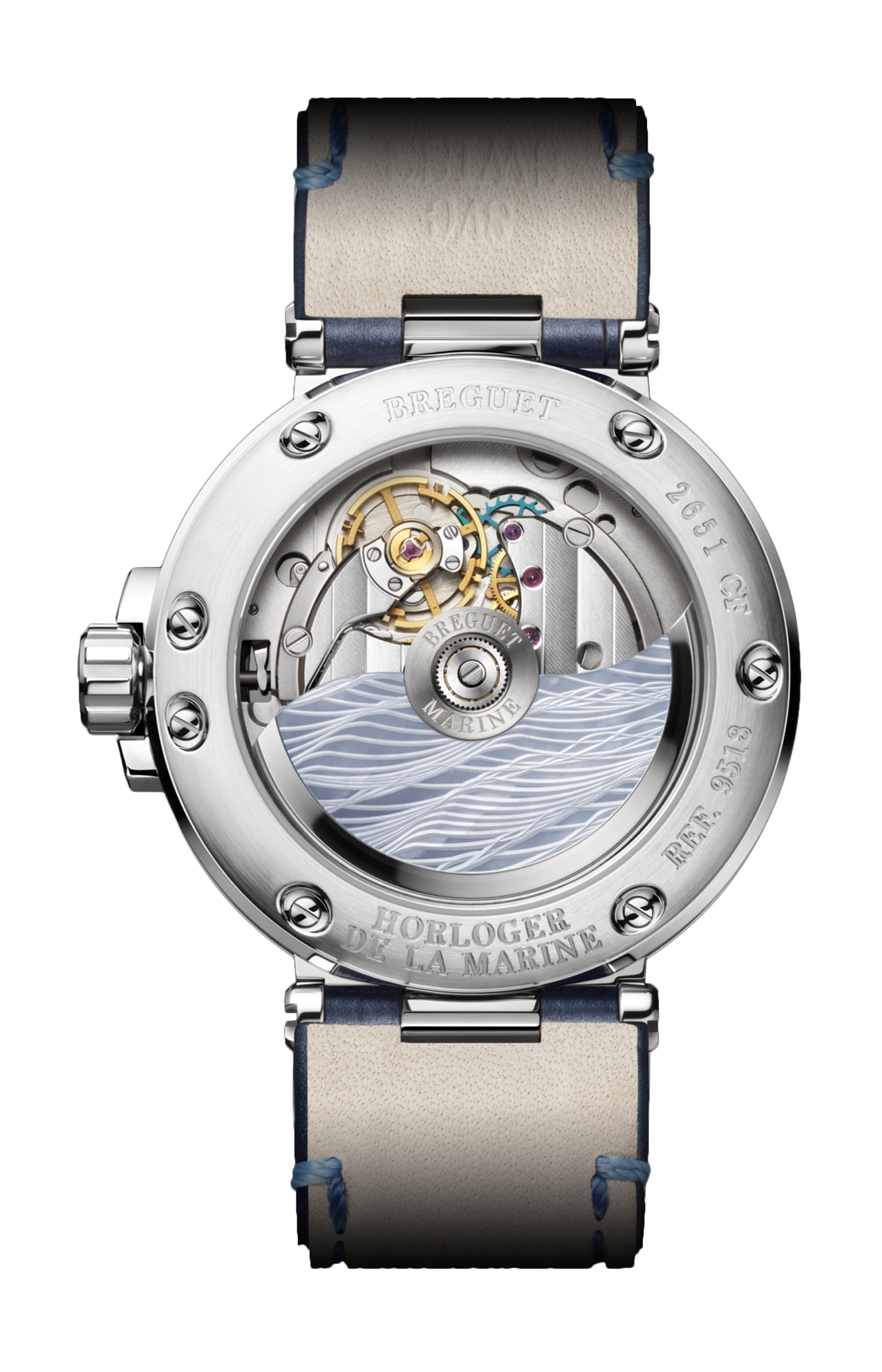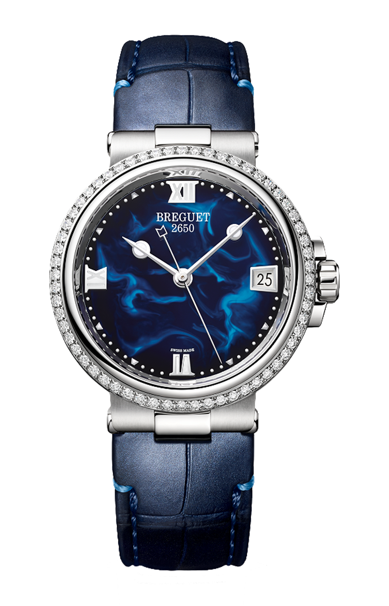 Il Breguet Marine 9518STE/2984D000 è un orologio che unisce l'eleganza raffinata della manifattura con una presenza discreta e femminile, esaltata da dettagli preziosi e finiture di alto livello: la cassa in acciaio dal diametro di 33,8 mm e spessore di circa 9,9 mm offre proporzioni perfette per chi cerca un segnatempo elegante ma non sovradimensionato. La lunetta è tempestata da 60 diamanti taglio brillante (circa 0,84 carati) che incorniciano con splendore il quadrante blu laccato, conferendo un tocco di lusso sottile senza scadere in eccessi. Il quadrante è completato da lancette «Breguet» in oro rosa e da indici luminescenti, con la data a ore 3, mentre il fondello in vetro zaffiro consente la visione del movimento automatico calibro 591 a dotato di 25 rubini, spirale in silicio e riserva di marcia di circa 38 ore. L’impermeabilità fino a 5 bar (50 metri) ne consente un utilizzo quotidiano in tutta serenità, mentre il cinturino in alligatore blu con chiusura deployante in acciaio armonizza perfettamente con il quadrante e il cinturino stesso. Questo orologio è pensato per chi desidera un segnatempo di alta orologeria, con una forte identità stilistica, raffinato nella trama dei dettagli e al tempo stesso versatile nella vita di tutti i giorni.
