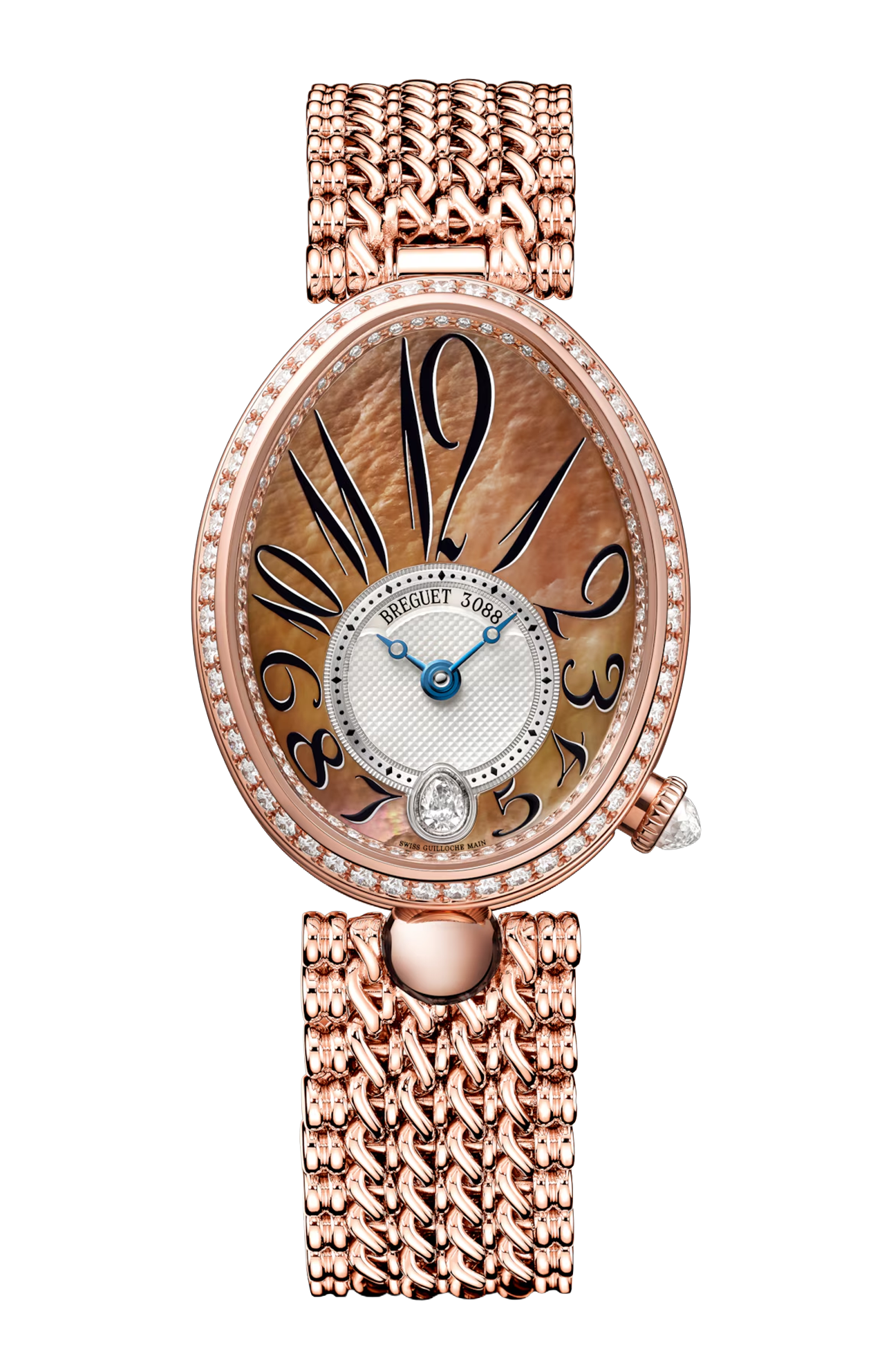 Completano il quadrante le inconfondibili lancette Breguet a “pomme excentrée”. A ore 6, altri due dettagli rendono unico questo esemplare di 36,50 x 28,45 mm: una pietra preziosa taglio poire e un’ansa “boule” che collega la carrure al cinturino. Per aumentare la lucentezza la lunetta, il réhaut e la corona sono decorati da diamanti incastonati.