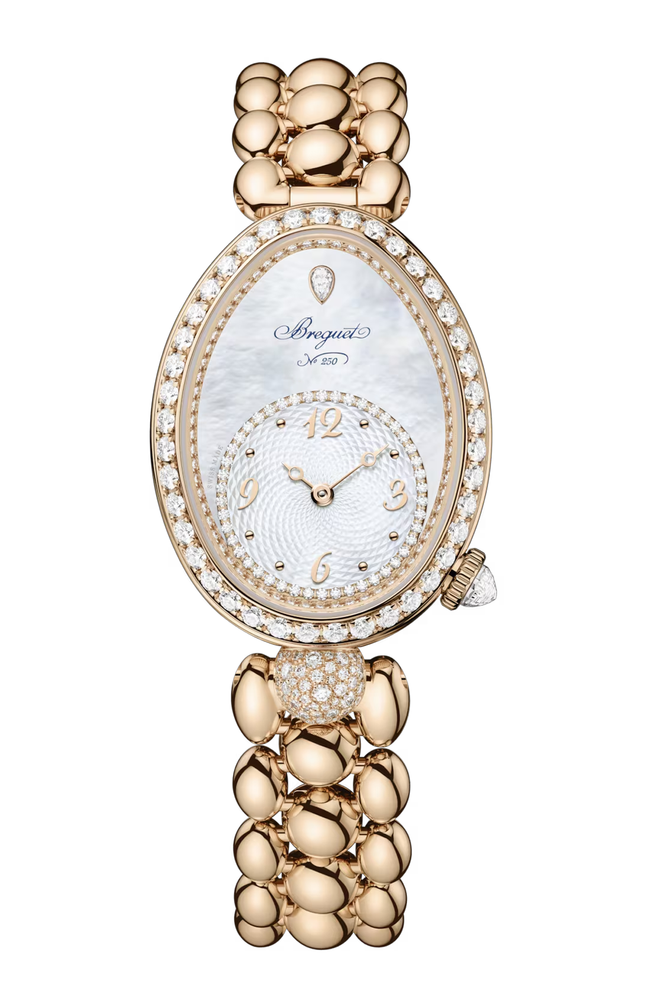 Il vetro zaffiro bombato antigraffio protegge il quadrante e ne esalta ogni dettaglio, mentre all’interno pulsa un movimento meccanico automatico di alta precisione, progettato per garantire affidabilità e prestazioni costanti, testimonianza dell’eccellenza tecnica della Maison. Il cinturino in oro Breguet completa l’insieme con comfort e stile, rendendo questo segnatempo perfetto sia per occasioni formali sia come simbolo di eleganza nel quotidiano. Il Reine de Naples 8925BH/5WJ/40D0 è molto più di un semplice orologio: è un gioiello d’alta orologeria che esprime femminilità, tradizione e artigianalità in un’estetica elegante e senza tempo.