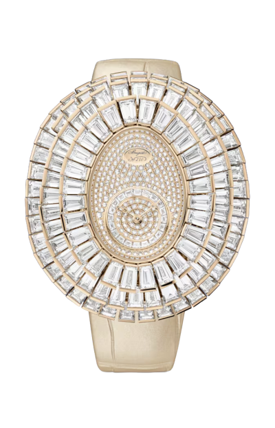 Il Breguet Reine de Naples Crazy Flower GJE25BH/2089S/EDB è un orologio d’alta gioielleria che unisce raffinatezza poetica e maestria tecnica, pensato per chi desidera un segnatempo femminile dall’eleganza senza tempo e dal carattere creativo. La cassa ovale in oro Breguet 18 K è incastonata con diamanti taglio brillante di alta qualità, che racchiudono con luce delicata il quadrante decorato con motivi floreali scolpiti e impreziositi da preziosi pavé di gemme colorate, creando un effetto visivo che richiama la delicata bellezza di un bouquet fiorito. Il quadrante stesso è un’opera d’arte, con petali di fiori in gemme sfaccettate che sembrano danzare sotto il vetro zaffiro antigraffio, incorniciato da una lunetta tempestata di diamanti. Le lancette sottili e eleganti scorrono con precisione, offrendo un’esperienza di lettura del tempo raffinata e armoniosa. All’interno batte un movimento meccanico automatico di alta qualità, progettato per garantire affidabilità e performance costanti, riflettendo l’eccellenza orologiera della Maison Breguet. Il cinturino in pelle di alta gamma completa il design con un tocco di raffinatezza e comfort al polso. Questo segnatempo rappresenta la perfetta sintesi tra gioielleria e orologeria, ideale per chi cerca un accessorio unico e prezioso che celebri la femminilità con un’estetica artistica e senza compromessi.