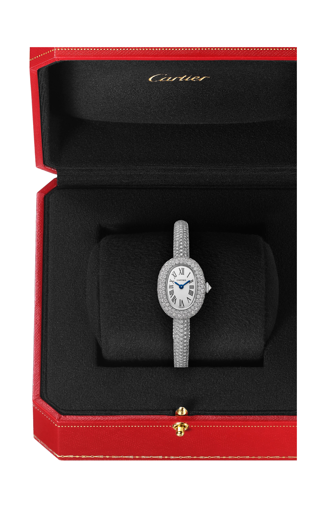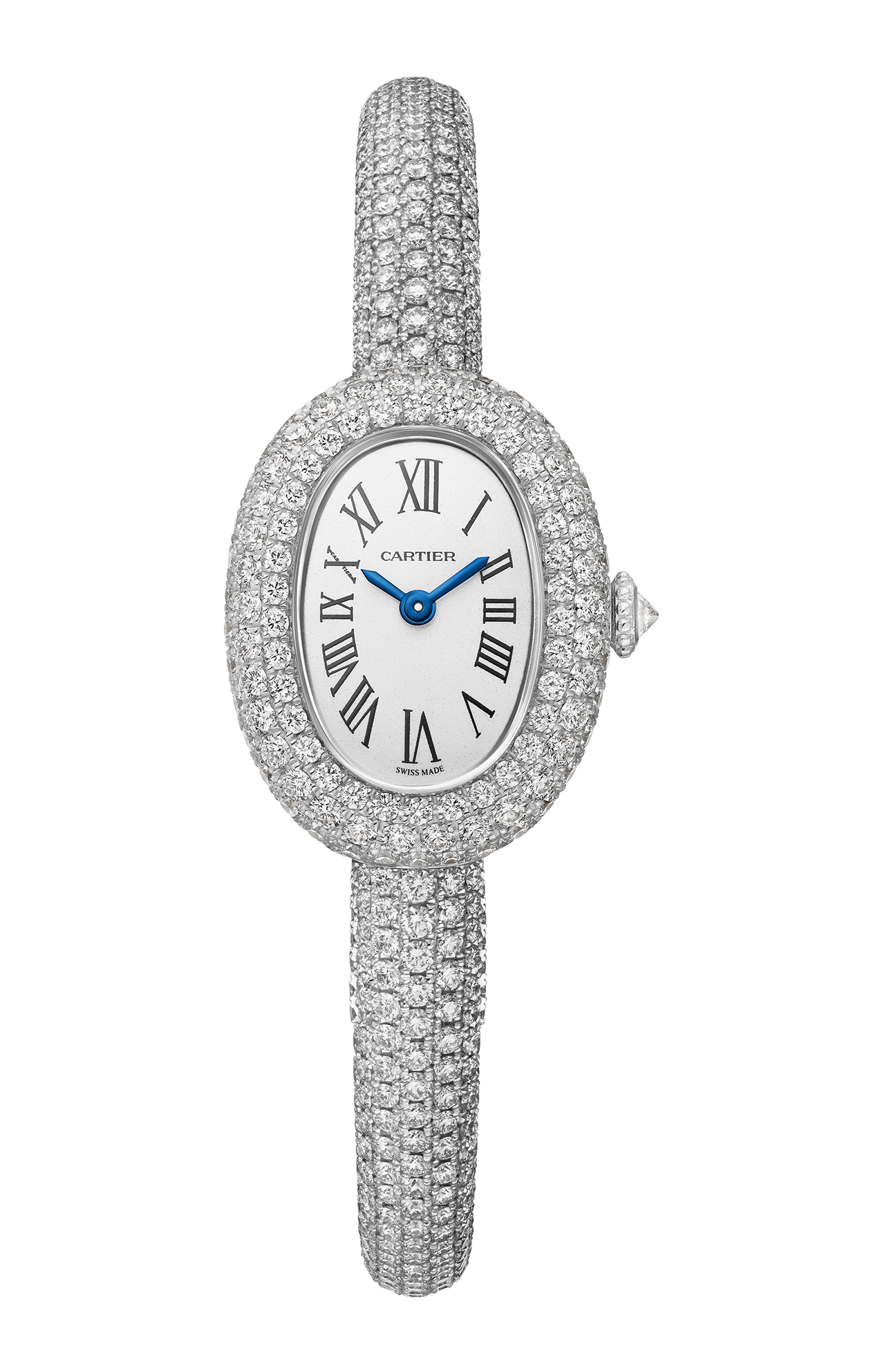 Orologio Baignoire, modello mini, misura 15, movimento al quarzo. Cassa in oro bianco 18 carati (750/1000) rodiato con 171 diamanti taglio brillante per un totale di 1,91 carati. Corona a perline in oro bianco 18 carati (750/1000) rodiato con un diamante taglio brillante per un totale di 0,08 carati. Bracciale rigido in oro bianco 18 carati (750/1000) rodiato con 380 diamanti taglio brillante per un totale di 3,11 carati. Quadrante argentato, lancette a forma di gladio in acciaio azzurrato, vetro zaffiro. Lunghezza: 24,6 mm, larghezza: 18,7 mm, spessore: 7,2 mm. Impermeabile fino a 3 bar (circa 30 metri/100 piedi).