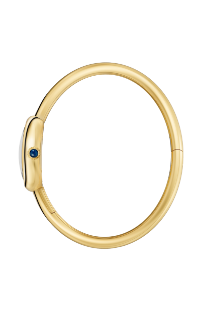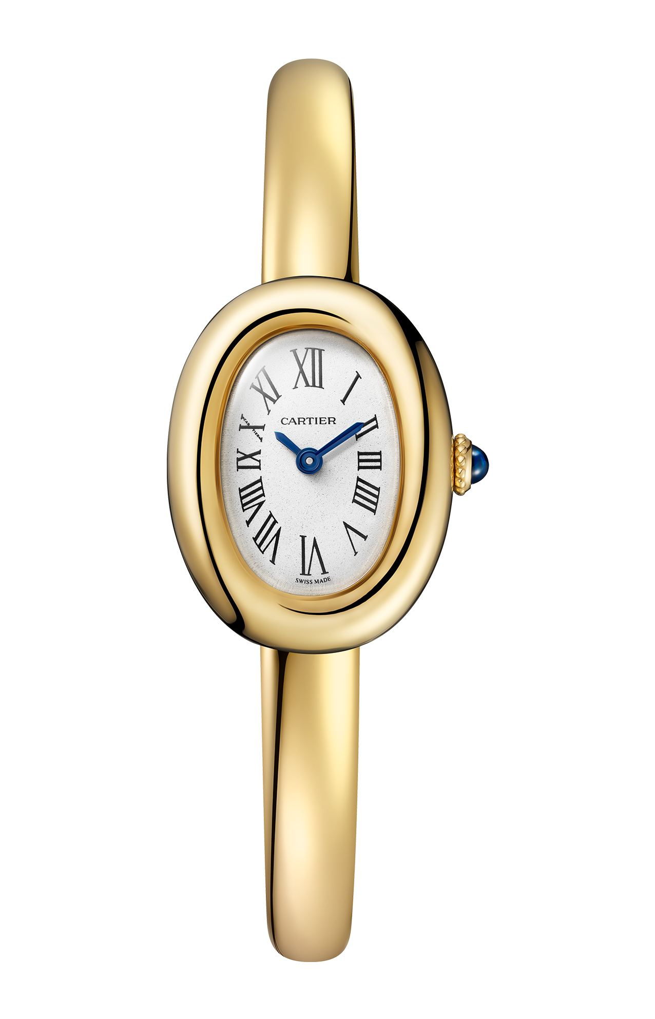 Orologio Baignoire, modello mini, misura 15, movimento al quarzo. Cassa in oro giallo 18 carati (750/1000). Corona perlata in oro giallo 18 carati (750/1000) con cabochon in zaffiro. Bracciale rigido in oro giallo 18 carati (750/1000). Quadrante argentato, lancette a forma di gladio in acciaio azzurrato, vetro zaffiro. Lunghezza: 24,6 mm. Larghezza: 18,7 mm. Spessore: 7,2 mm. Impermeabile fino a 3 bar (circa 30 metri/100 piedi).