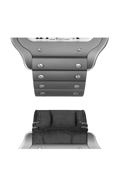 Orologio Santos de Cartier, modello grande. Movimento a carica automatica. Cassa 39,8 mm in titanio, cinturino in titanio e secondo cinturino in pelle di alligatore con chiusura pieghevole entrambi con sistema QuickSwitch. Impermeabilità 10 ATM.