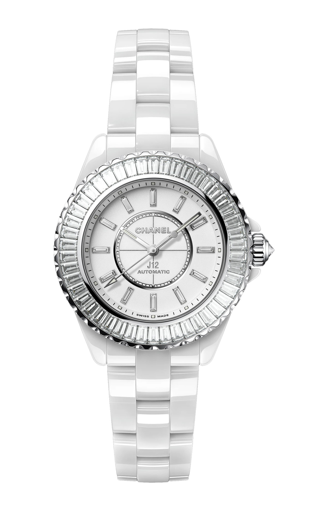 L’orologio CHANEL J12 Baguette Diamond Bezel Calibro 12.2 33 mm Ref. H7430 è un segnatempo che unisce con maestria eleganza, raffinatezza e prestazioni tecniche, perfetto per chi desidera un accessorio di lusso contemporaneo dal carattere deciso. La cassa da 33 mm è realizzata in acciaio e ceramica bianca ad alta resistenza, materiali che offrono una brillantezza duratura, leggerezza e ottima resistenza ai graffi; intorno alla lunetta, un pavé di diamanti taglio baguette aggiunge un tocco di luminosità sofisticata ed esclusiva. Il quadrante bianco laccato conferisce profondità visiva e un’estetica pulita, esaltando gli indici e le lancette rodiate che assicurano una lettura chiara delle ore, dei minuti e dei secondi. Il movimento Calibro 12.2 automatico Swiss made garantisce affidabilità, precisione e comfort d’uso quotidiano, combinando tecnologia e savoir-faire orologiero. Il bracciale in ceramica bianca con chiusura pieghevole in acciaio integra comfort e design, creando continuità estetica con la cassa e assicurando una perfetta aderenza al polso. Con impermeabilità fino a 200 metri, questo J12 è progettato per accompagnare chi lo indossa in ogni momento della giornata con stile e prestazioni efficaci, incarnando l’eleganza senza tempo e l’innovazione tecnica tipiche di CHANEL.