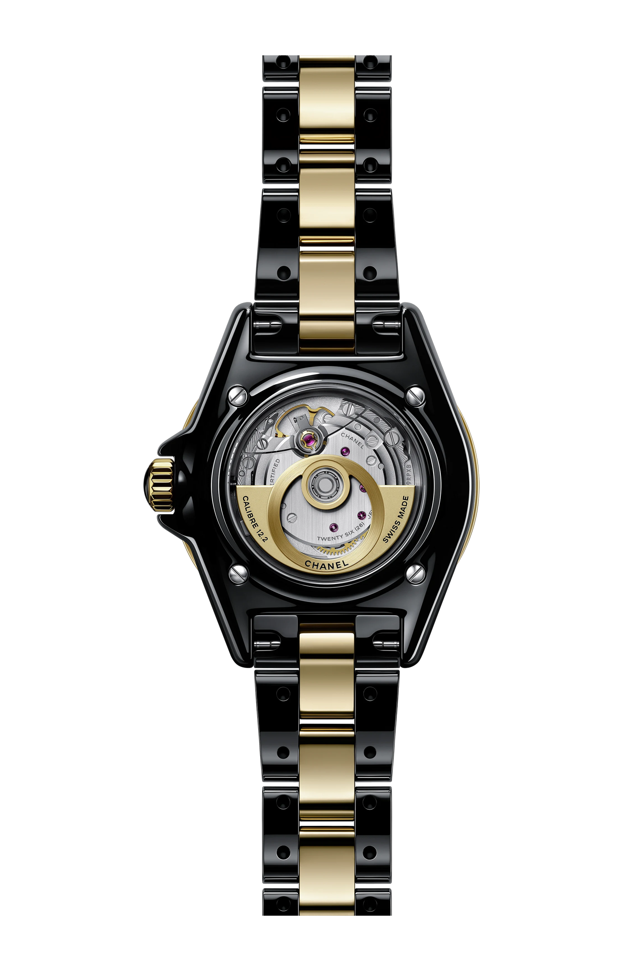 Rendere visibile l’invisibile. È a partire da questa visione che è stato progettato il movimento automatico di Manifattura Calibro 12.2. Curato nei minimi dettagli, presenta bordi lucidati a diamante e una massa oscillante traforata in tungsteno – un materiale denso e pesante, proprietà che lo rendono particolarmente adatto ad armare la molla del bariletto e garantire una riserva di carica di 50 ore. Una potenza erogata con estrema delicatezza, per garantire prestazioni e precisione. Visibile attraverso un vetro zaffiro sul fondello del J12, forma un cerchio perfetto: la firma orologiera della Maison.