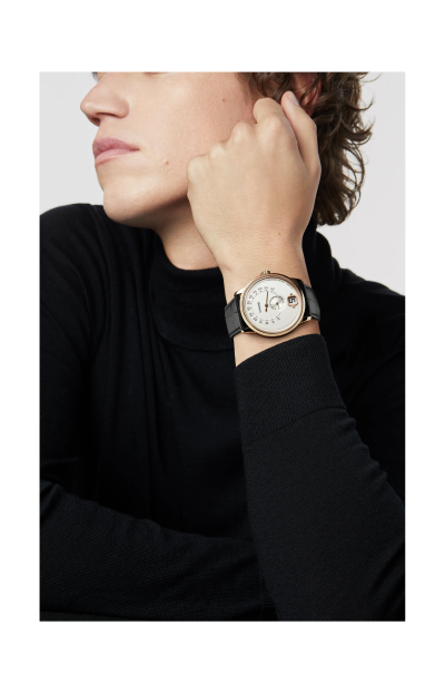 40 mm. Cassa in ORO BEIGE 18 carati. Corona in ORO BEIGE 18 carati. Quadrante opalino avorio con indicatore dei minuti retrogradi, finestrella delle ore saltanti e contatore dei piccoli secondi. Cinturino in pelle nera motivo alligatore e chiusura ad ardiglione in ORO BEIGE 18 carati. Movimento meccanico a carica manuale ≈ 70 ore. Funzioni piccoli secondi, ore, minuti, secondi.