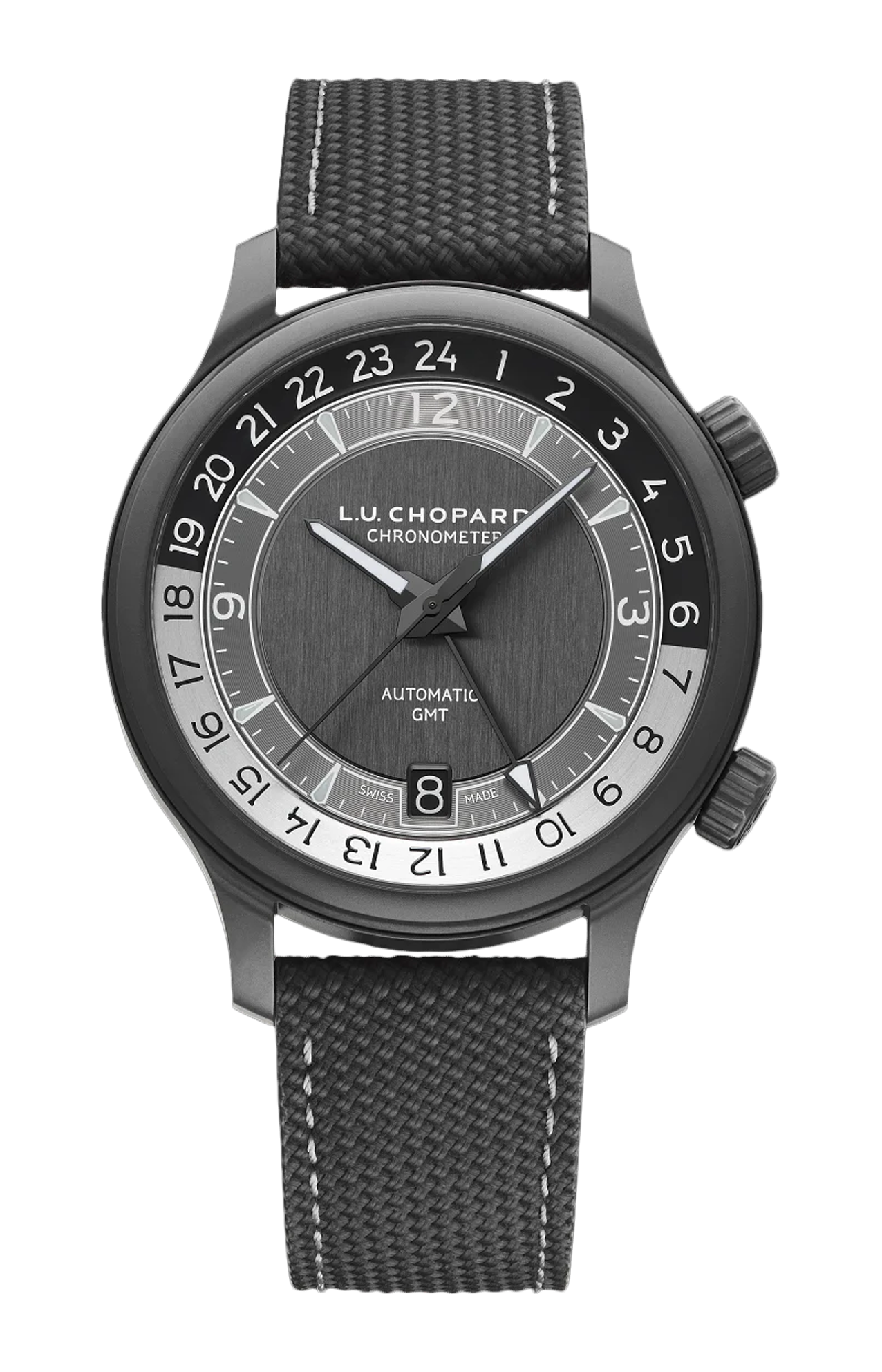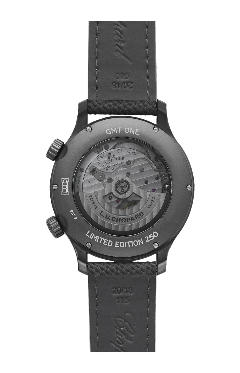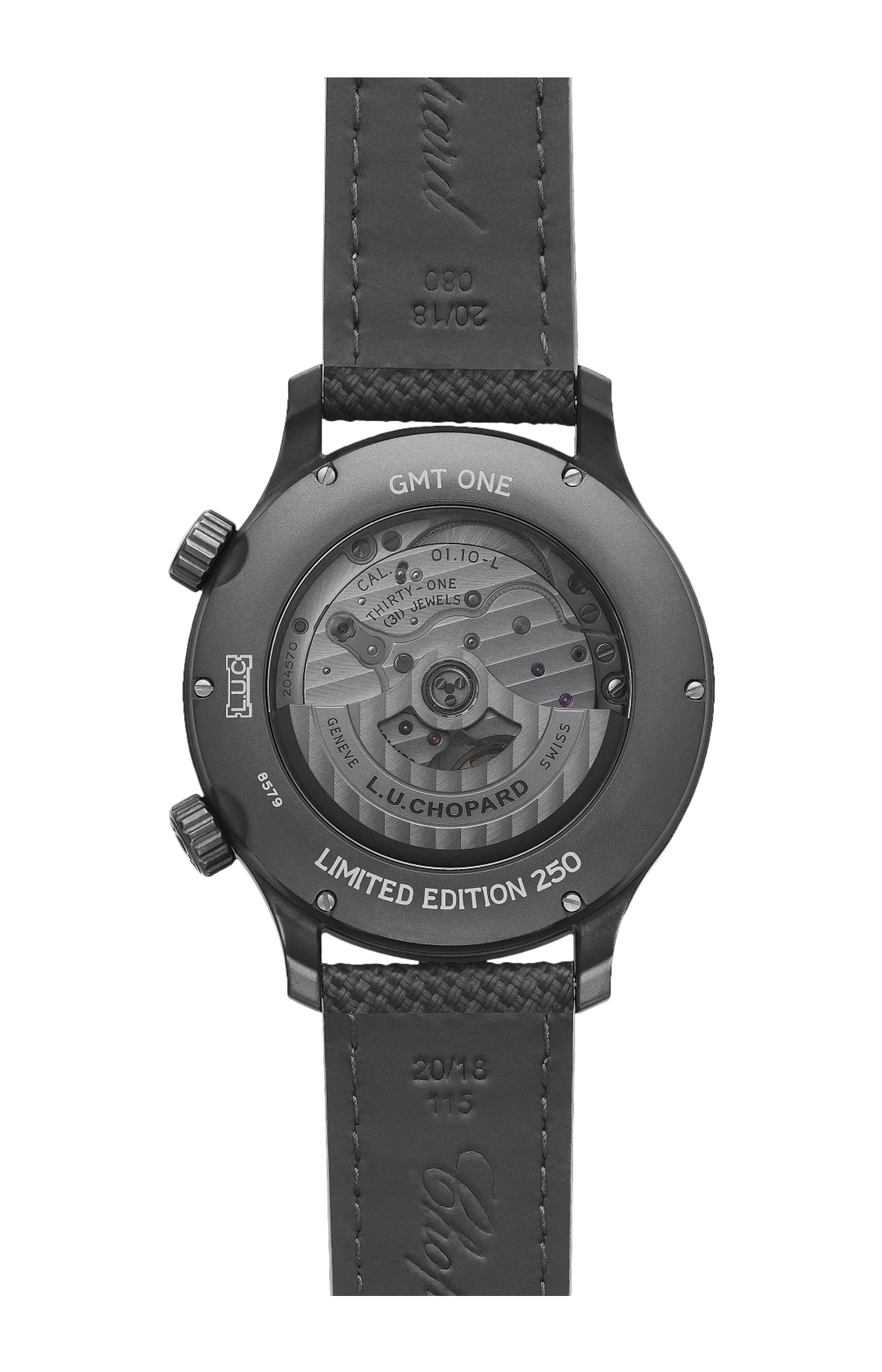 Per i viaggiatori moderni e i veri cittadini del mondo, il nuovo L.U.C GMT One Black offre una fresca interpretazione monocromatica dell'orologio da viaggio a doppio fuso orario. La cassa leggera e ultraresistente in titanio ceramizzato e la tonalità grigio su nero ne fanno il segnatempo ideale per soddisfare i ritmi di vita esigenti di una nuova generazione di gentlemen viaggiatori. Con il nuovo modello L.U.C Time Traveler One Black, è il primo orologio da viaggio al mondo a utilizzare per la cassa questo avanzato materiale, conferendo un tocco altamente contemporaneo alla realizzazione interna dell'orologeria L.U.C di Chopard. L'orologio è alimentato dal rinomato calibro certificato cronometro L.U.C 01.10-L. Edizione limitata a 250 esemplari.