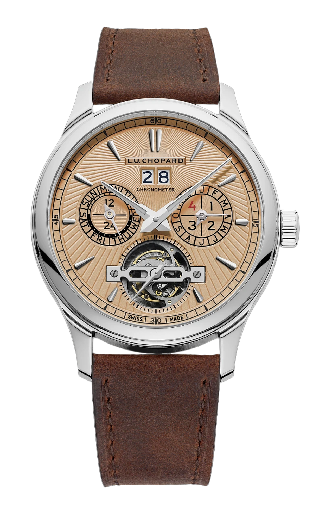 Chopard presenta l'interpretazione di un modello emblematico della collezione L.U.C: il L.U.C Perpetual T. Expression di alta orologeria Chopard, disponibile per la prima volta in oro bianco 18 carati in una versione da 43 mm. La raffinatezza delle complicazioni, il trionfo delle decorazioni e la sobria ricercatezza che lo caratterizzano esprimono l'aderenza all'eredità lasciataci da Louis Ulysse Chopard. Il tourbillon è completato da un calendario perpetuo ad alta visibilità per un orologio dall'estetica molto elaborata. Cronometro certificato COSC provvisto del marchio Poinçon de Genève per la qualità della sua manifattura, il L.U.C Perpetual T non è solo una dimostrazione di maestria. Questo è un orologio da provare in tutta la sua raffinatezza e le sue funzioni. Dotato della tecnologia Chopard Quattro®, il suo movimento meccanico a carica manuale, il L.U.C. 02.15-L, vanta una pratica riserva di carica di 216 ore (9 giorni). Prodotto in una serie limitata di 10 esemplari, il L.U.C Perpetual T è progettato per il gentiluomo contemporaneo famoso per la sua particolare eleganza come conoscitore di orologi e amante di oggetti eccezionali.