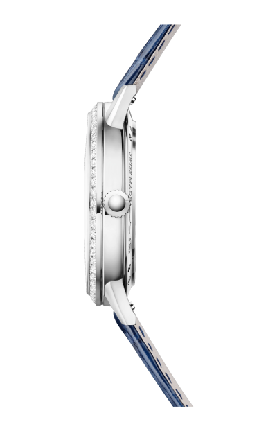 Adornato con una corona di 107 diamanti sulla lunetta e all’interno del quadrante, il Rendez-Vous Night & Day unisce la maestria della Grande Maison nell’arte orologiera e nell’alta gioielleria. In un perfetto equilibrio estetico, ogni dettaglio conferisce al segnatempo uno stile contemporaneo e prezioso. La cassa in acciaio, arricchita da lunetta e fianchi arrotondati e da anse appiattite, si distingue per la sua estrema raffinatezza. Sul quadrante argenté con finitura soleil e motivo guilloché, le funzioni dell’orologio sono perfettamente leggibili: indici e numeri floreali, lancette azzurrate, complicazione a ore 6. Ottimizzato in più aspetti – dal bariletto allo scappamento, fino alla massa oscillante – il Calibro 898 assicura 70 ore di autonomia. I diamanti incastonati a grani e il cinturino in pelle blu conferiscono al Rendez-Vous Night & Day una straordinaria eleganza.