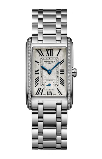 Orologio al quarzo, 23.30 x 37.00 mm, acciaio inossidabile, L5.512.0.71.6. Cassa con 46 diamanti top Wesselton IF-VVS incastonati, per un totale di 0.552 carati, impermeabile fino a 3 bar, vetro zaffiro antigraffio. Quadrante argento flinqué. Bracciale in acciaio inossidabile, con chiusura déployante a tripla sicurezza e meccanismo di apertura a pressione.