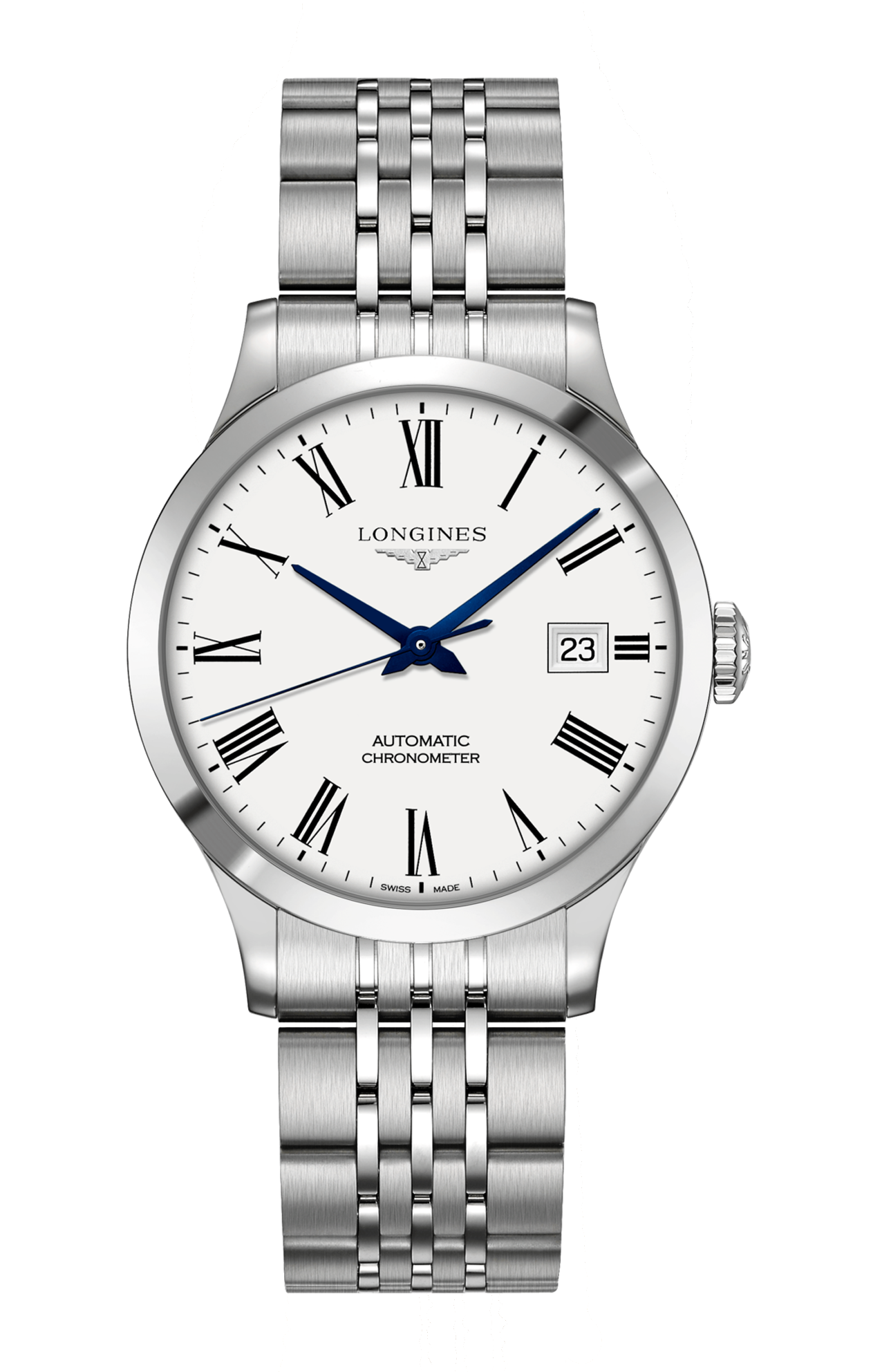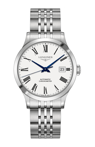 Orologio automatico, Ø 38.50 mm, acciaio inossidabile, L2.820.4.11.6 Date, movimento meccanico a carica automatica con frequenza di 25'200 alternanze orarie e riserva di carica di circa 72 ore, bilanciere-spirale in silicio monocristallino. Impermeabile fino a 3 bar, vetro zaffiro antigraffio bombato con trattamento antiriflesso multistrato sul lato interno. Quadrante bianco mat. Bracciale in acciaio inossidabile, con chiusura déployante a tripla sicurezza e meccanismo di apertura a pressione.