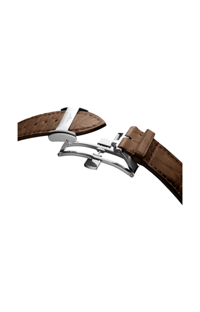 Movimento meccanico a carica automatica con frequenza di 25'200 alternanze orarie e riserva di carica di circa 72 ore, bilanciere-spirale in silicio monocristallino. Impermeabile fino a 3 bar, vetro zaffiro antigraffio con trattamento antiriflesso multistrato su entrambi i lati. Quadrante argento. Bracciale in cinturino in alligatore, con chiusura déployante a tripla sicurezza e meccanismo di apertura a pressione.