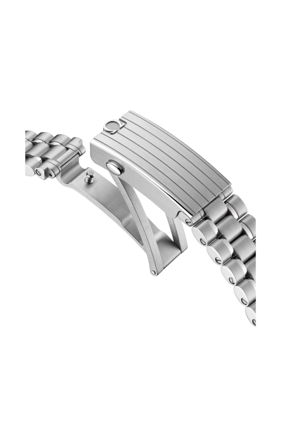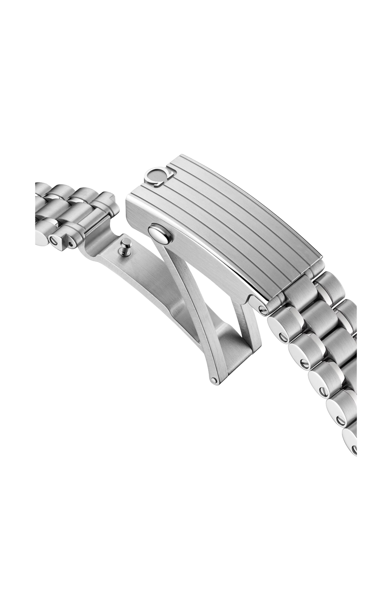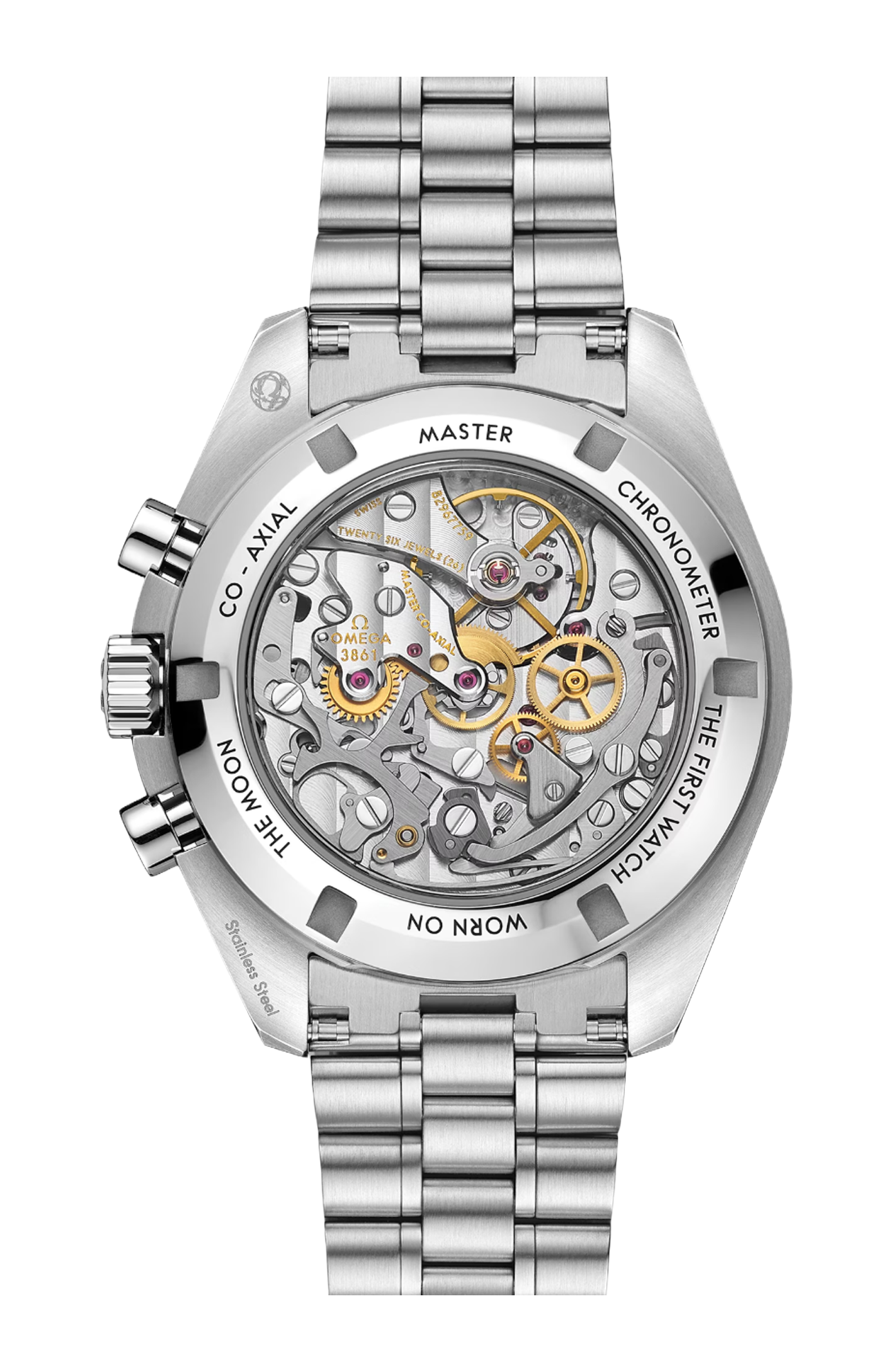 Questo modello da 42 mm si distingue per il vetro zaffiro su quadrante e fondello, ed è corredato da un bracciale in acciaio inossidabile lucido e spazzolato. Il design trae ispirazione dalla quarta generazione di Speedmaster indossati sulla Luna. Il quadrante “step” nero verniciato e laccato con doppia platina è completato da contatori bianchi laccati e verniciati, disposti in cornici rodiate. Tra i dettagli spiccano il logo OMEGA, gli indici, le lancette in stile Moonwatch e il celebre “Dot over 90” sulla lunetta in ceramica nera.