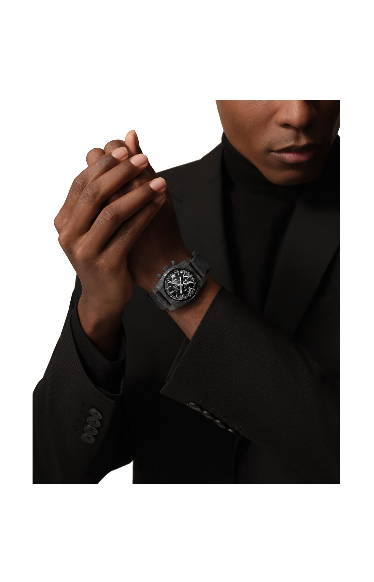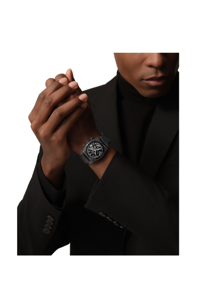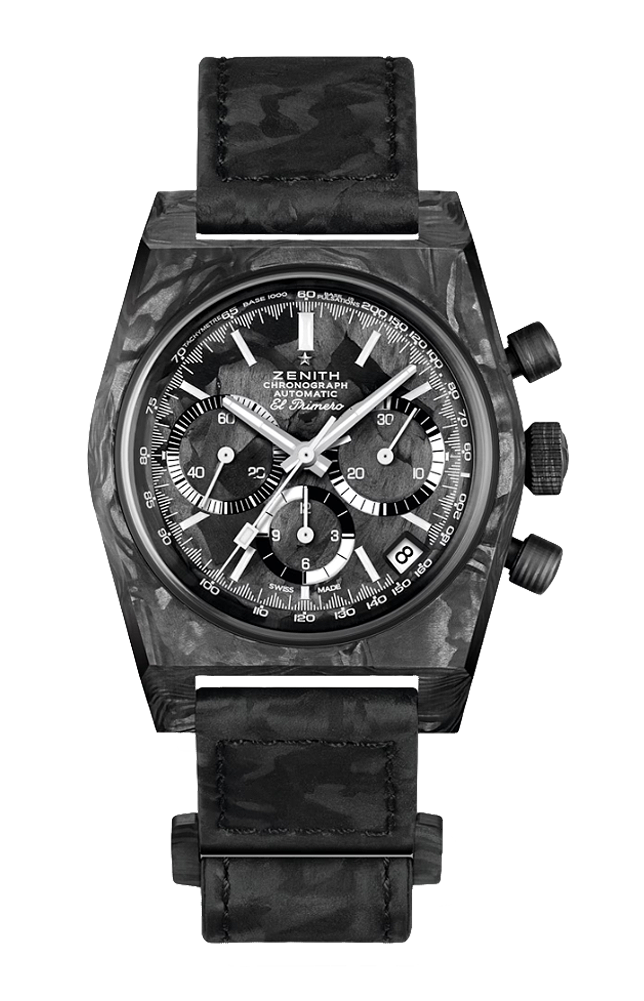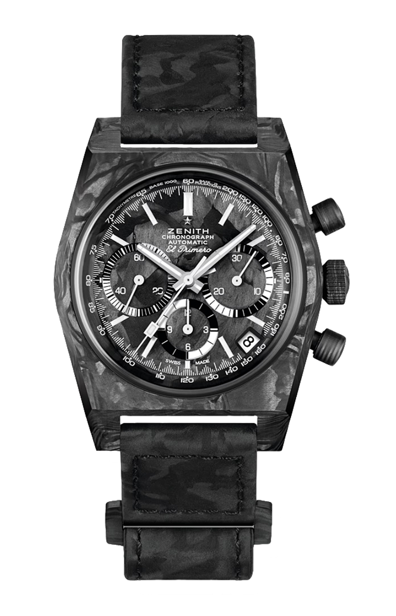 LO ZENITH CHRONOMASTER REVIVAL COVER GIRL CARBON È LA TERZA RIEDIZIONE ISPIRATA ALL’A3818 E PRESENTATA CON REVOLUTION. PIÙ LEGGERO CHE MAI, È DOTATO DI UNA CASSA IN COMPOSITO DI CARBONIO HIGH-TECH. IL QUADRANTE NERO IN CARBONIO PRESENTA INDICI DELLE ORE SFACCETTATI LUMINESCENTI. L’OROLOGIO È ANIMATO DAL CALIBRO CRONOGRAFICO AUTOMATICO AD ALTA FREQUENZA EL PRIMERO. UN’EDIZIONE LIMITATA DI 150 ESEMPLARI, FORNITI SIA CON CINTURINO IN VELCRO NERO EFFETTO “CARBONIO”, SIA CON CINTURINO IN PELLE DI VITELLO NERA GOFFRATA EFFETTO “SCALA”.