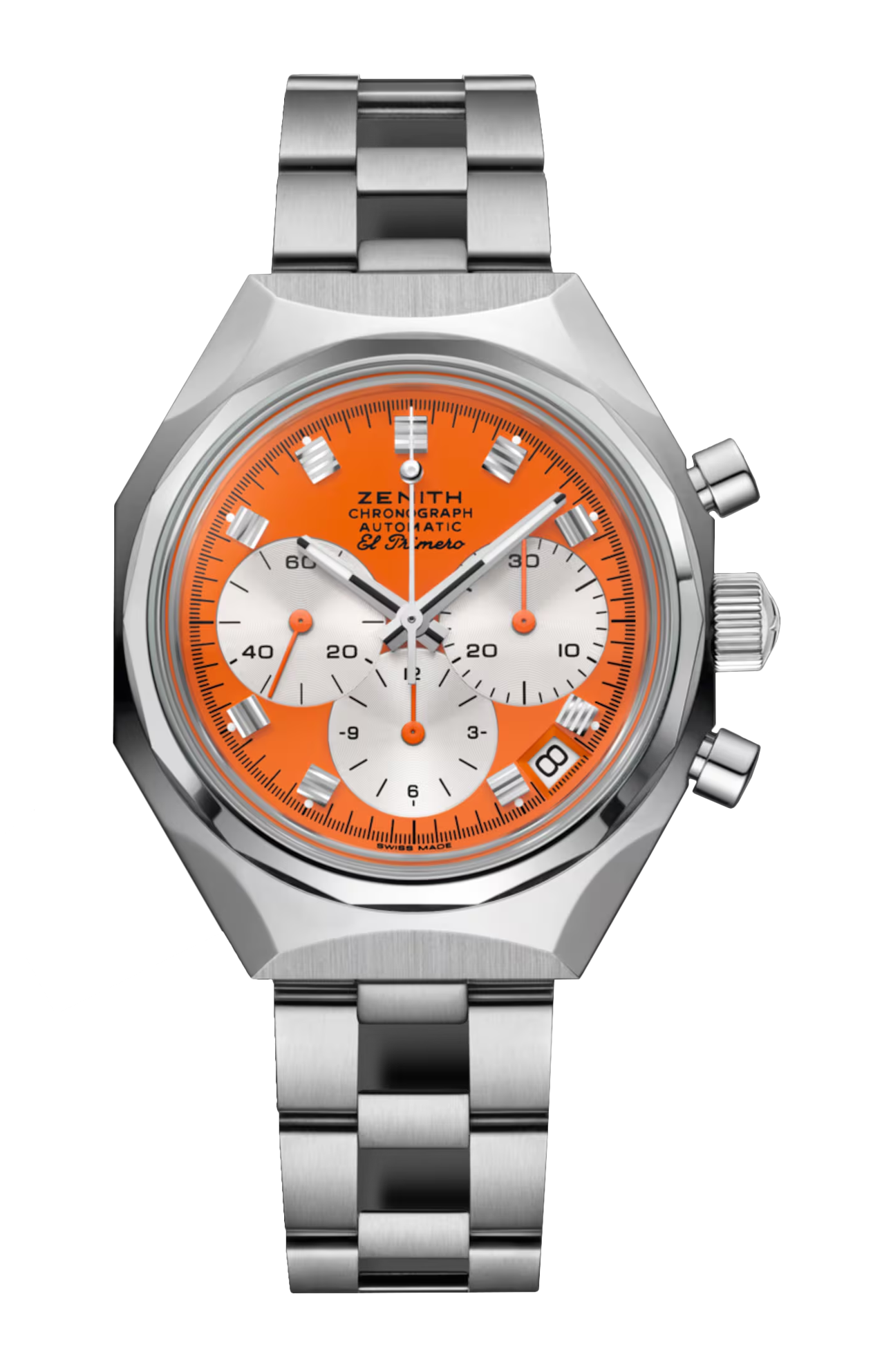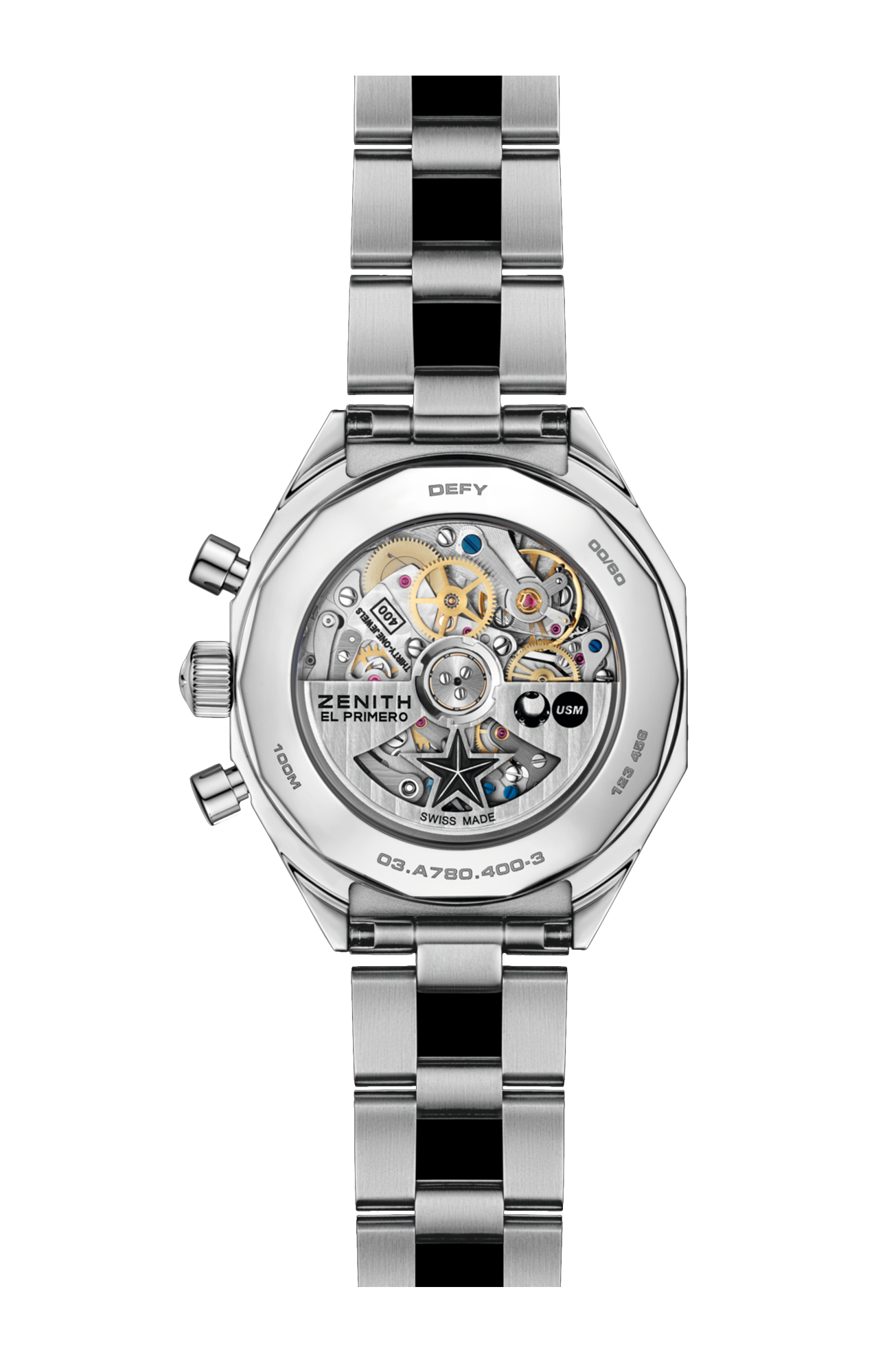 DUE PILASTRI DELL’ECCELLENZA SVIZZERA, ZENITH E USM MODULAR FURNITURE, SI UNISCONO PER IDEARE QUESTO AUDACE CRONOGRAFO CHE SI ISPIRA AI MODELLI DA POLSO DEFY DELLA FINE DEGLI ANNI ‘60, MA CHE È STATO RIVISITATO CON IL LEGGENDARIO MOVIMENTO CRONOGRAFICO AUTOMATICO EL PRIMERO AL SUO INTERNO. INCORPORA INOLTRE ELEMENTI DI DESIGN DEL SISTEMA USM HALLER, EMERSO NELLA STESSA EPOCA. LA CASSA OTTAGONALE IN ACCIAIO INOSSIDABILE OSPITA UN ACCATTIVANTE QUADRANTE USM PURE ORANGE. IL MODELLO È CORREDATO DALL’ICONICO BRACCIALE EFFETTO “SCALA” “GAY FRÈRES”.
