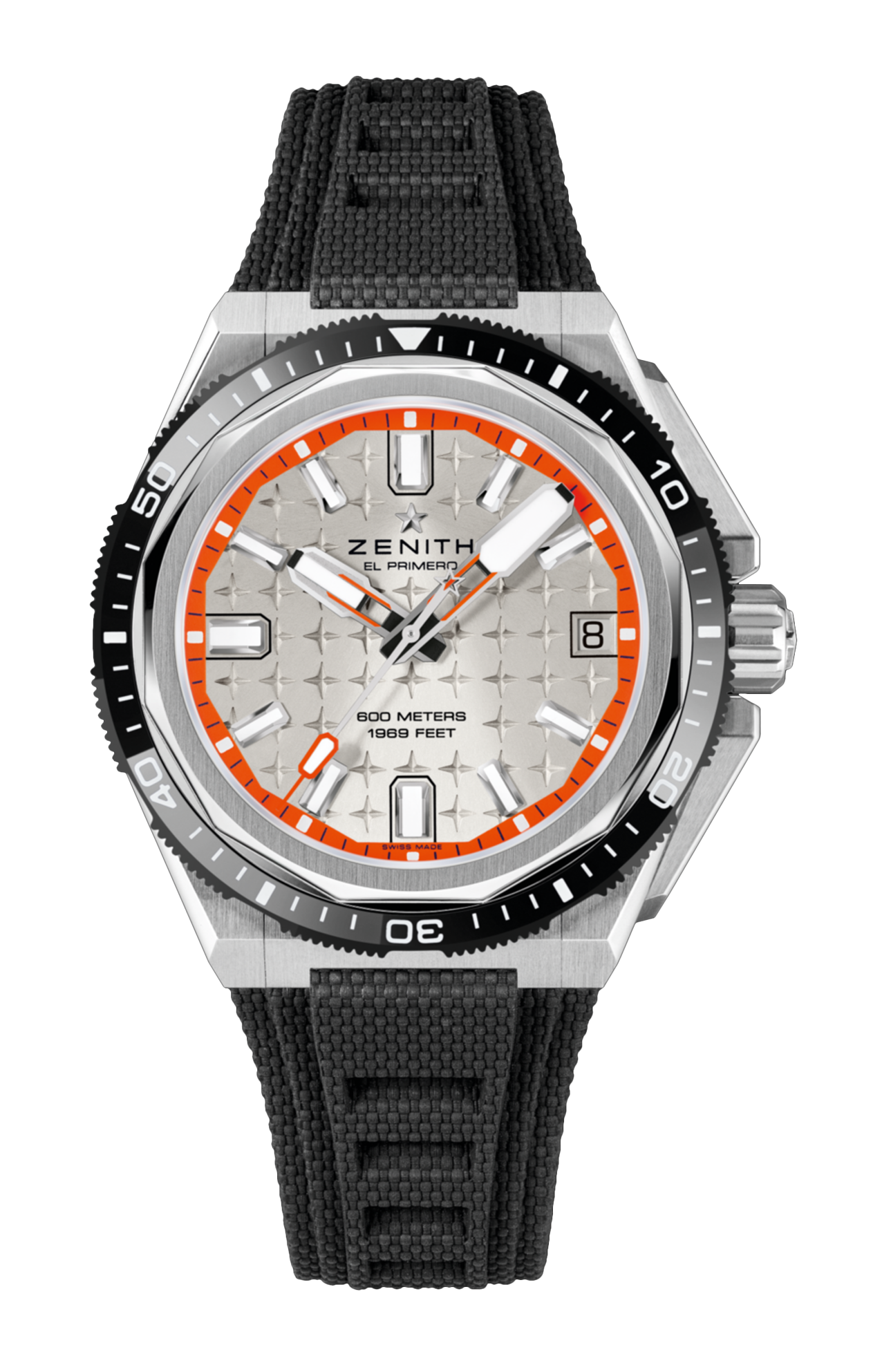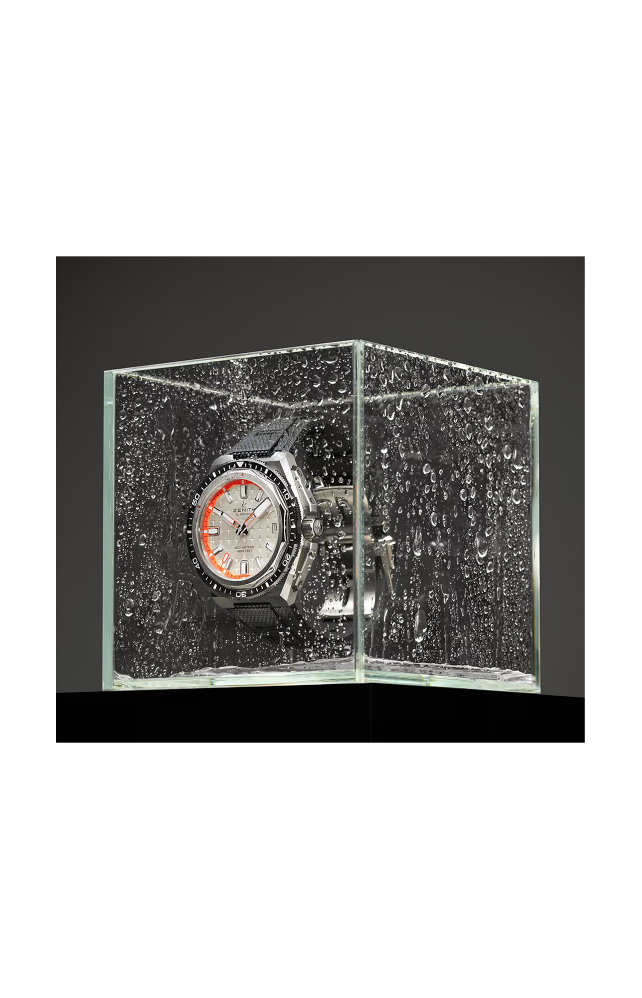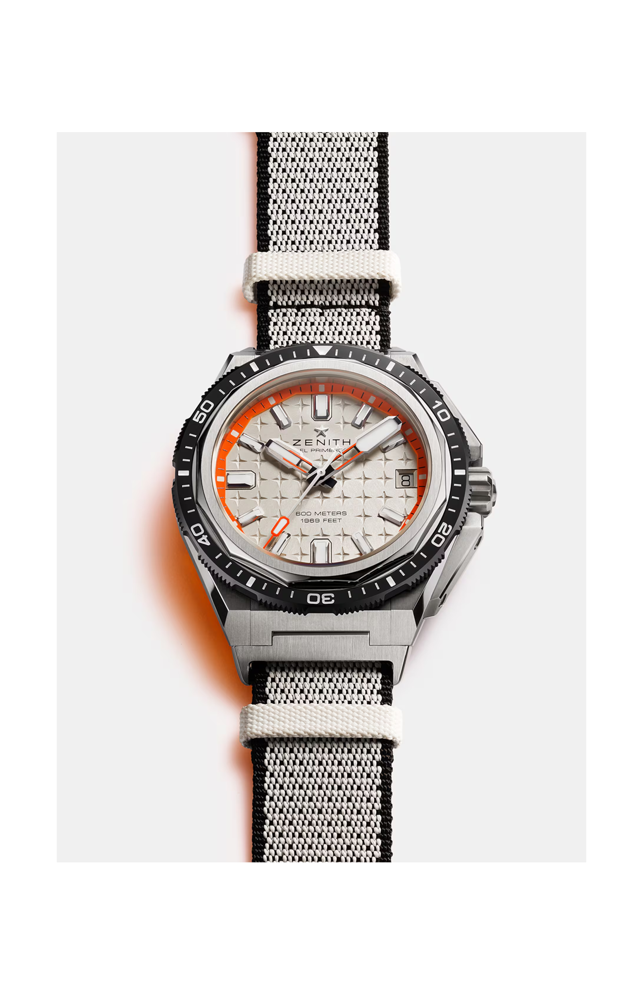 IL DEFY EXTREME DIVER CON CASSA ANGOLARE DA 42,5 MM IN TITANIO È DOTATO DI UNA LUNETTA GIREVOLE IN CERAMICA NERA E DI UNA VALVOLA PER LA FUORIUSCITA DELL’ELIO CON IMPERMEABILITÀ FINO A 60 ATM (600 METRI). PRESENTA UN QUADRANTE ARGENTO CON MOTIVO A STELLE E INDICI E LANCETTE LUMINESCENTI. ANIMATO DAL MOVIMENTO AUTOMATICO EL PRIMERO 3620 SC CON RISERVA DI CARICA DI 60 ORE. SISTEMA DI CINTURINI INTERCAMBIABILI CON BRACCIALE IN TITANIO, CINTURINO IN CAUCCIÙ E CINTURINO IN TESSUTO MONOPEZZO REALIZZATO CON RETI DA PESCA RICICLATE.