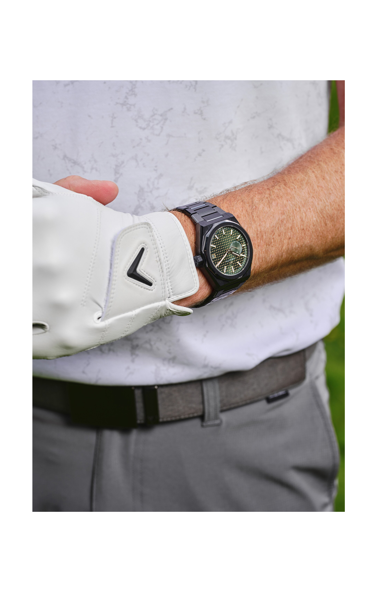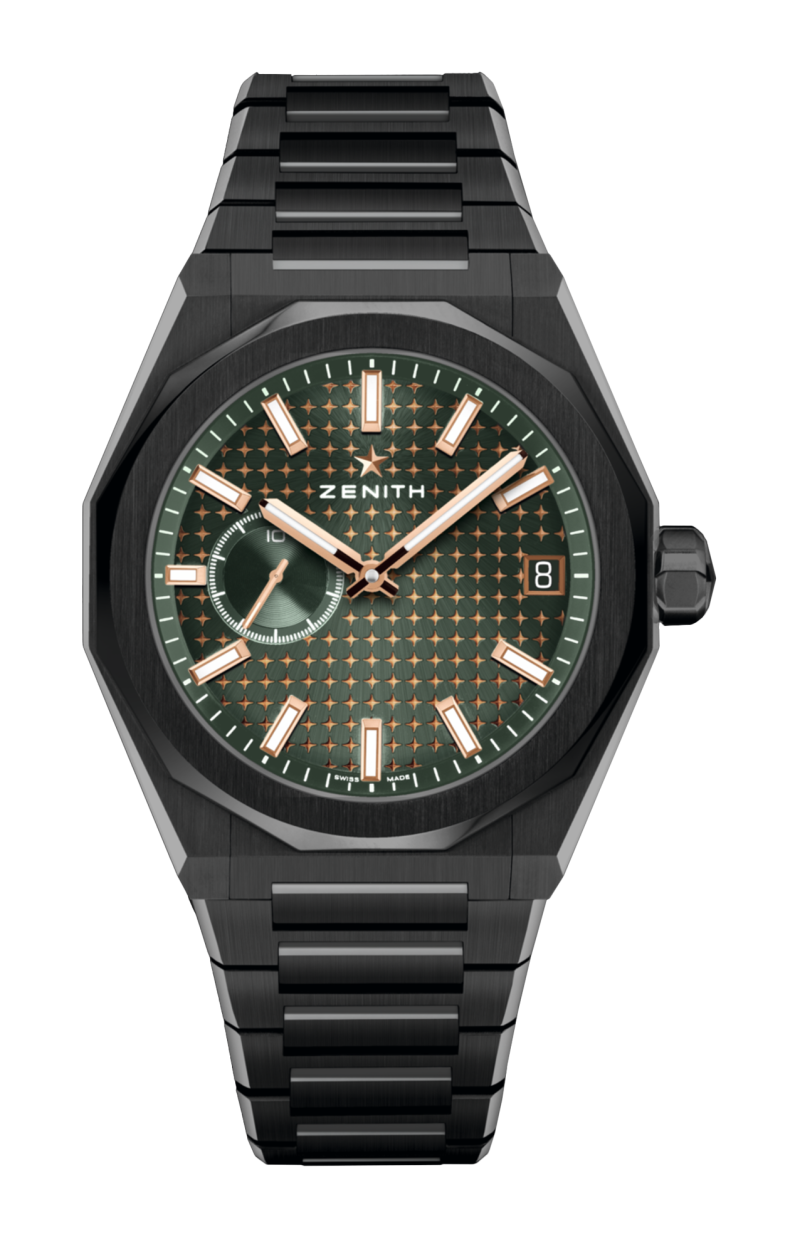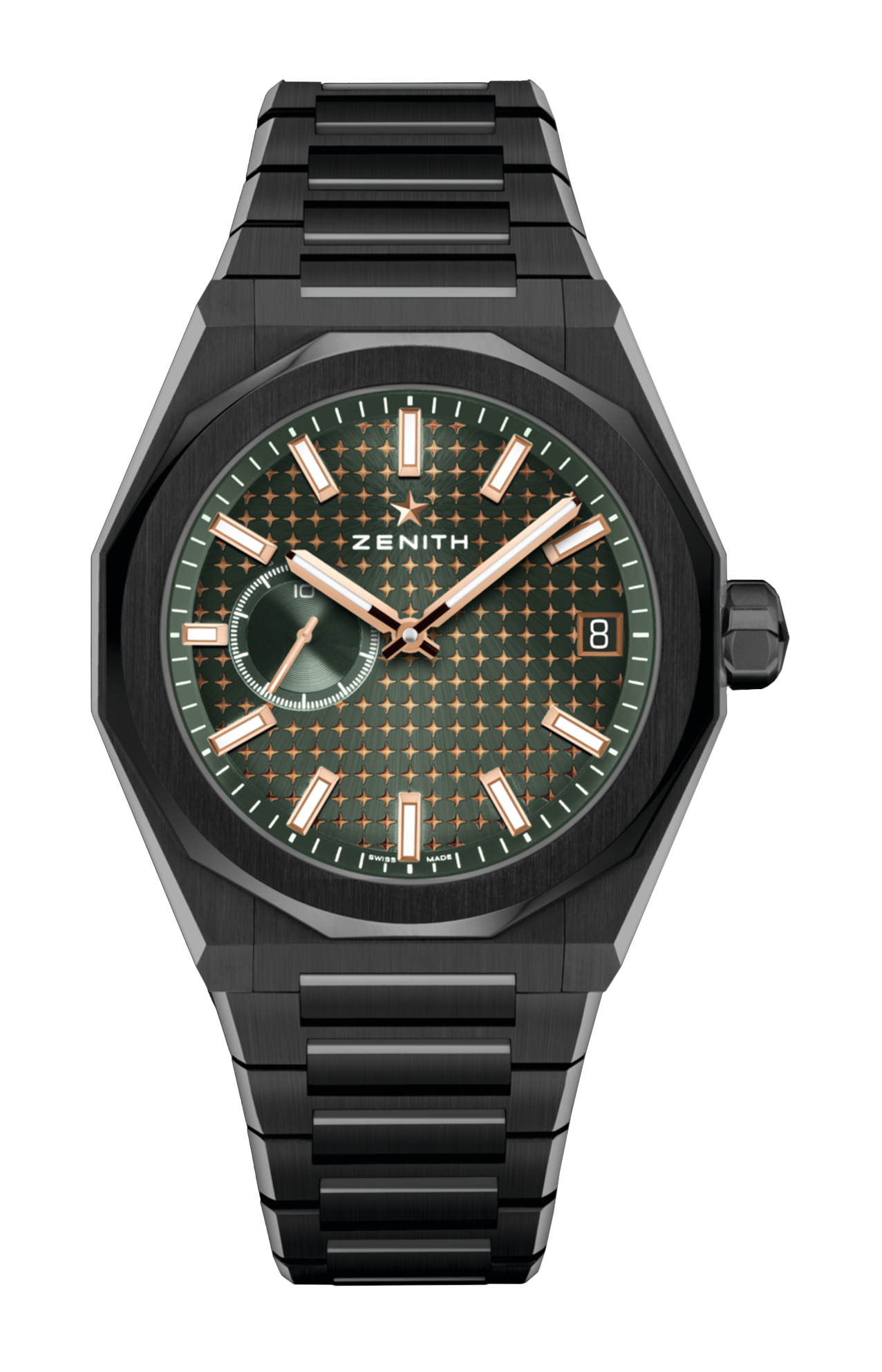 DEFY SKYLINE AMERICAS EDITION CON CASSA OTTAGONALE DI 41 MM IN CERAMICA NERA E LUNETTA SFACCETTATA, CARATTERIZZATO DA QUADRANTE VERDE INTENSO EFFETTO “SOLEIL” CON MOTIVO INCISO TONALITÀ ORO ROSA CHE RIVISITA L’EMBLEMATICA STELLA A QUATTRO PUNTE DI ZENITH. ANIMATO DAL MOVIMENTO AUTOMATICO DI MANIFATTURA AD ALTA FREQUENZA EL PRIMERO 3620 DOTATO DEL PRIMISSIMO INDICATORE CON PRECISIONE AL 1/10 DI SECONDO. BRACCIALE IN CERAMICA INTERCAMBIABILE CON UN CINTURINO IN CAUCCIÙ VERDE SCURO CON MOTIVO.