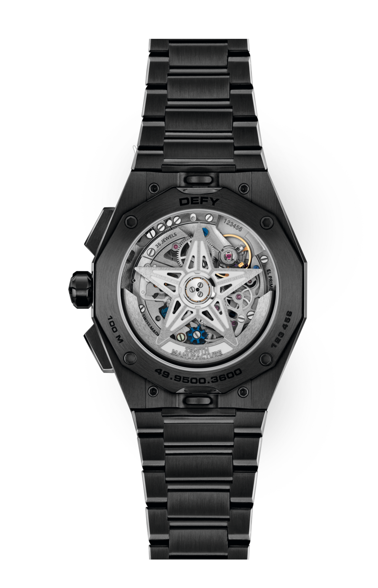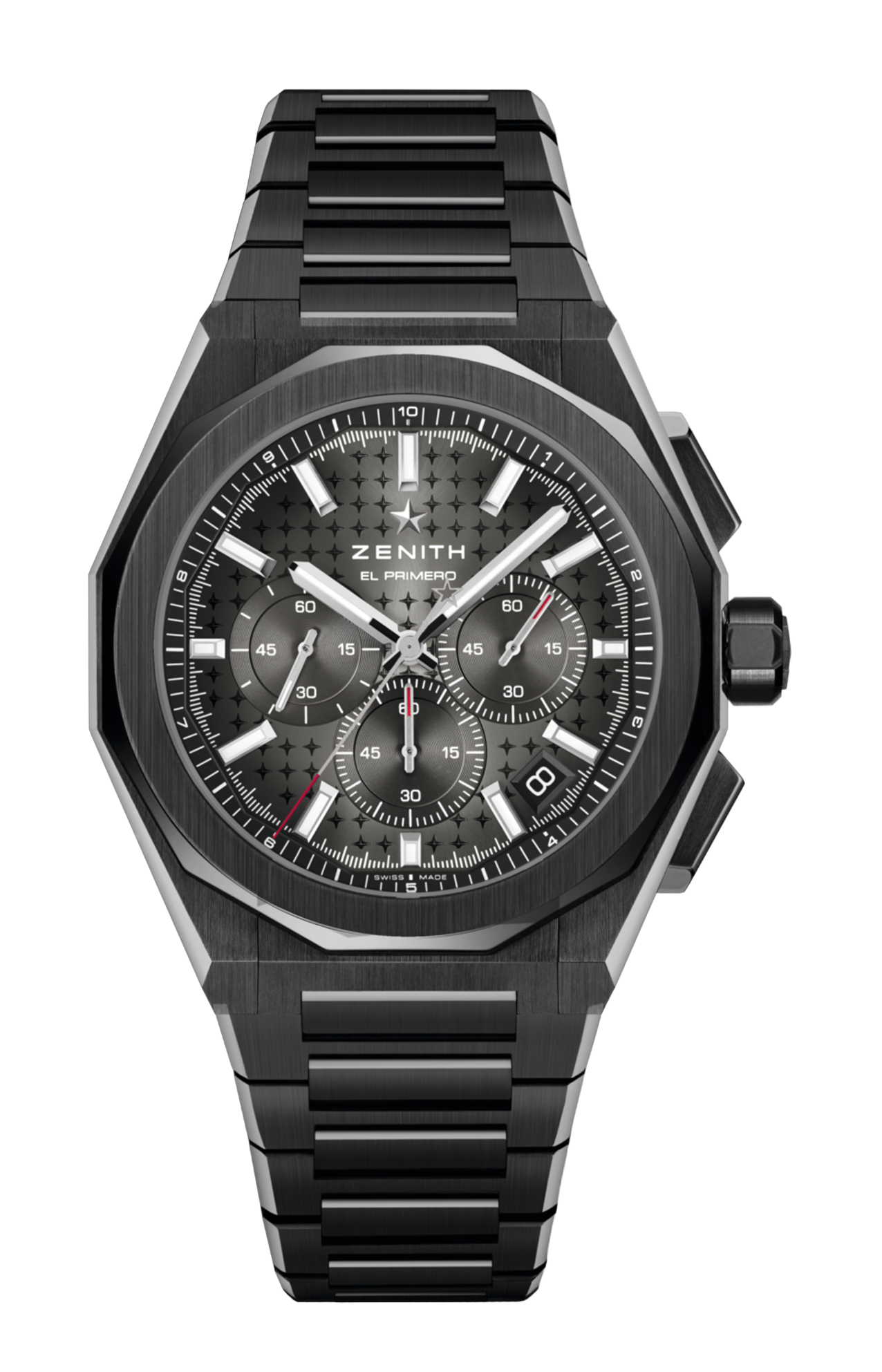 DEFY Skyline Chronograph con cassa ottagonale da 42 mm in ceramica nera e lunetta sfaccettata. Il quadrante grigio sfumato presenta un motivo a volta stellata. Animato dal movimento automatico di manifattura El Primero 3600, un cronografo con ruota a colonne ad alta frequenza dotato del primissimo indicatore con precisione al 1/10 di secondo. Dotato di un bracciale in ceramica nera e di un cinturino in caucciù nero, facilmente intercambiabili grazie all’ingegnoso sistema di sostituzione.