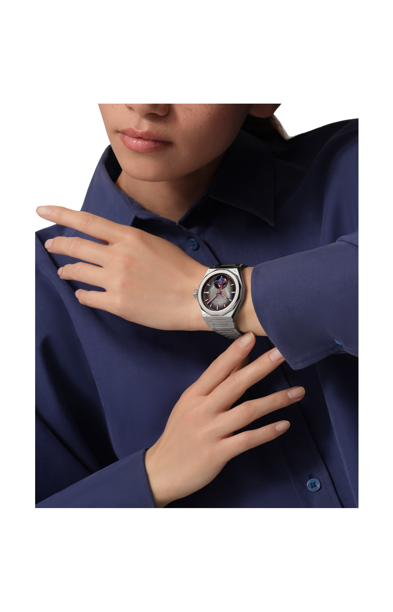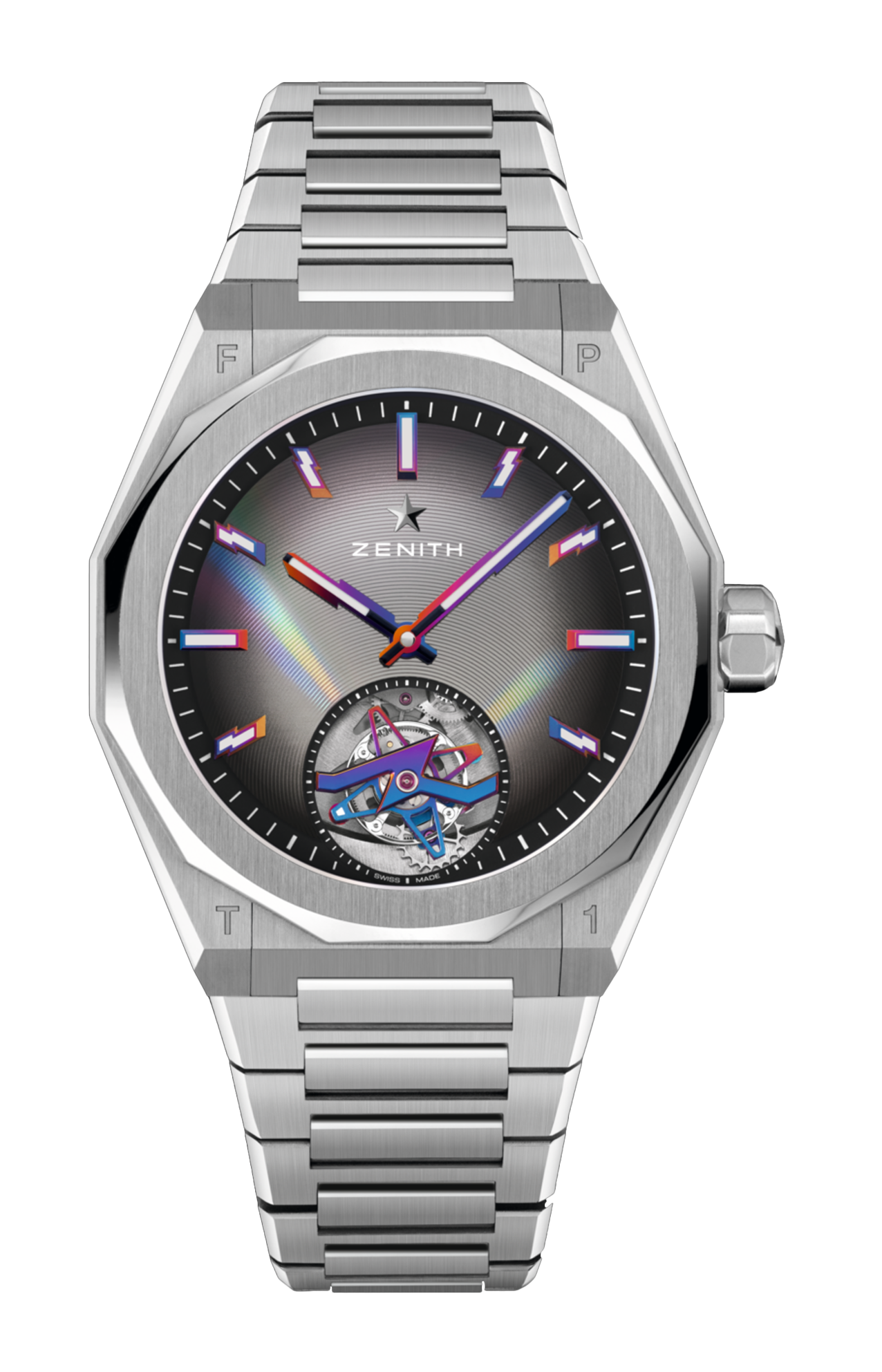 IL DEFY SKYLINE TOURBILLON FELIPE PANTONE È UN’EDIZIONE LIMITATA DI 100 ESEMPLARI REALIZZATA IN COLLABORAZIONE CON L’ARTISTA CONTEMPORANEO DI FAMA MONDIALE. CARATTERIZZATO DA UNA CASSA OTTAGONALE DI 41 MM CON UNA LUNETTA SFACCETTATA, È DOTATO DI VETRO ZAFFIRO CON MOTIVO MICRO-INCISO ED ELEMENTI CON FINITURA PVD ARCOBALENO. L’APERTURA SUL QUADRANTE RIVELA IL TOURBILLON DA 60 SECONDI CON UN PONTE A FORMA DI SAETTA E UNA GABBIA A FORMA DI STELLA. ANIMATO DAL MOVIMENTO AUTOMATICO DI MANIFATTURA AD ALTA FREQUENZA EL PRIMERO 3630 DOTATO DI RISERVA DI CARICA DI 60 ORE. BRACCIALE IN ACCIAIO INTERCAMBIABILE E CINTURINO IN CAUCCIÙ NERO CON MOTIVO ISPIRATO ALL’ICONICA STELLA ZENITH.