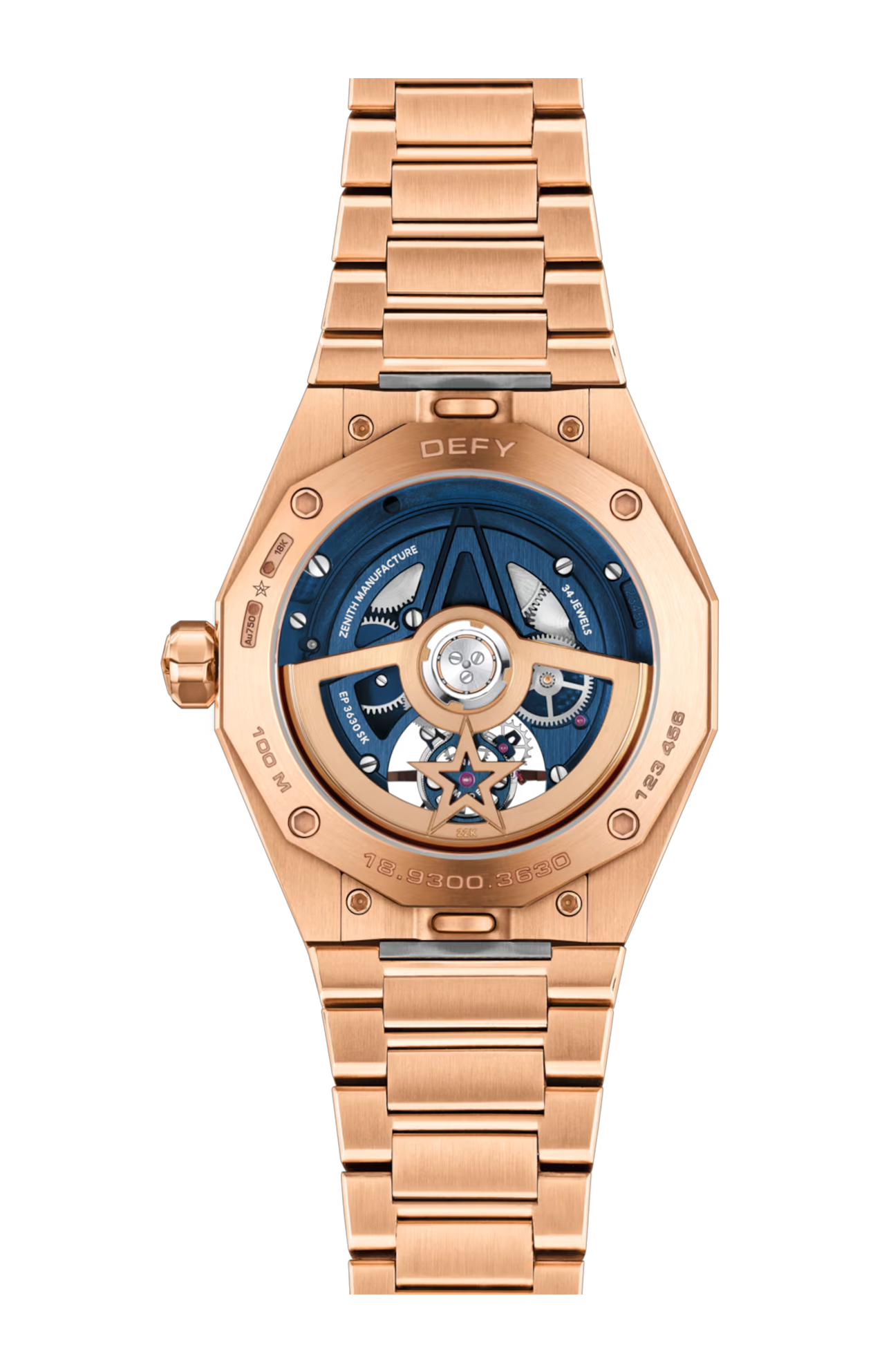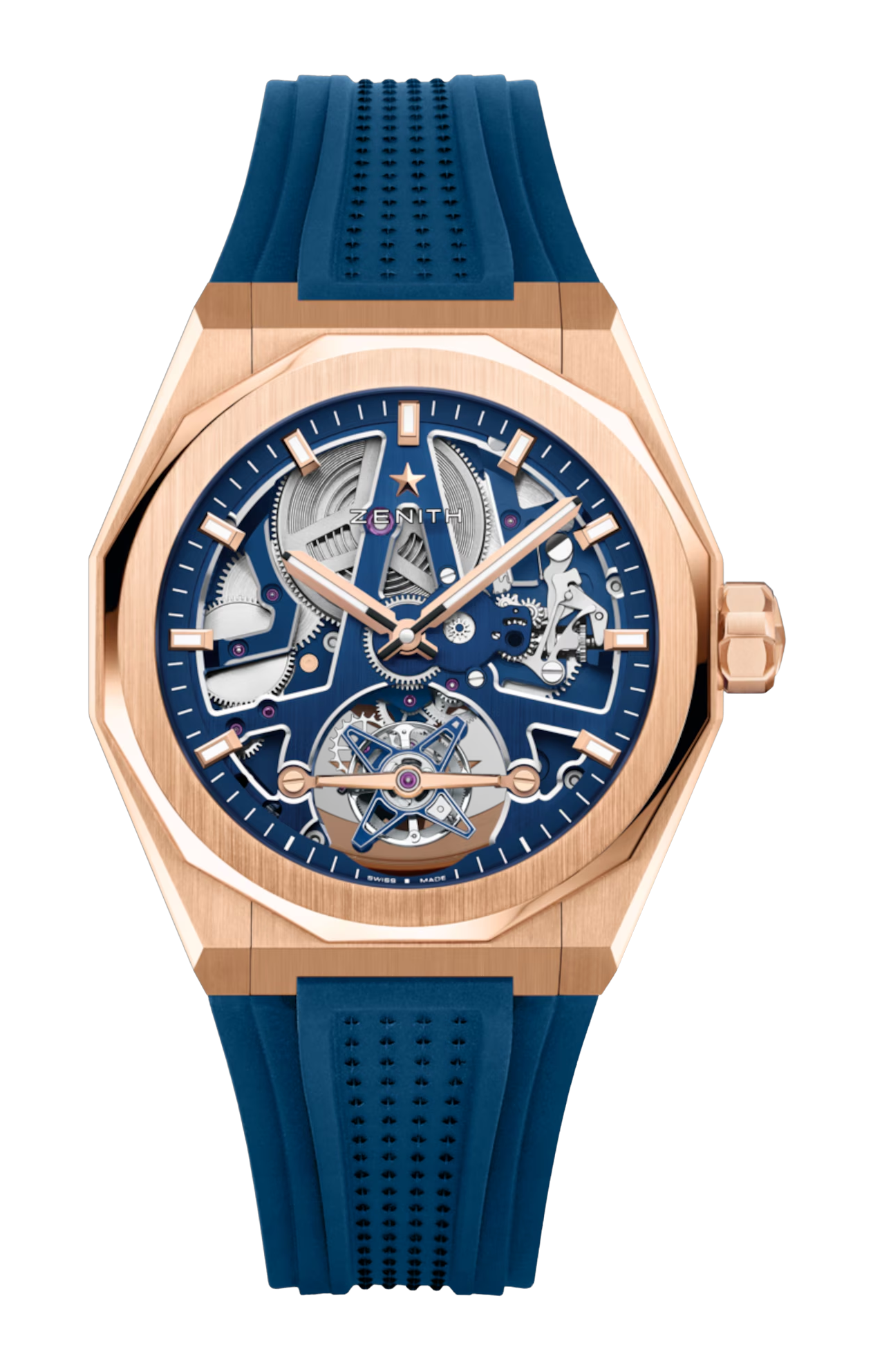 ZENITH presenta il primo DEFY Skyline Tourbillon Skeleton, un segnatempo caratterizzato da un’architettura audace, da una trasparenza innovativa e da un equilibrio meccanico. Il movimento El Primero scheletrato in blu intenso è sospeso in una radiosa cassa in oro rosa, la cui silhouette angolare cattura la luce ad ogni movimento del polso. Al contempo, la rotazione ad alta frequenza del tourbillon evoca una città pulsante di energia. Fedele al carattere di questa linea, il movimento scheletrato è costruito come uno skyline meccanico, dove la precisione trasparente incontra il design urbano. Il sistema di cinturini intercambiabili permette di alternare il bracciale in oro rosa al cinturino in caucciù blu per una perfetta versatilità.