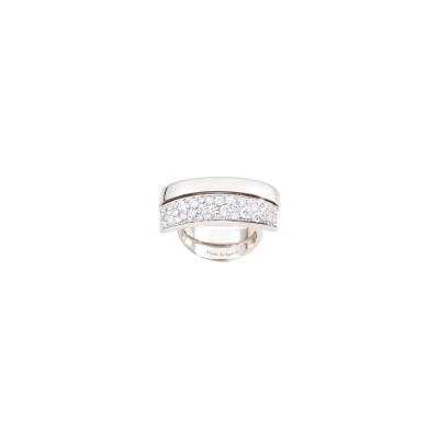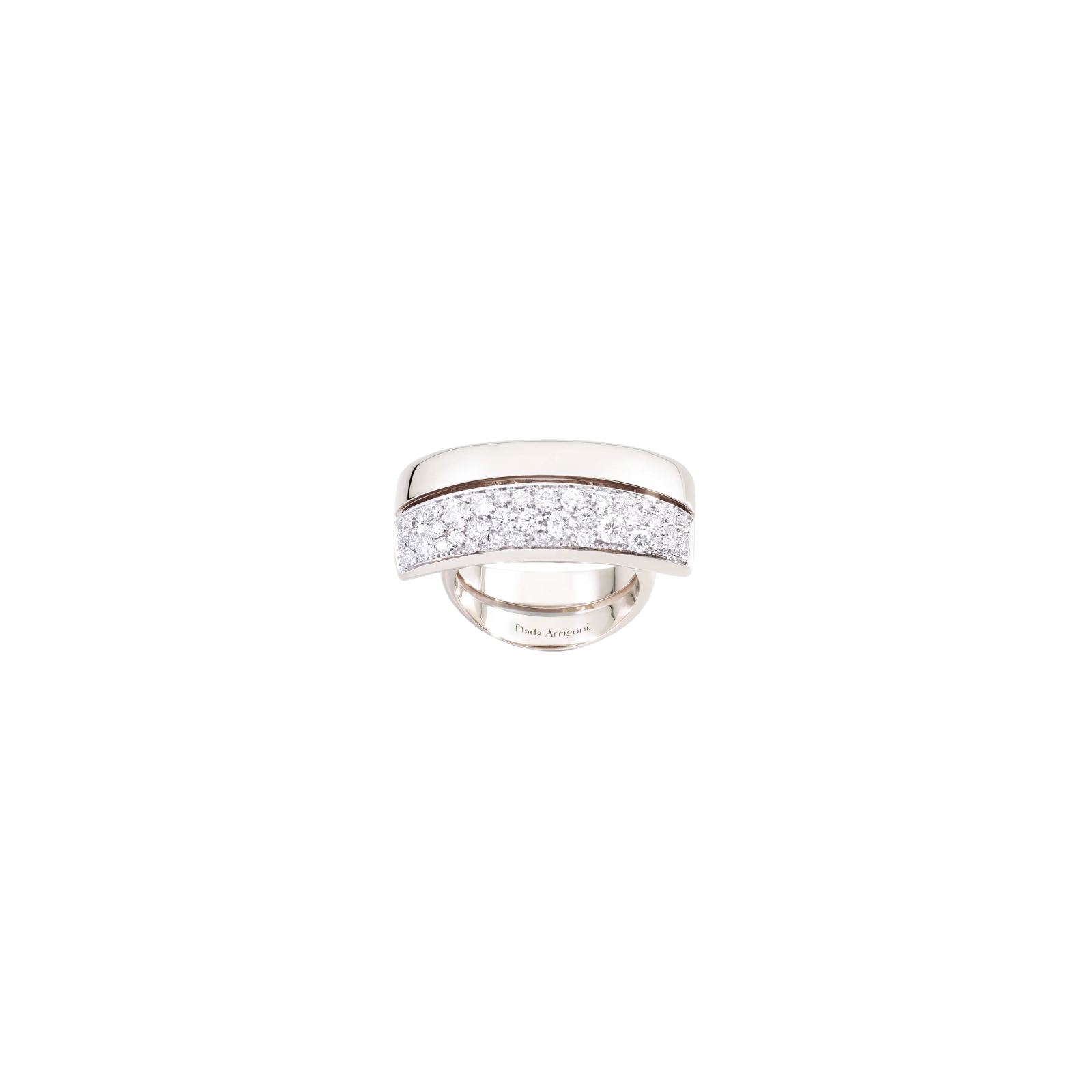 Anello in oro 18K e pavè in diamanti. La forma geometrica dal design minimalista gioca sulla netta separazione tra oro e diamanti, divisi da una linea, uno spazio vuoto, che crea un vibrante contrasto e percorre tutta la forma del gioiello, compreso il gambo dell'anello.