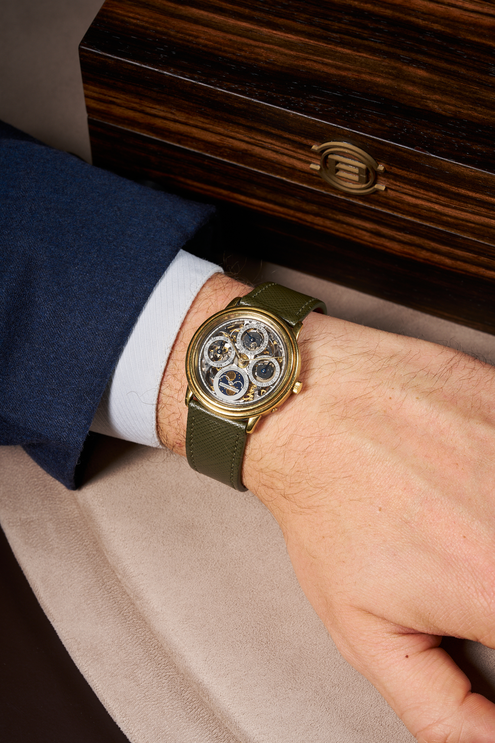Il quadrante è interamente scheletrato, privo di base opaca: le lancette e gli indici emergono direttamente dalla trama meccanica sottostante. Gli indici luminescenti e le lancette trattate garantiscono la leggibilità anche in condizioni di scarsa illuminazione, compensando la complessità visiva tipica di un layout scheletrato con complicazioni multiple. La disposizione dei sottoquadranti e delle finestre per le indicazioni del calendario è studiata per mantenere un equilibrio estetico coerente con l'identità visiva della Maison.