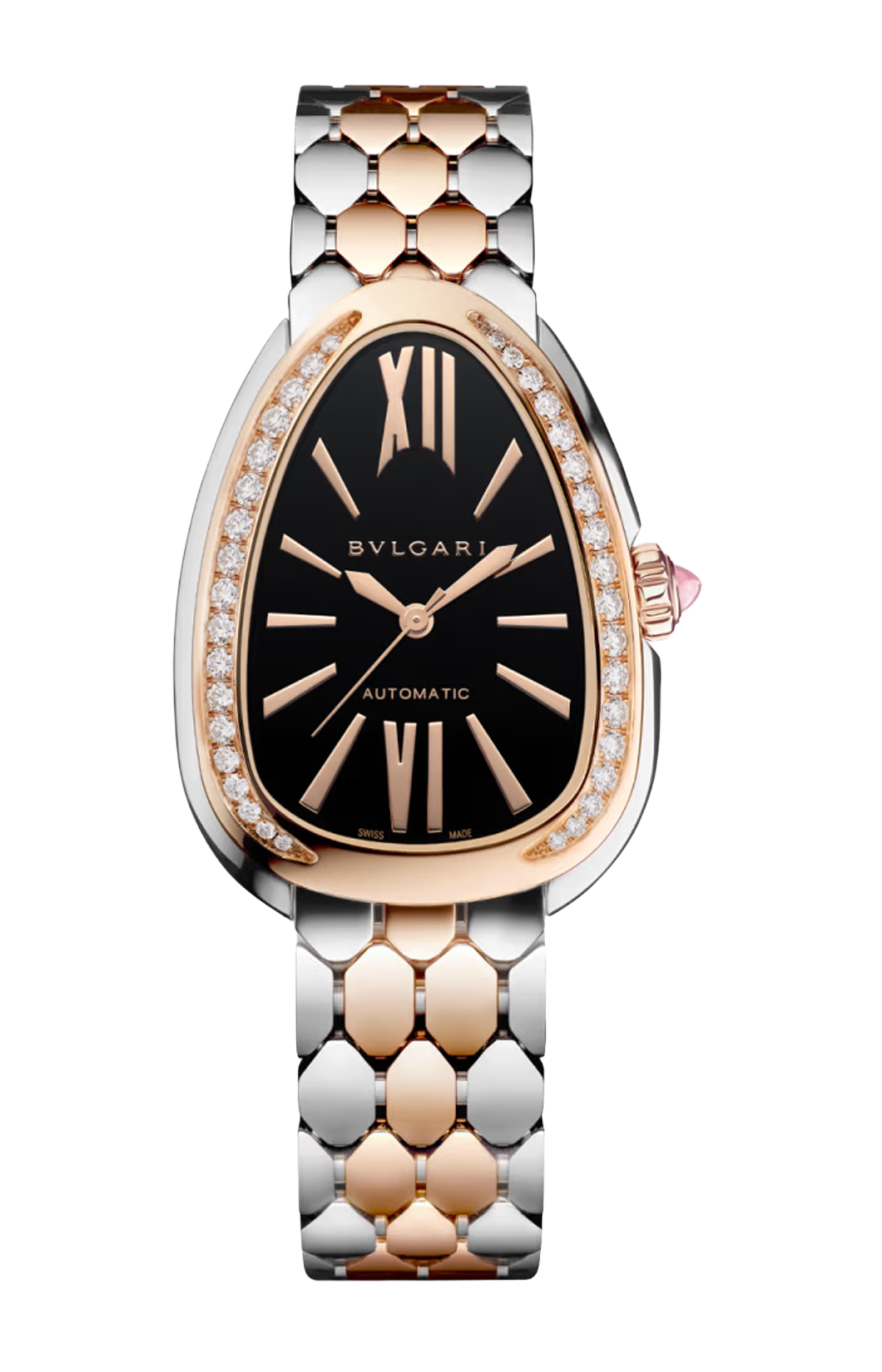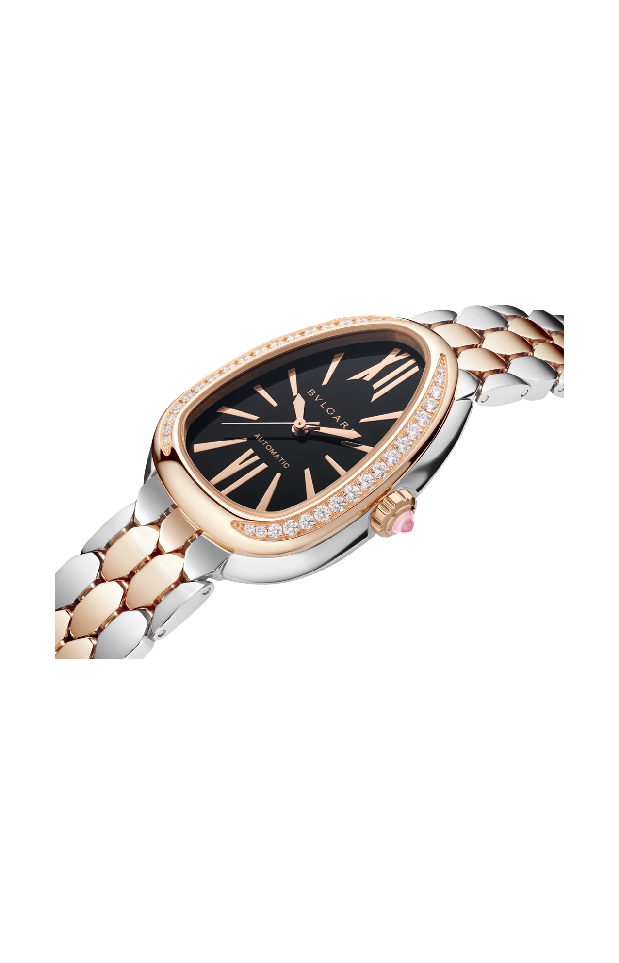Emblema di sensualità, fascino enigmatico e glamour contemporaneo, l'orologio Serpenti Seduttori in oro rosa 18 kt e acciaio inossidabile rende il tempo ancor più prezioso. Alimentato da un movimento meccanico a carica automatica, l'orologio presenta un quadrante laccato nero contornato dall'iconico design a goccia della cassa e illuminato da una lunetta con diamanti, per un effetto sofisticato e scintillante. Un perfetto connubio tra gioielleria e orologeria, suggellato da un avvolgente e flessuoso bracciale a squame esagonali ispirato al serpente. Orologio Serpenti Seduttori con movimento meccanico di manifattura a carica automatica, calibro Lady Solotempo BVS100, funzioni ore, minuti e secondi, riserva di carica di 50 ore. Cassa di 34 mm in acciaio inossidabile, lunetta in oro rosa 18 kt con diamanti taglio brillante, corona in oro rosa 18 kt con rubellite rosa taglio cabochon, quadrante laccato nero, lancette e indici placcati oro rosa, bracciale in oro rosa 18 kt e acciaio inossidabile con fibbia déployante. Impermeabile fino a 30 metri.