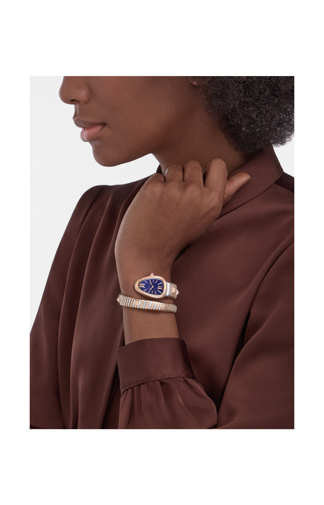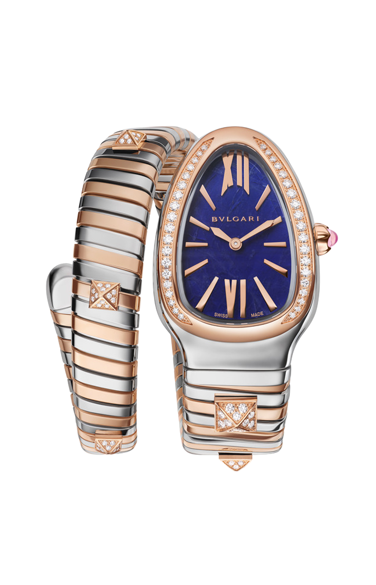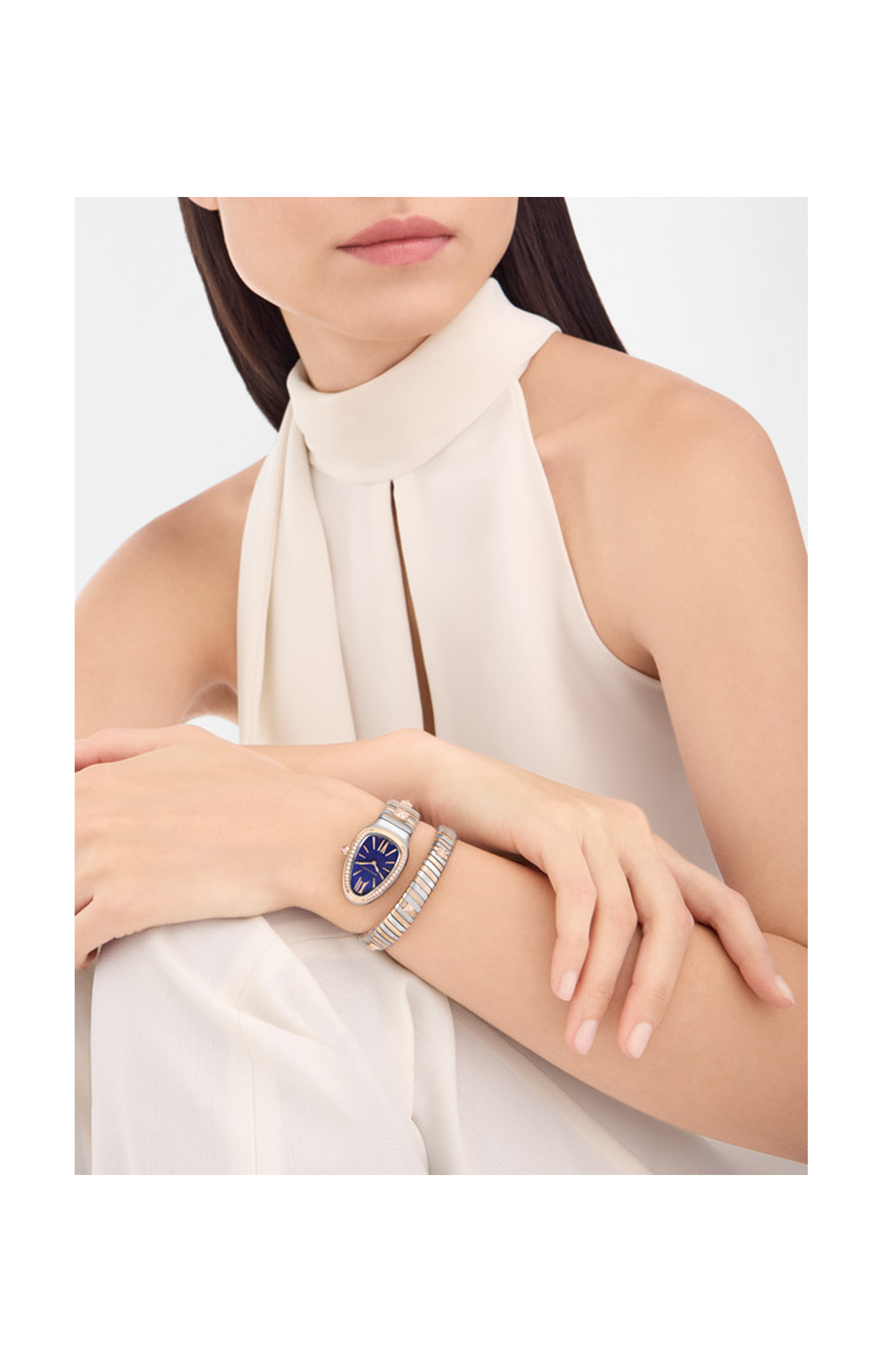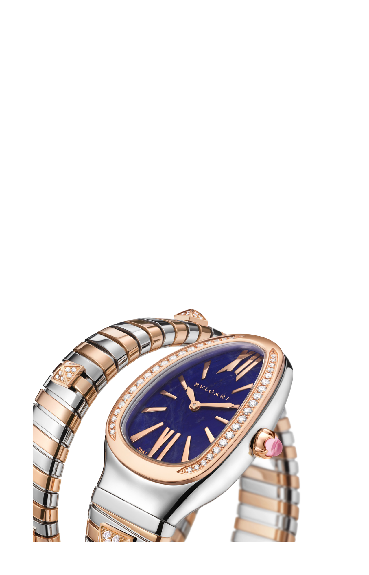 Misura 135 mm. Movimento al quarzo. Cassa acciaio e oro giallo 18 carati 35 mm, lunetta tempestata di diamanti, quadrante blu, bracciale acciaio, oro giallo 18 carati e diamanti. Funzioni ore, minuti. Impermeabilità 30 metri.