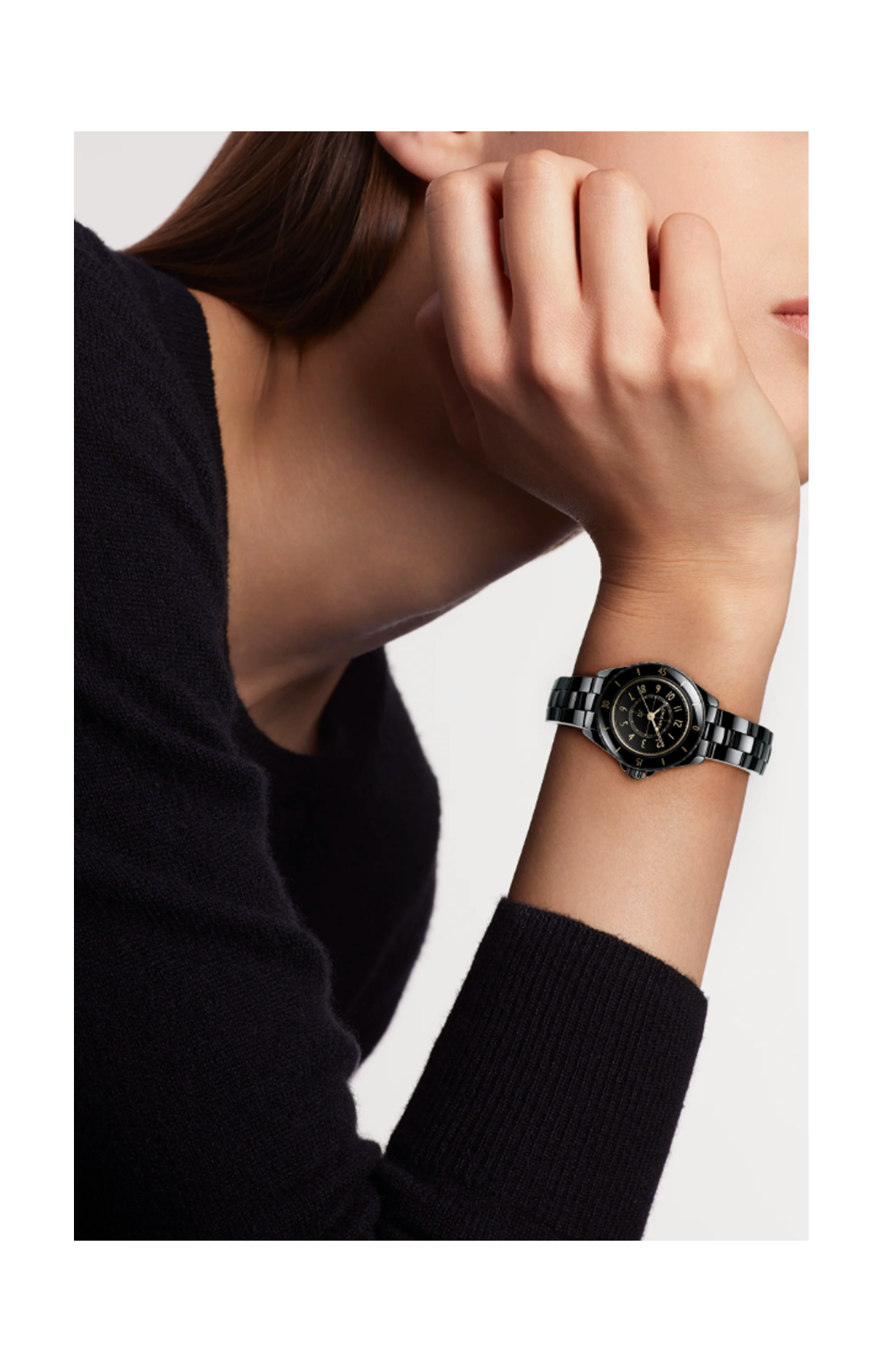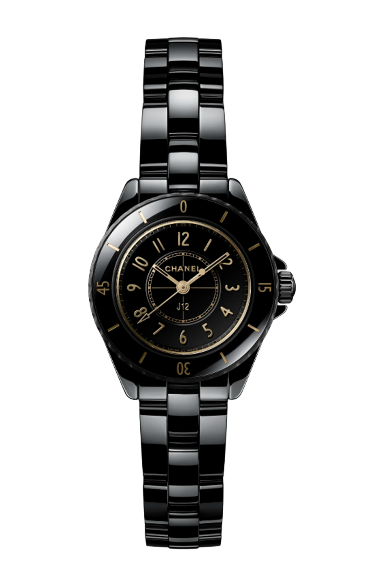 J come le leggendarie barche a vela da regata che hanno ispirato il J12: le imbarcazioni classe J. Cassa in ceramica nera ad alta resistenza e acciaio con rivestimento nero opaco. Corona non avvitata in acciaio con rivestimento nero e cabochon in ceramica nera ad alta resistenza. Lunetta fissa in acciaio con rivestimento nero opaco e anello in ceramica nera ad alta resistenza. Quadrante laccato nero con indici placcati oro giallo. Movimento al quarzo ad alta precisione. Bracciale in ceramica nera ad alta resistenza e tripla chiusura pieghevole in acciaio. Ore, Minuti, Secondi. Dimensioni 28 x 8,8 mm. Impermeabilità 30 m.