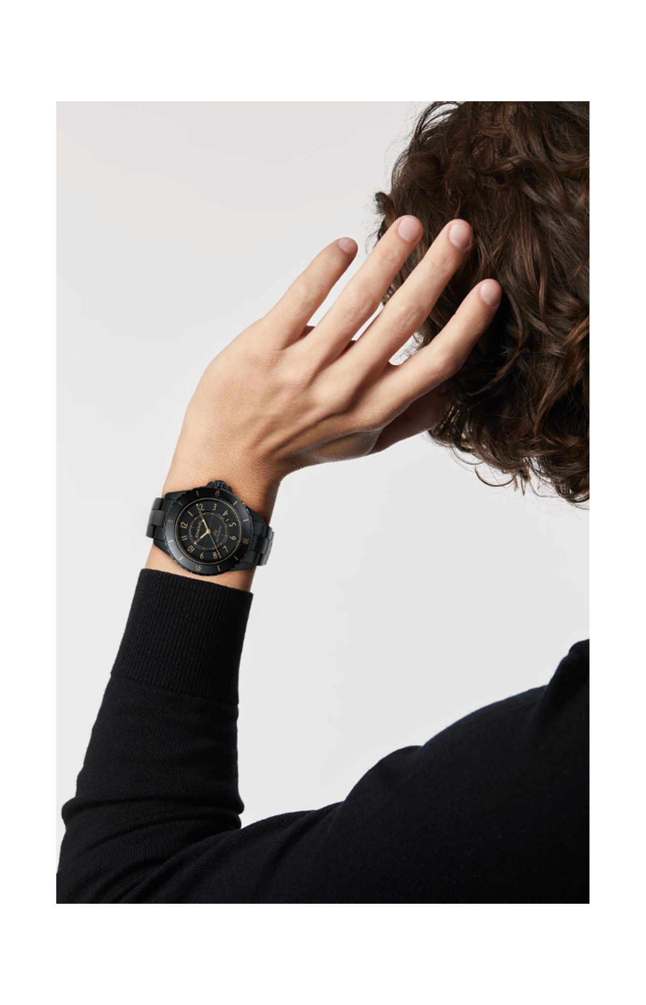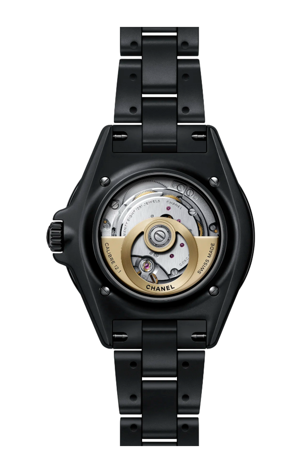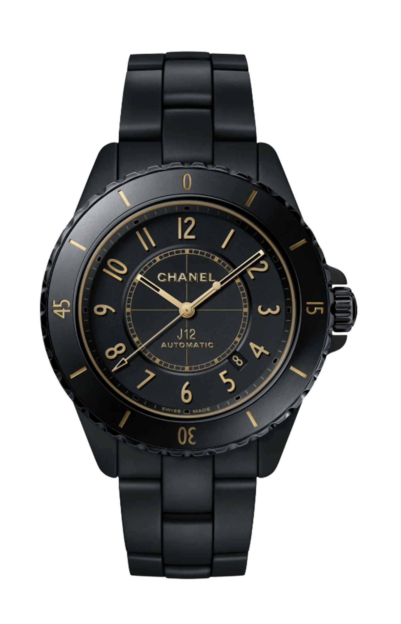 J come le leggendarie barche a vela da regata che hanno ispirato il J12: le imbarcazioni classe J. Cassa in ceramica nera opaca ad alta resistenza e acciaio con rivestimento nero. Corona avvitata in acciaio con rivestimento nero e cabochon in ceramica nera opaca ad alta resistenza. Lunetta girevole unidirezionale in acciaio con rivestimento nero e anello in ceramica nera opaca ad alta resistenza, Quadrante nero opaco con indici placcati oro giallo. Calibro 12.1, Movimento meccanico a carica automatica, ≈ 70 ORE. Bracciale in ceramica nera opaca ad alta resistenza e tripla chiusura pieghevole in acciaio. Ore, Minuti, Secondi. Dimensioni 42 x 12,5 mm. Impermeabilità 200 m.