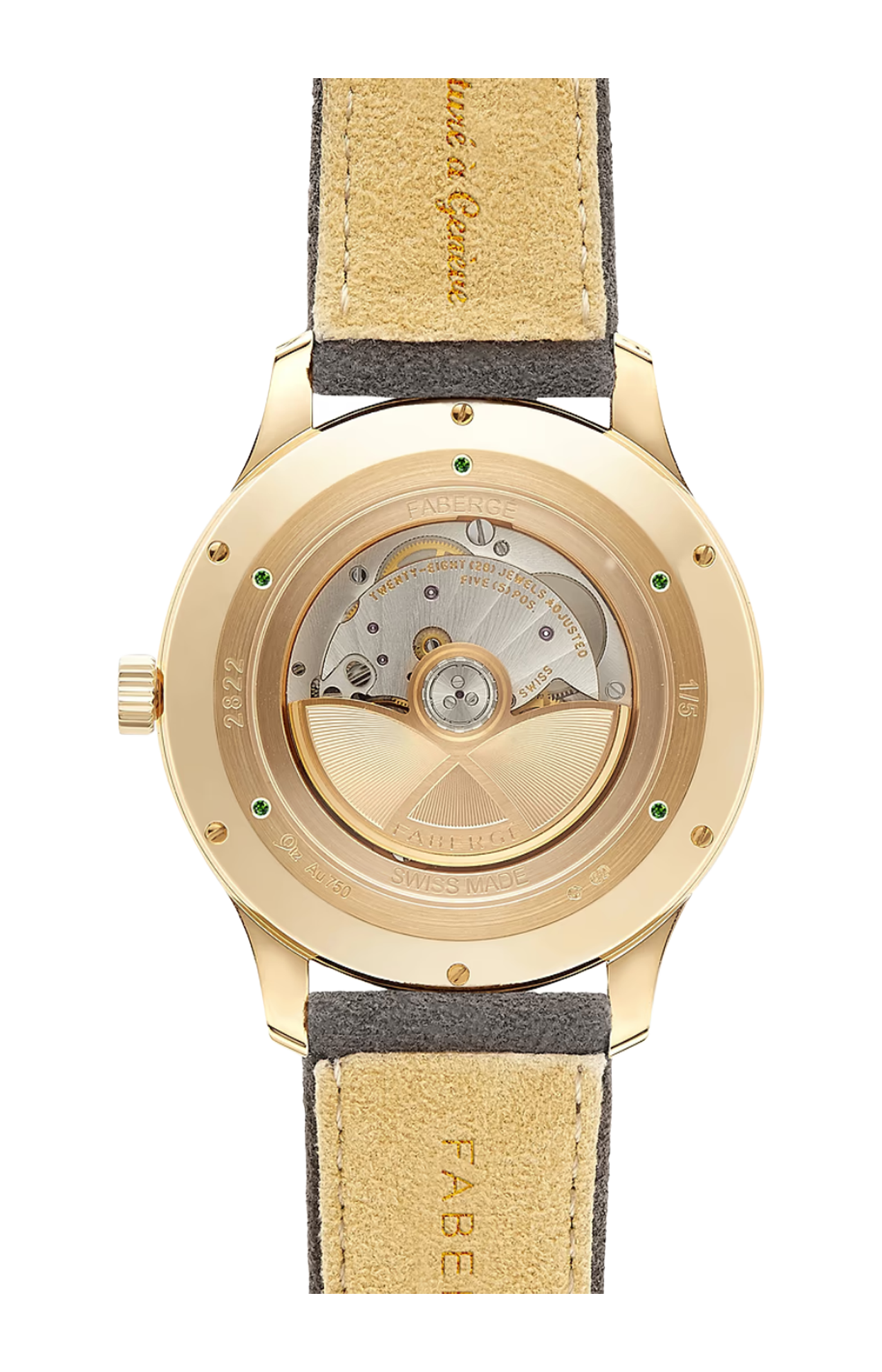 Una cassa in oro rosa 18 carati si abbina perfettamente al quadrante, con un fondello su misura su ogni orologio incastonato con cinque smeraldi dello Zambia Gemfields di provenienza responsabile. Si dice che gli smeraldi simboleggiano la speranza, la crescita, la vita, la fertilità e la pace. Su ogni fondello è inciso individualmente il numero del pezzo per dimostrare che si tratta di creazioni uniche e da collezione.