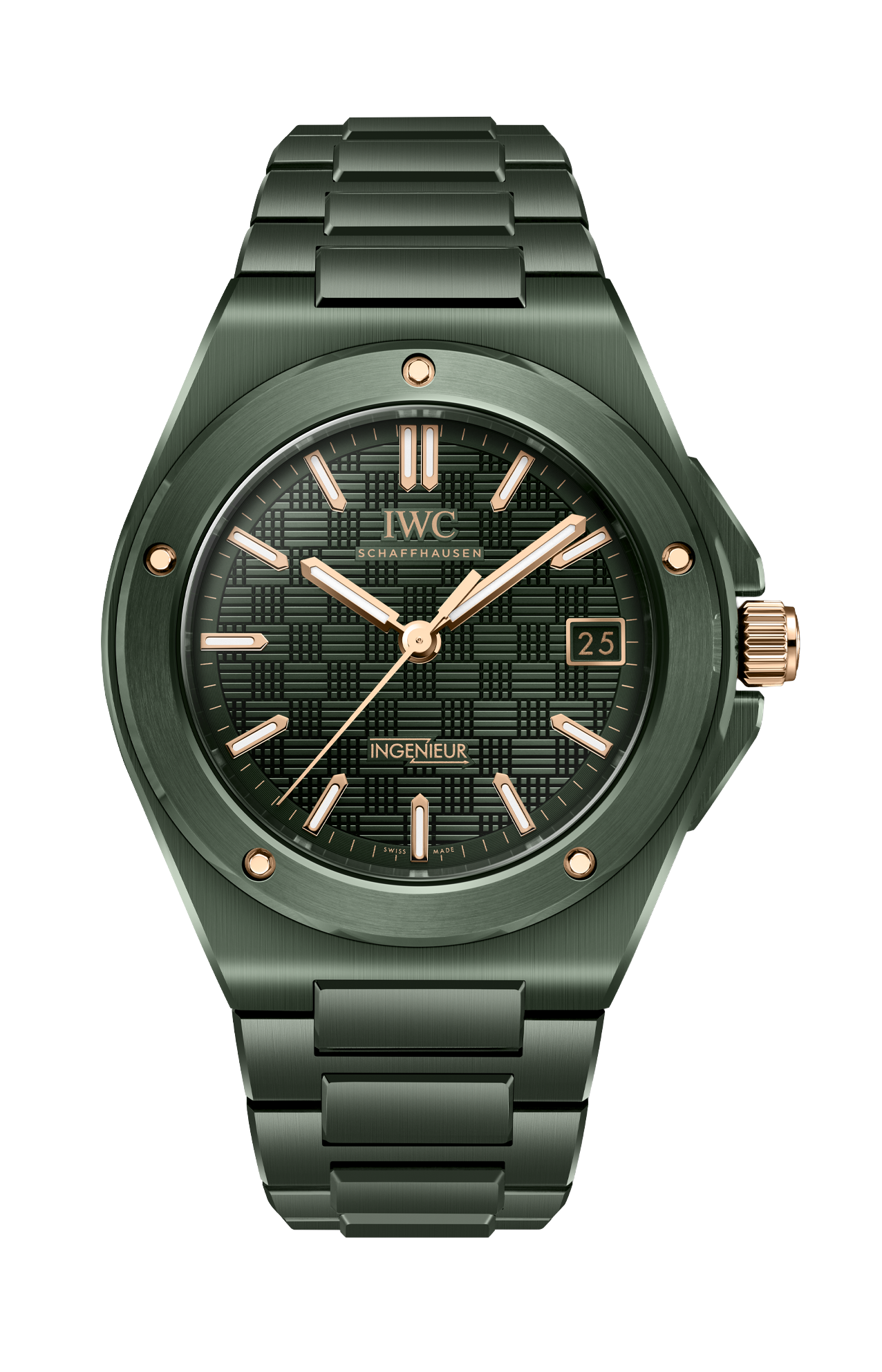 L’Ingenieur Automatic 42 combina il design con bracciale integrato derivato da Gérald Genta a una sorprendente interpretazione in ceramica verde oliva scuro.