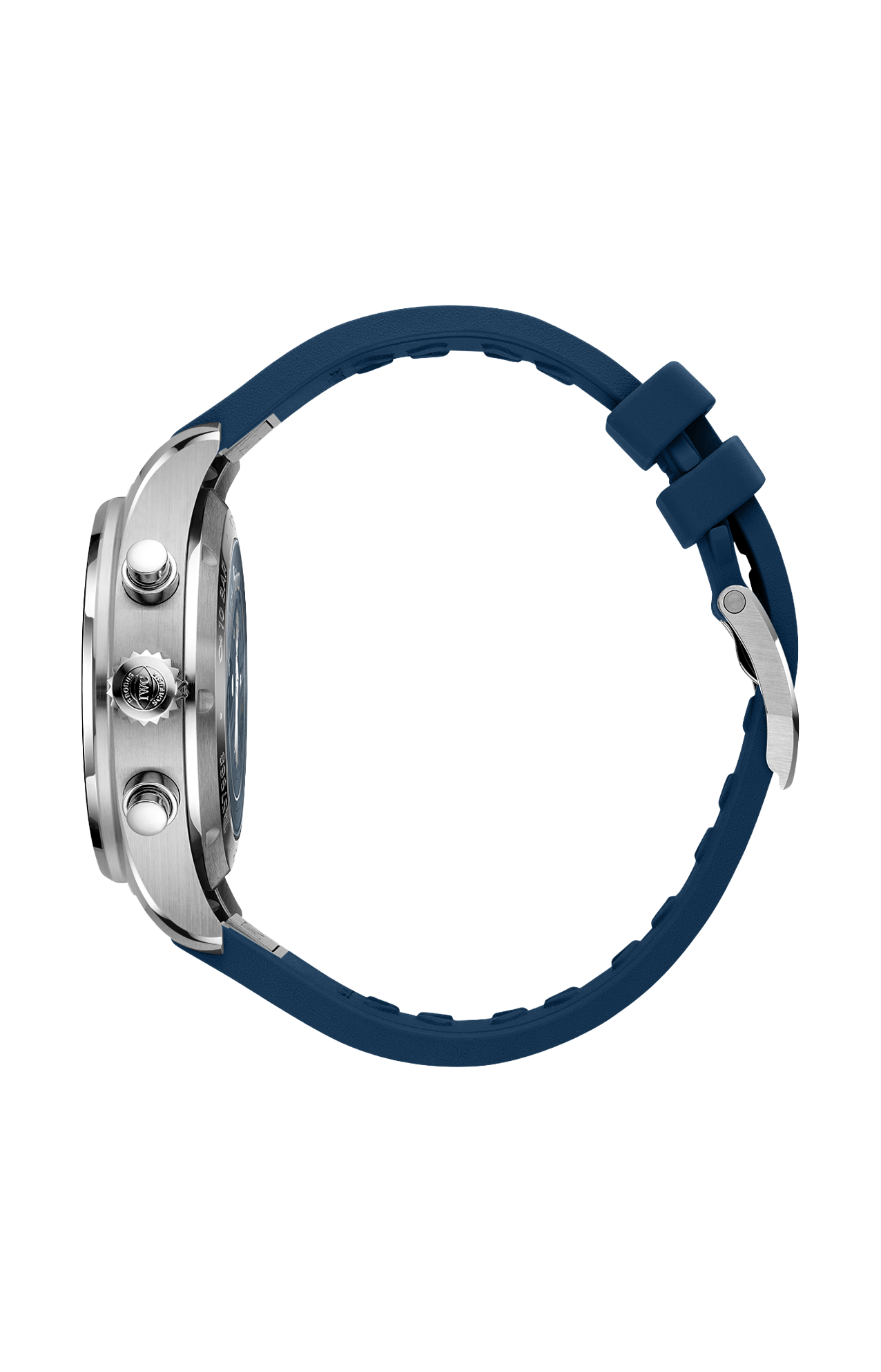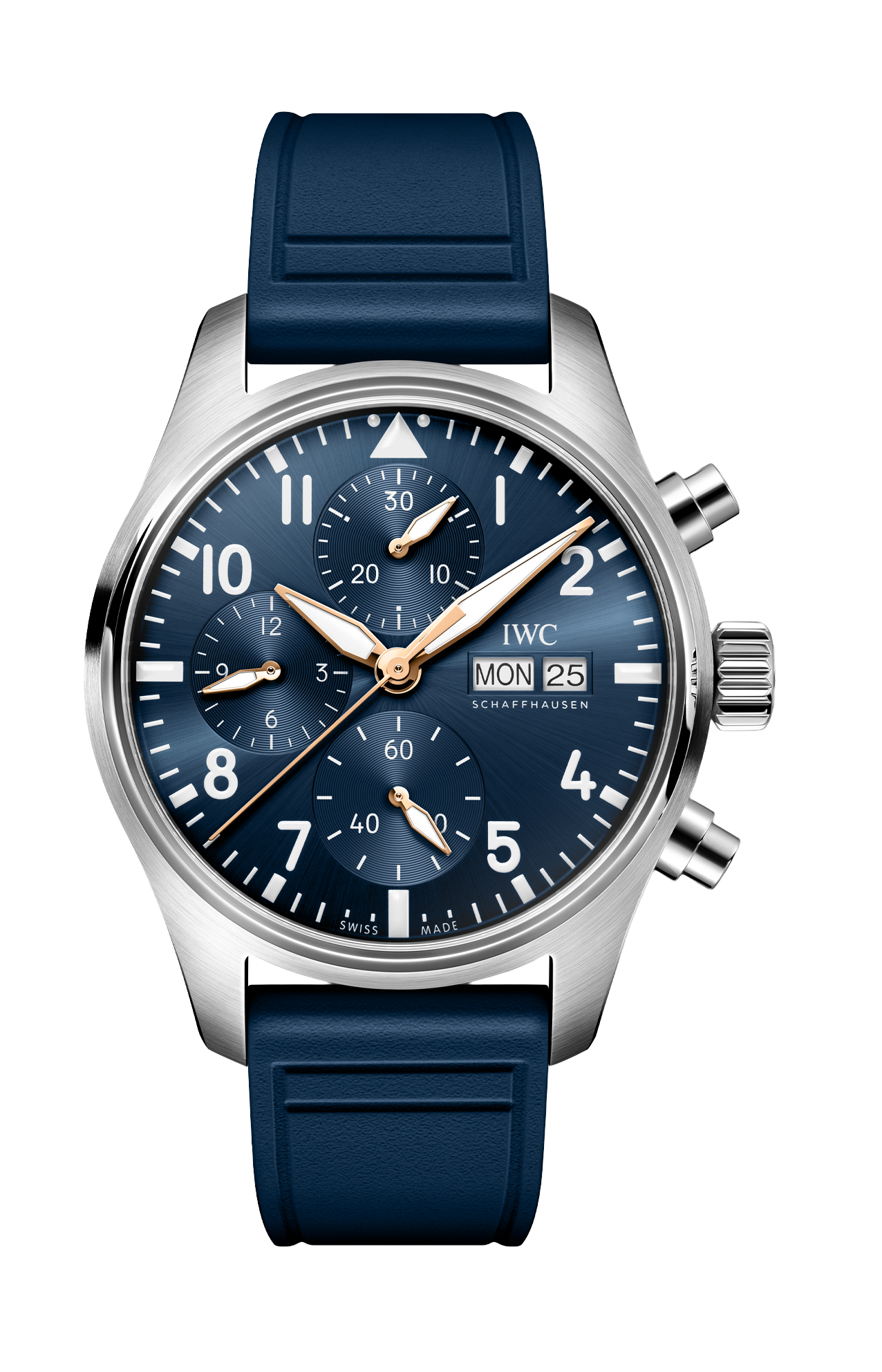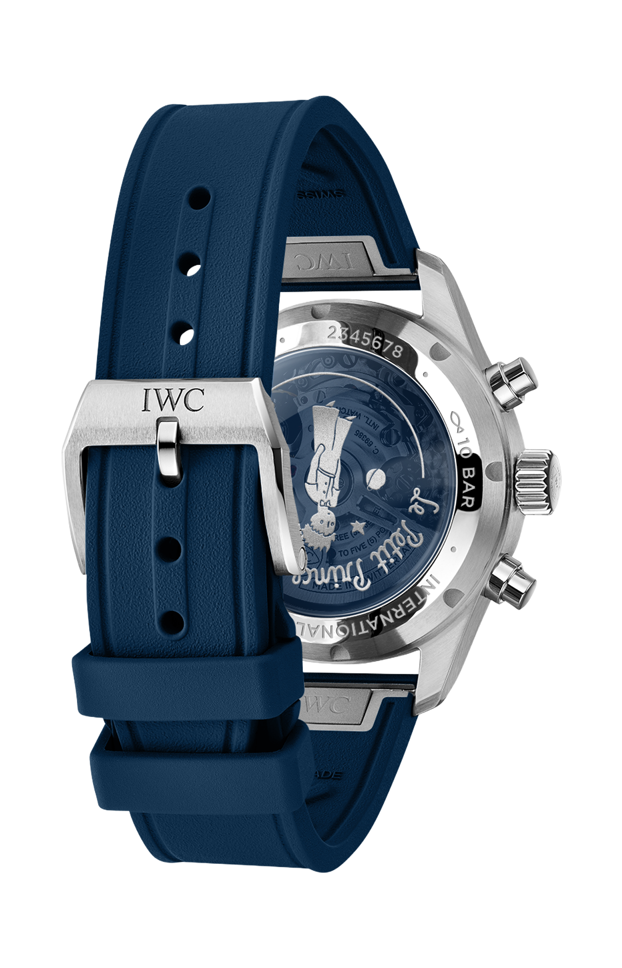 Il Pilot’s Watch Chronograph 41 Le Petit Prince coniuga la leggendaria tradizione degli orologi da pilota di IWC Schaffhausen con la magia dell’intramontabile racconto di Saint-Exupéry. Ispirata al Piccolo Principe, questa edizione speciale unisce funzionalità e ingegneria a un design poetico. La cassa in acciaio inossidabile misura 41 millimetri di diametro e crea un sorprendente contrasto con il quadrante blu intenso con finitura soleil, caratteristico di queste edizioni. Numeri e indici bianchi, insieme a lancette placcate oro riempite di Super-LumiNova®, conferiscono all’orologio un’estetica sportiva e raffinata allo stesso tempo. Il fondello in vetro zaffiro colorato rivela una delicata raffigurazione del Piccolo Principe, circondata dall’incisione “Le Petit Prince”, un pianeta e due stelle. A muovere il Pilot’s Watch Chronograph 41 Le Petit Prince è il calibro meccanico cronografico 69385 di manifattura IWC, un movimento cronografico meccanico caratterizzato da un classico design con ruota a colonne e da una riserva di carica di 46 ore. Il cinturino è realizzato in resistente caucciù blu e può essere sostituito con facilità grazie al pratico sistema EasX-CHANGE®, semplicemente premendo un bottone.