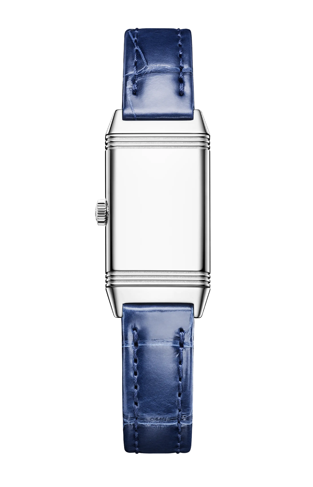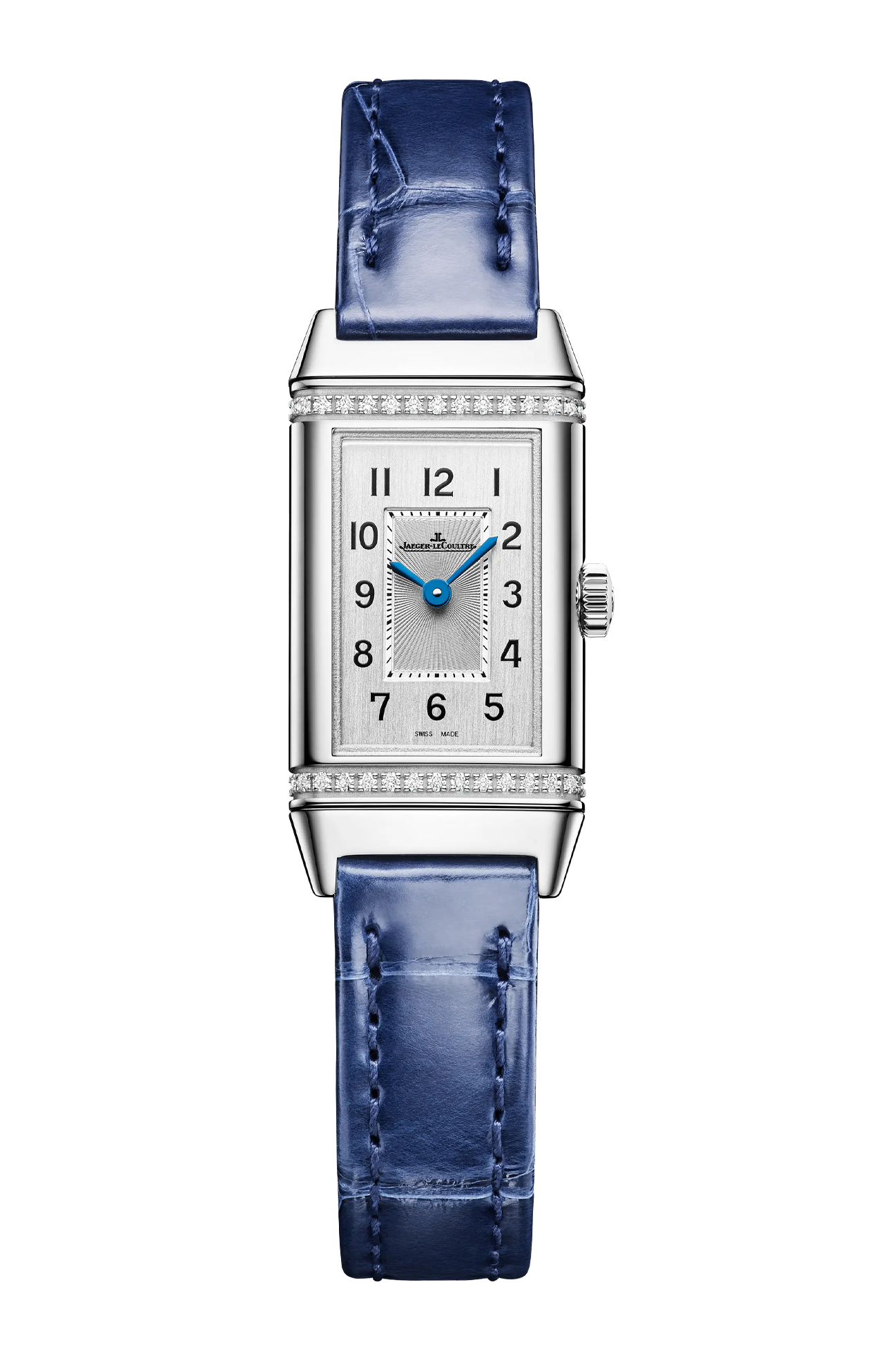 Ispirato alle dimensioni dei primi orologi Reverso da donna degli anni ’30, il Reverso Classic Monoface Origin presenta una raffinata silhouette rettangolare di 32,5 x 16,3 mm. Il quadrante di colore argento sfoggia un doppio motivo distintivo: un delicato guilloché al centro e una finitura spazzolata verticale sul bordo esterno. La superficie è adornata da dodici numeri arabi, mentre le lancette azzurrate richiamano il cinturino in pelle di alligatore blu. Le emblematiche scanalature della cassa sono impreziosite da diamanti, che aggiungono un tocco di alta gioielleria. Il segnatempo è animato da un movimento al quarzo estremamente preciso, che indica ore e minuti. Fedele allo spirito del Reverso, il secondo lato è una tela per incisioni personali.
