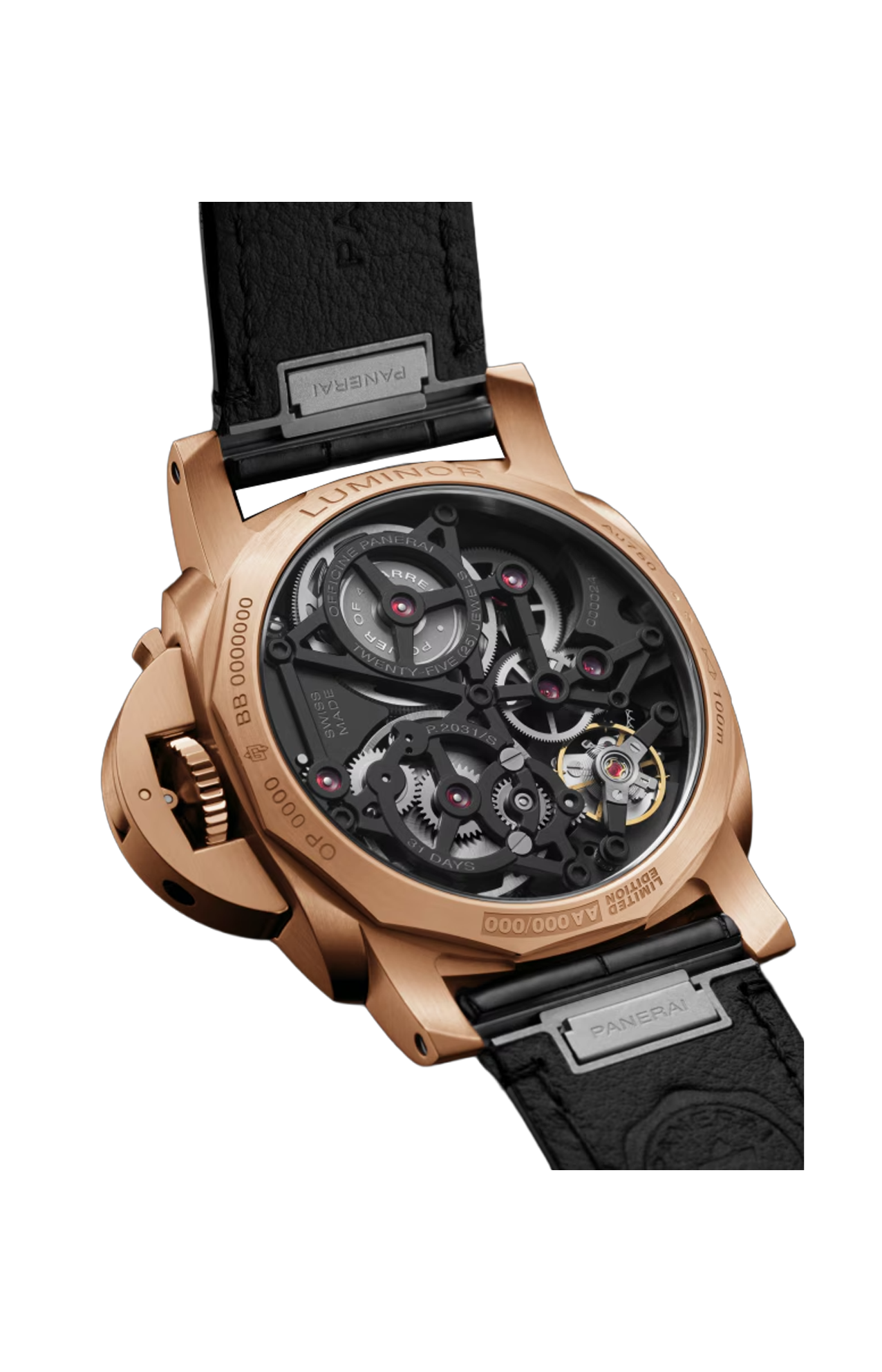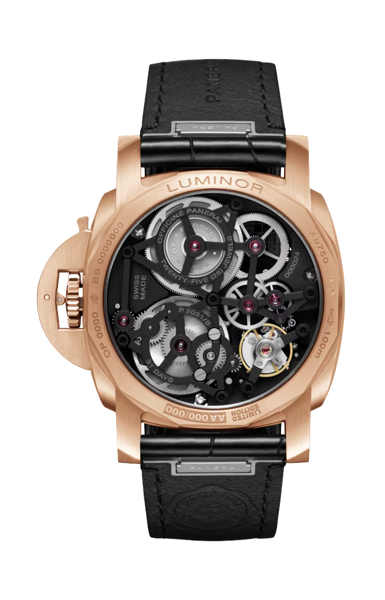 L’orologio è animato dal nuovo movimento scheletrato a carica manuale P.2031/S, che offre una riserva di carica di 31 giorni grazie a quattro bariletti in serie contenenti 3,3 metri di molle motrici. Composto da 276 componenti e 25 rubini, il calibro offre un’elevata efficienza energetica e affidabilità, e necessita di solo 128 giri di corona per garantire un’autonomia di un mese.